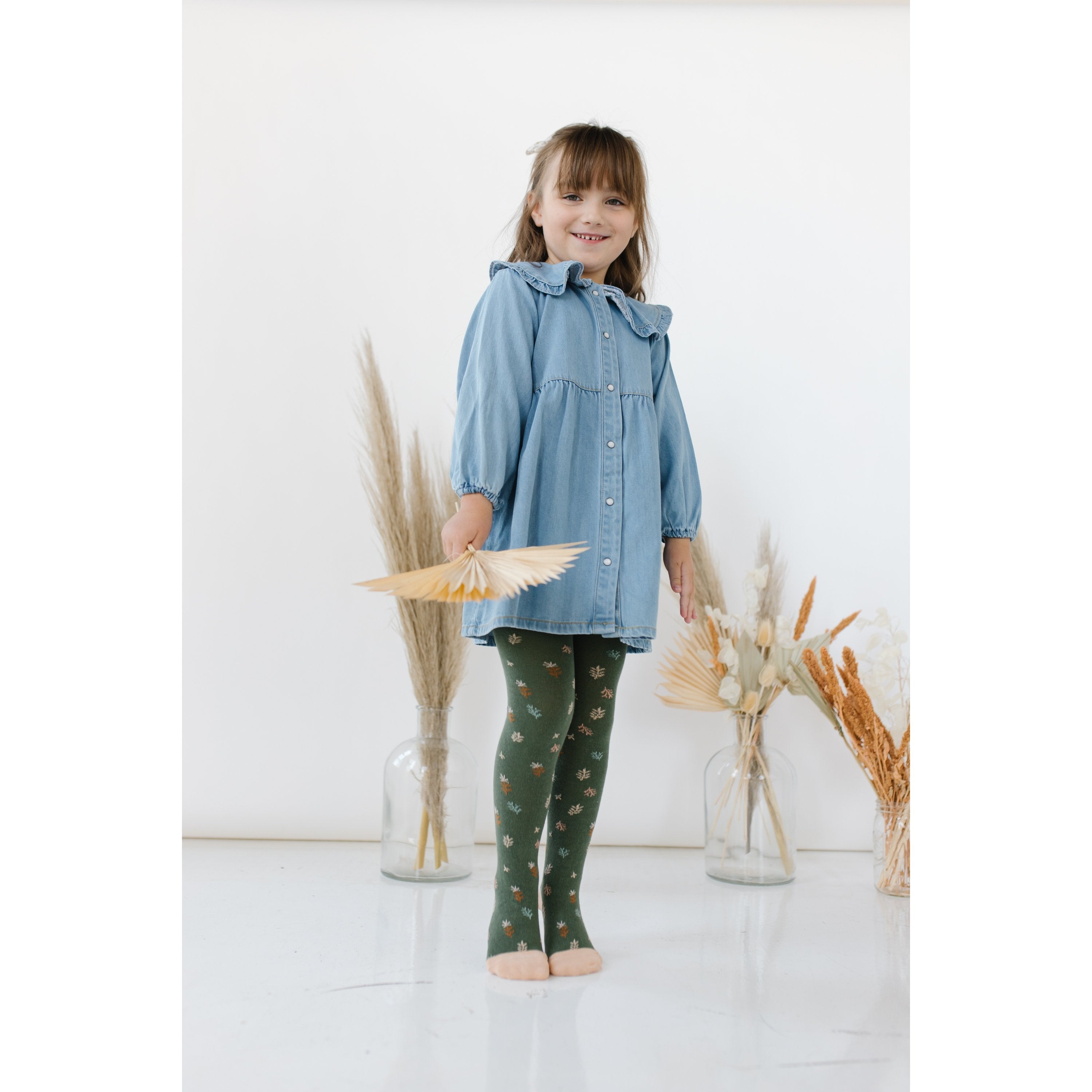A cotton moss coloured tight with various fall leaves and floral prints.