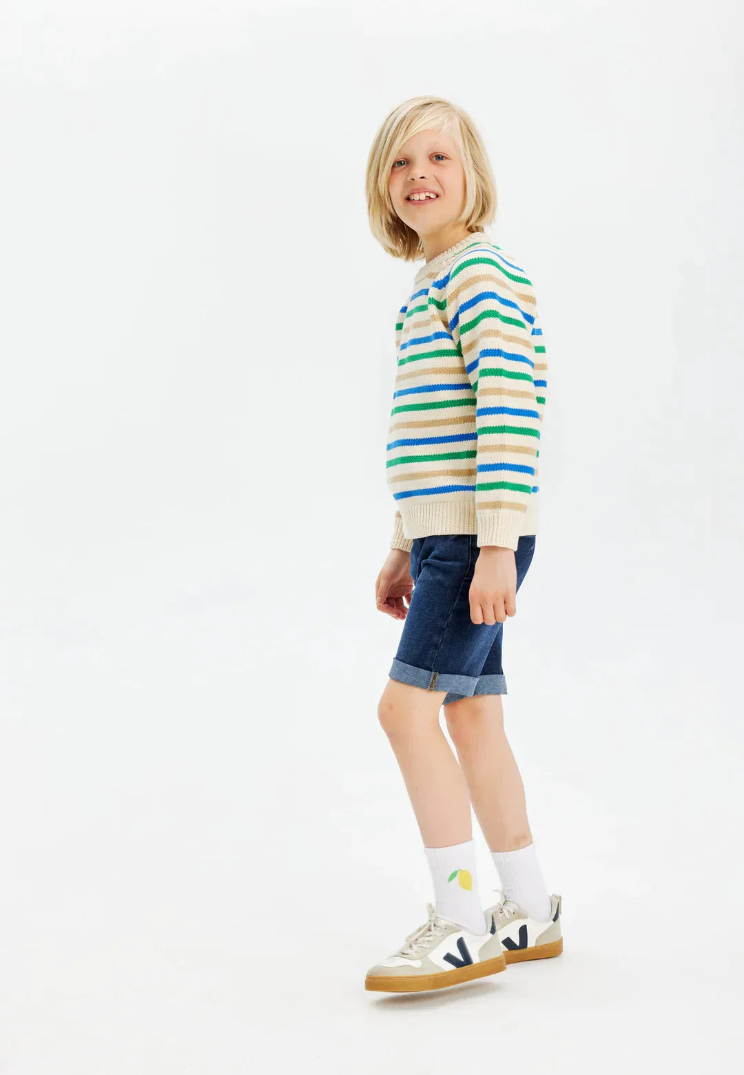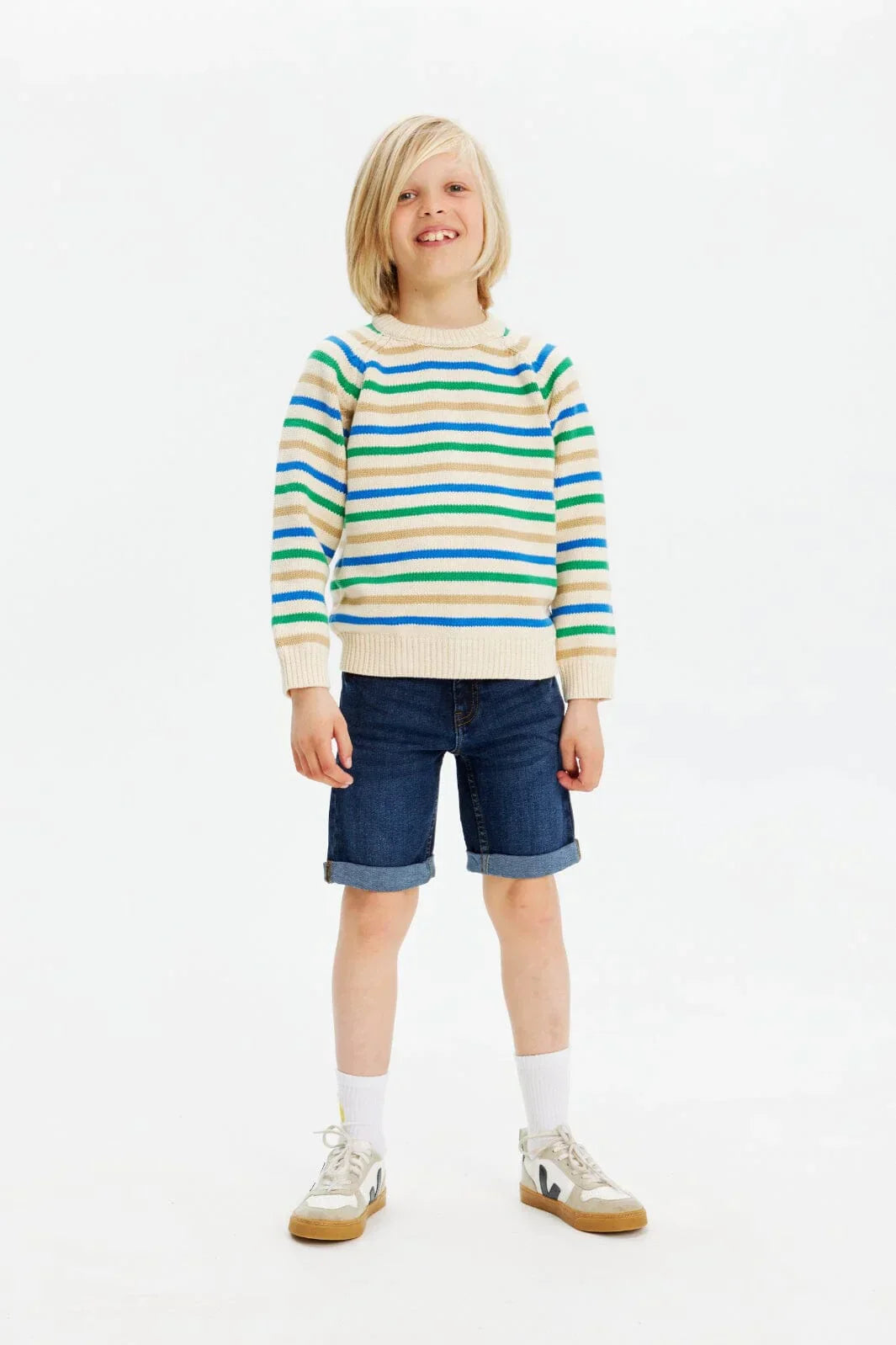 A classic denim short from THE NEW in dark blue denim with a slightly grown-out look. These shorts can be adjusted at the waist with an internal elastic, and they opens at the front with a hook and zipper. At the trouser legs, there are nice folds. The Shorts have open pockets both at the front and at the back, as well as practical belt loops around the waist and a coin pocket