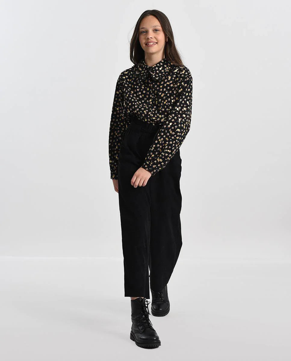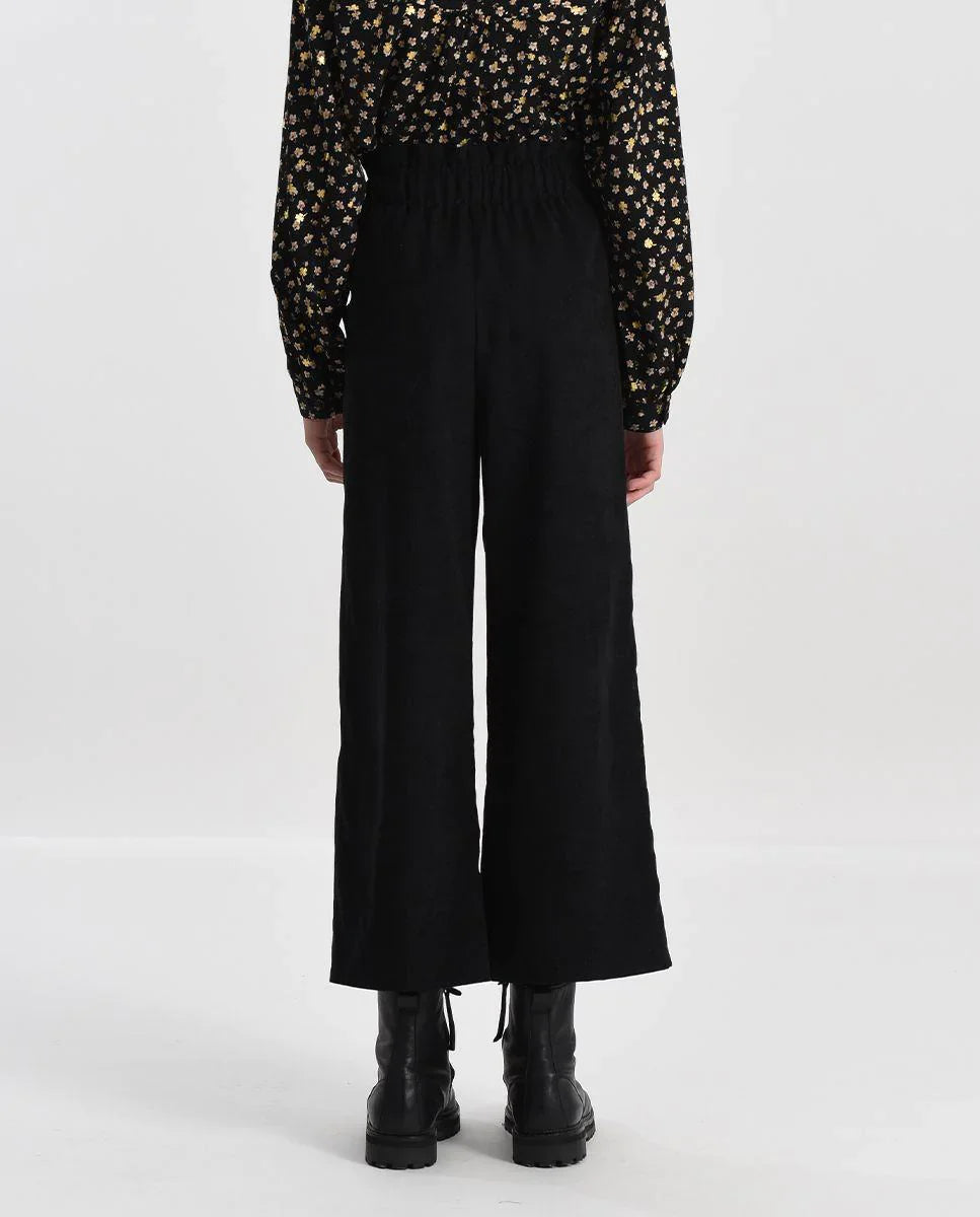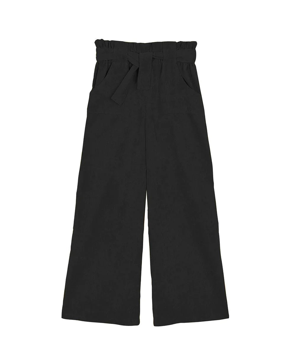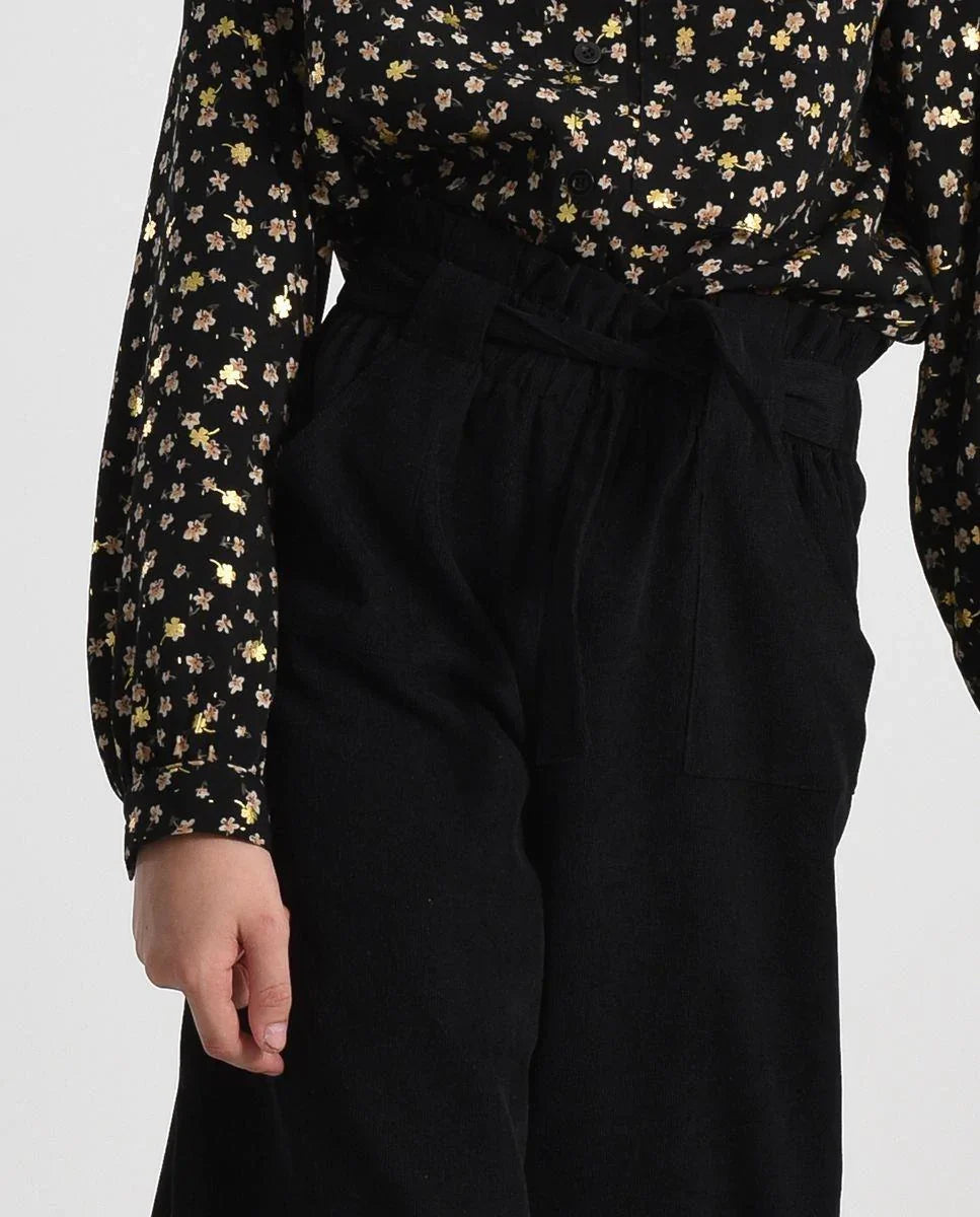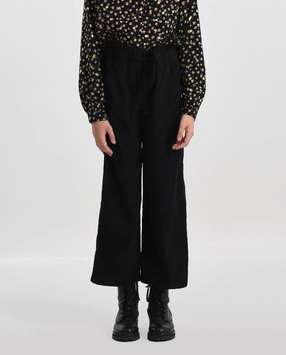 Super cool pair of modern trousers for your little mini. Velvet pants, paperbag waist with sash to tie, regular silhouette, side pockets. So rad.