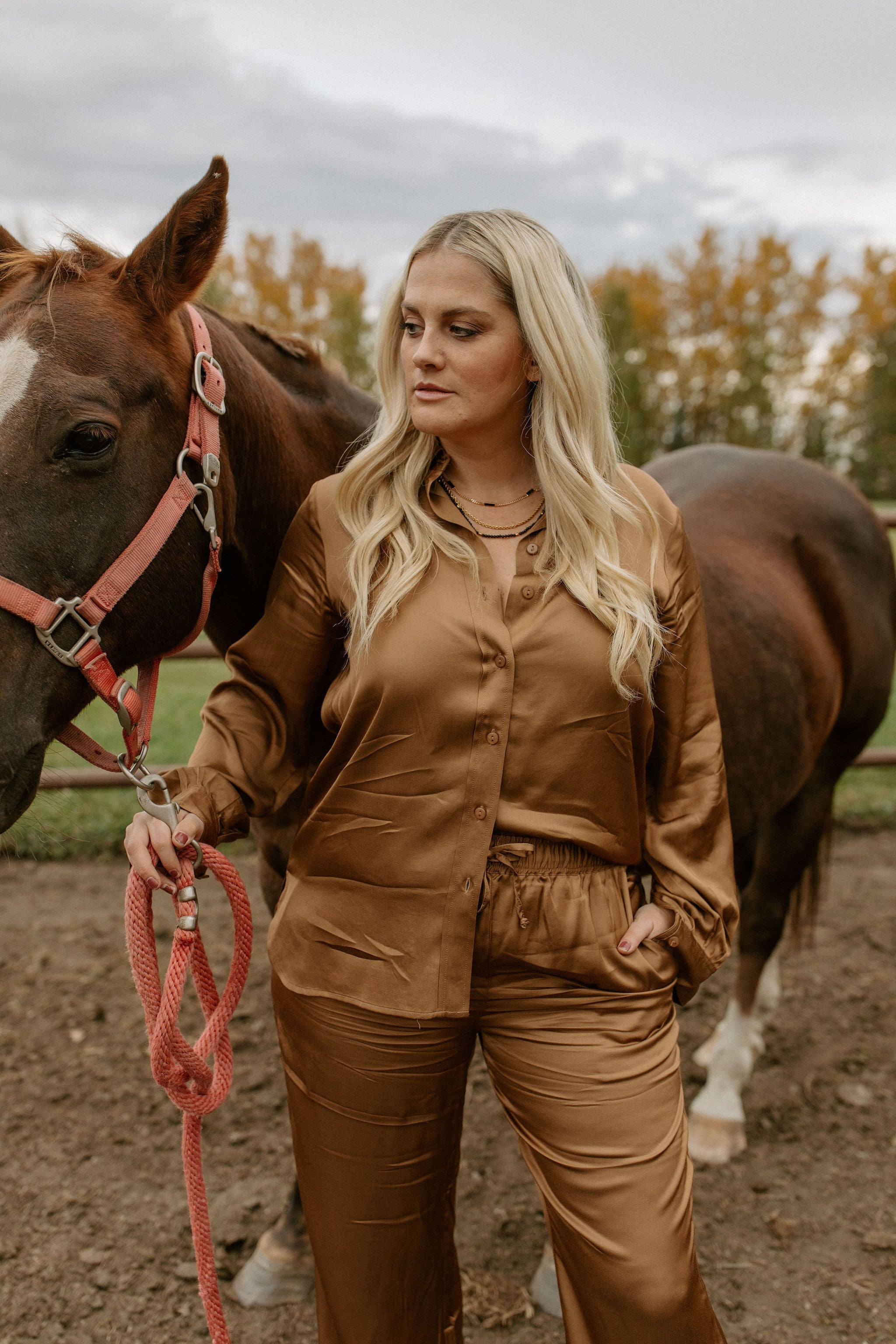 Day and night, satin emanates its elegance in a classy Toasted coconut brown tone. Flowy and comfortable.