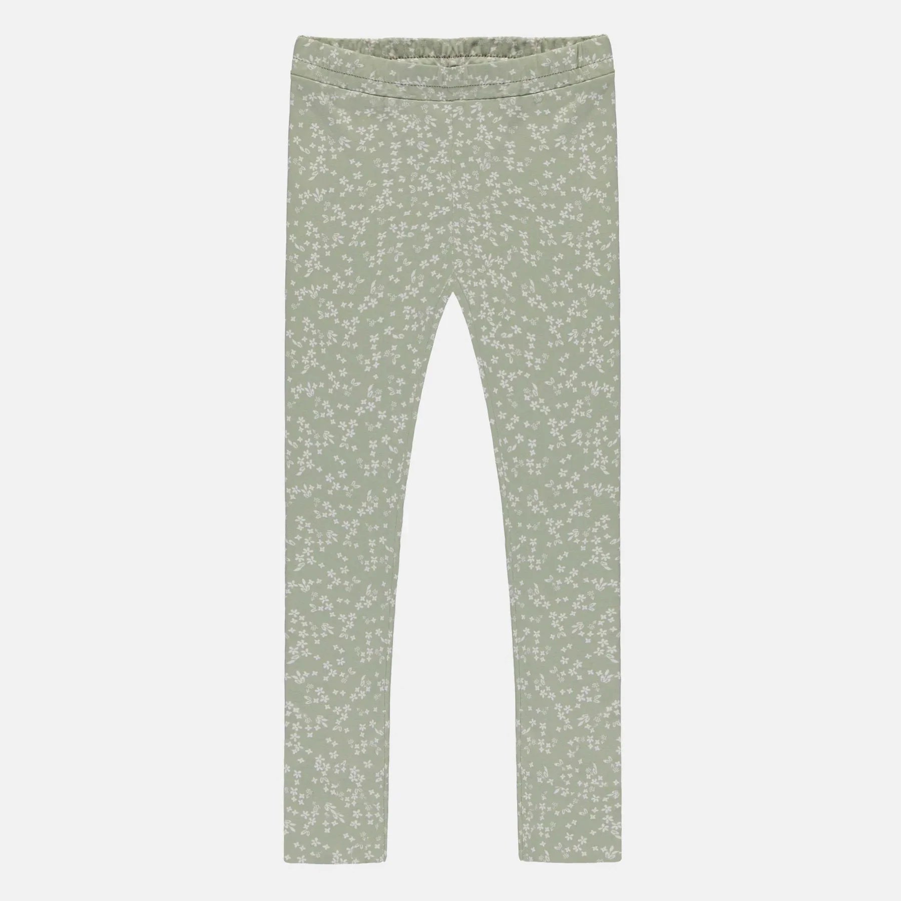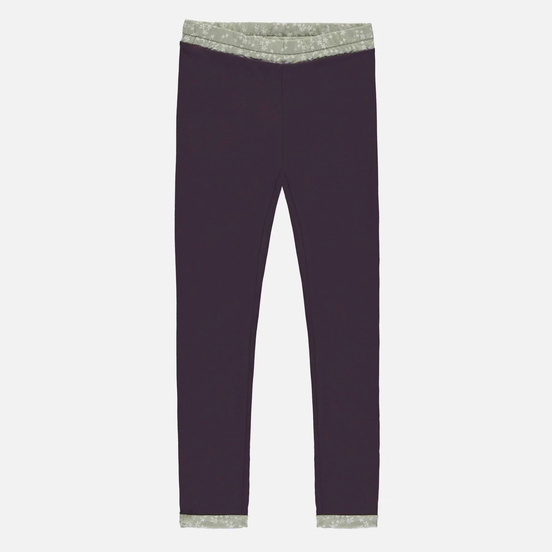 Reversible leggings in green stretch cotton jersey with minis flowers on one side and plain plum on the other.