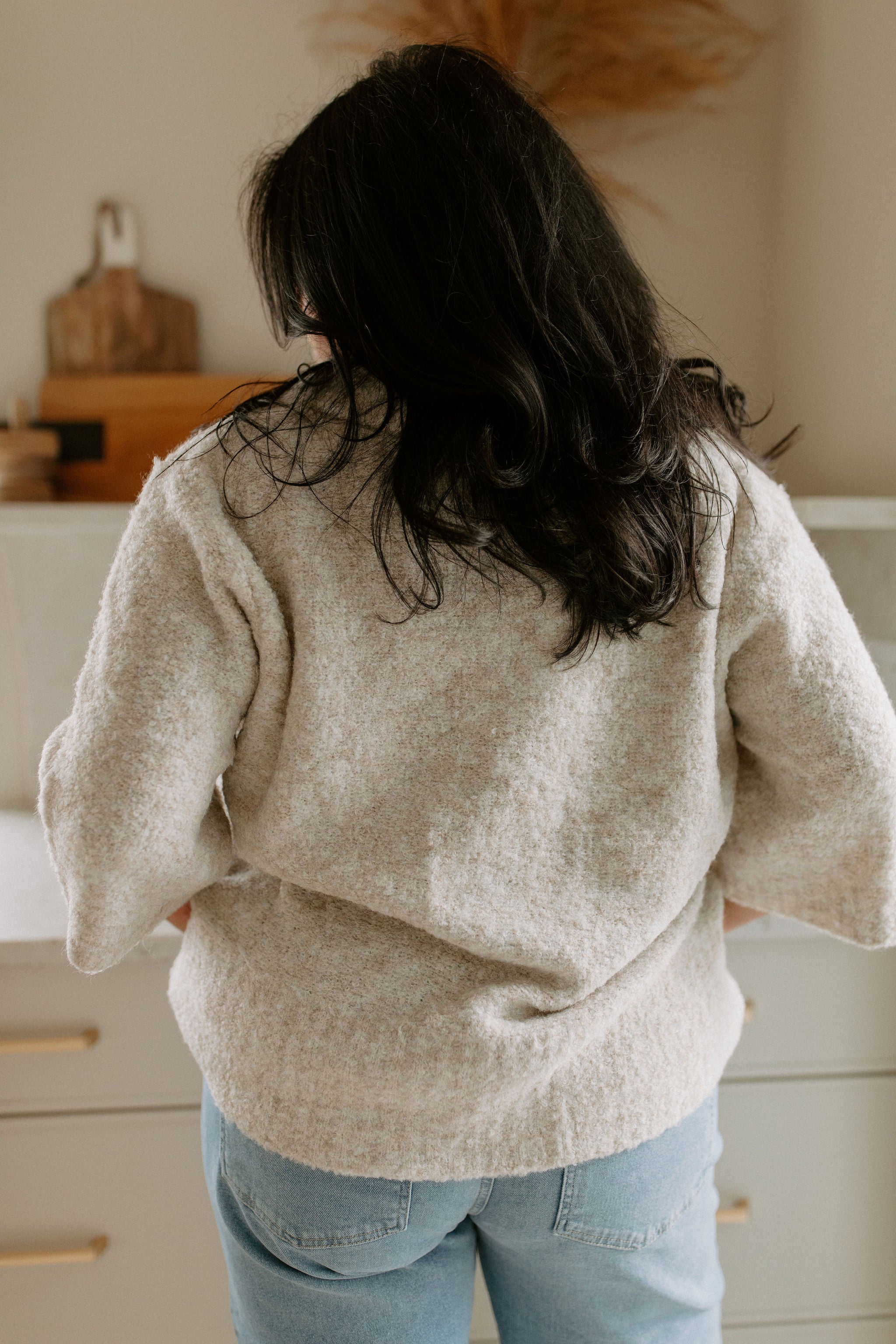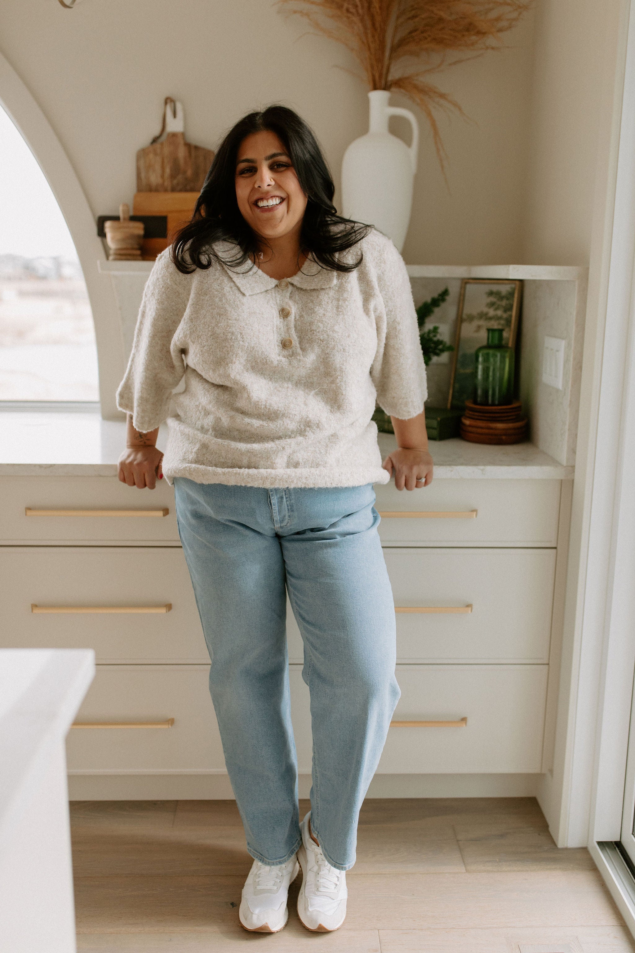 Meet our newest friend, Tori, a nostalgic nod to vintage sophistication with a contemporary twist. Crafted from a luxurious boucle knit fabric, this top exudes timeless elegance and comfort. The collared neckline and three-button placket add a classic polo-style touch, while the elbow-length sleeves offer a hint of retro charm. Delicate ribbing detail on the sleeve cuffs and bottom hem adds texture and dimension, elevating the overall aesthetic. Despite its vintage-inspired feel, this top is lightweight and breathable, making it perfect for transitional weather or layering. The fuzzy texture of the boucle knit adds an extra element of coziness and warmth, ensuring you feel as stylish as you are comfortable.