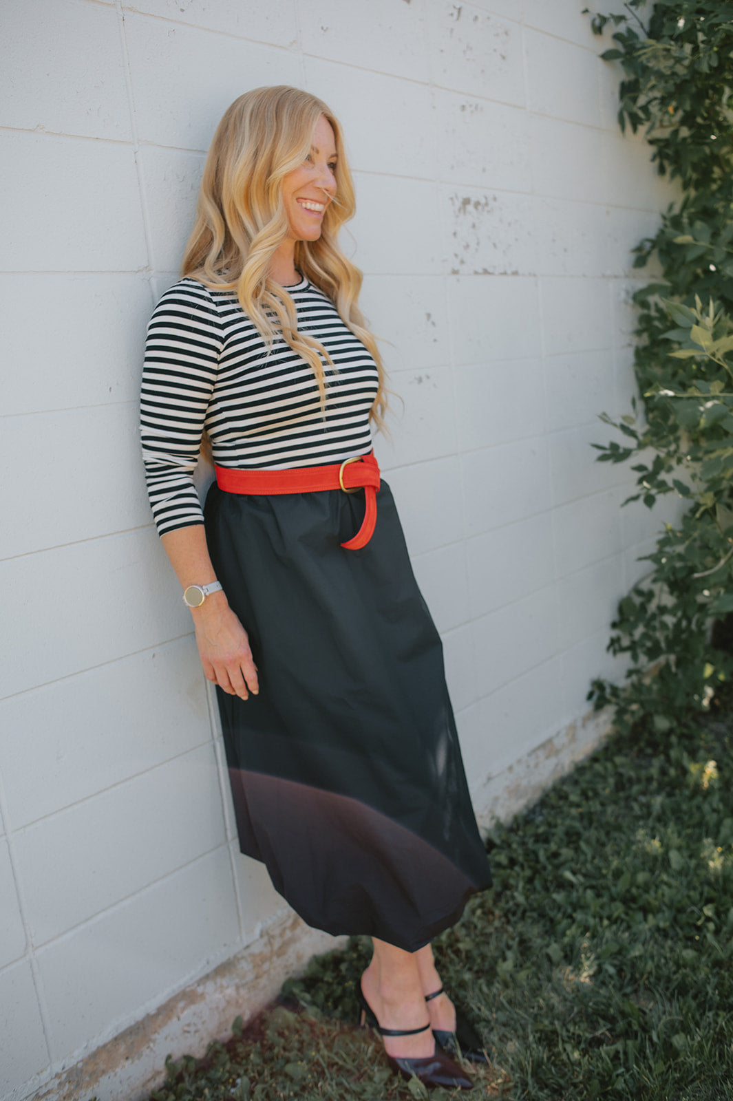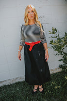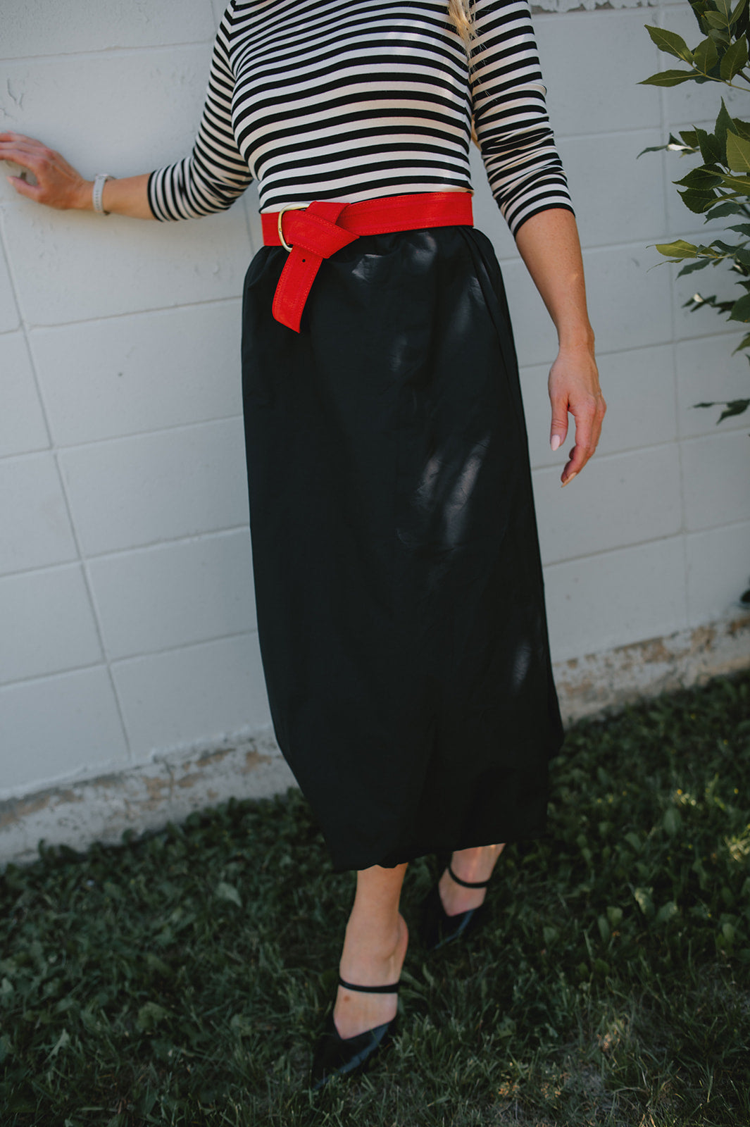 • Elevated Edge: Dress up the skirt with a tucked-in blouse or a sleek bodysuit. Add some heeled ankle boots or fashionable loafers for a more elevated and confident look suitable for a casual evening out or a special event.