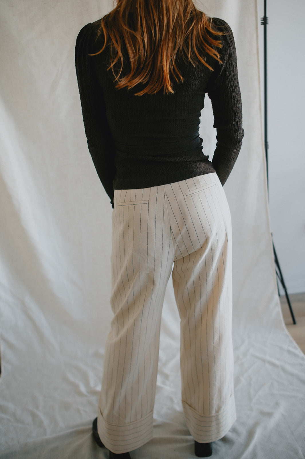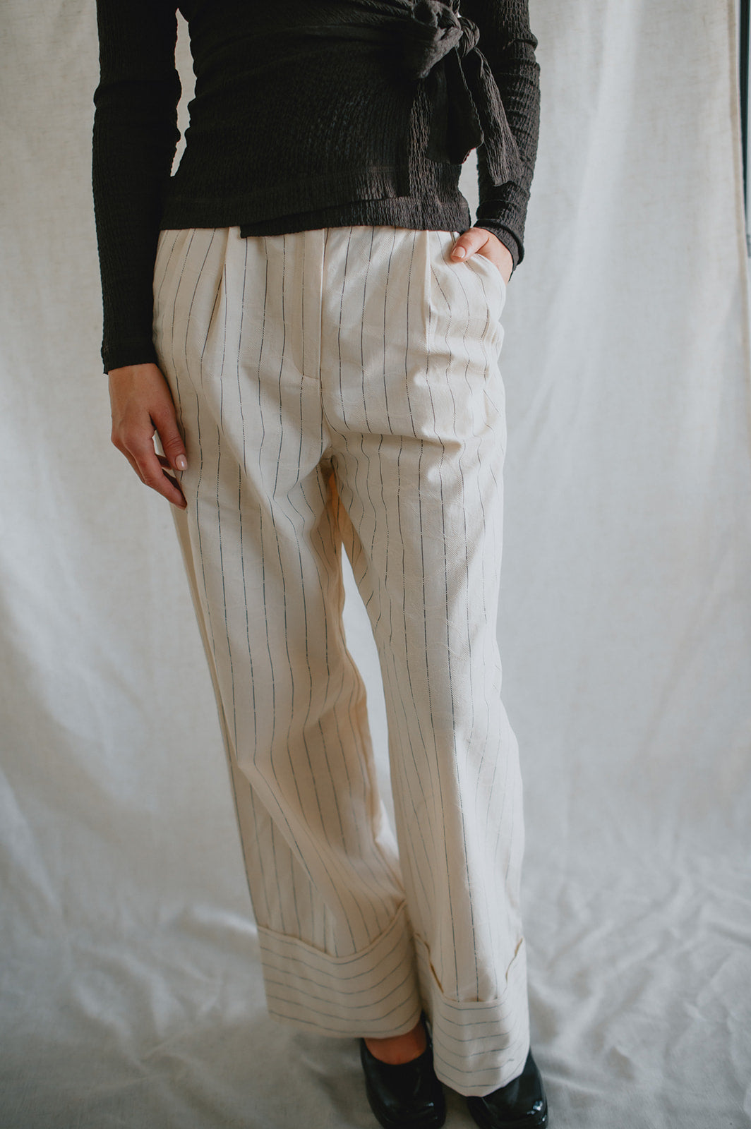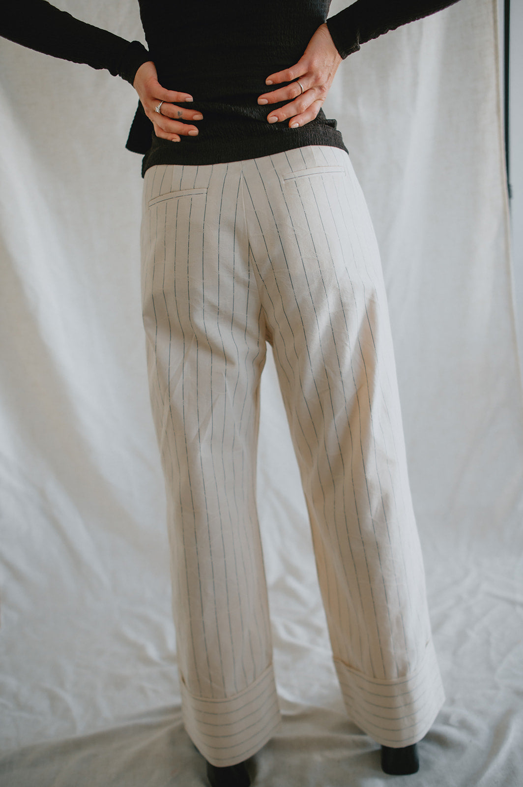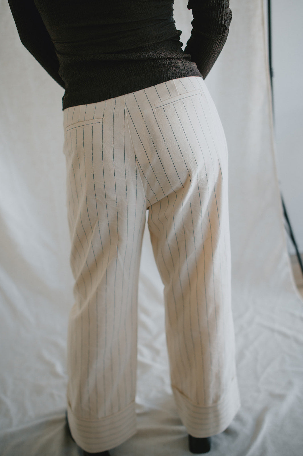 Introducing the Pia pant, from thick woven jacquard fabric for a luxurious feel. The wide-leg cut, front pleats, and large lapels add a touch of sophistication. With two side slip pockets, two back pockets, and a hidden closure, these pants are both stylish and functional. The high waist, vertical pinstripe, and horizontal cuff detail complete the elevated look.