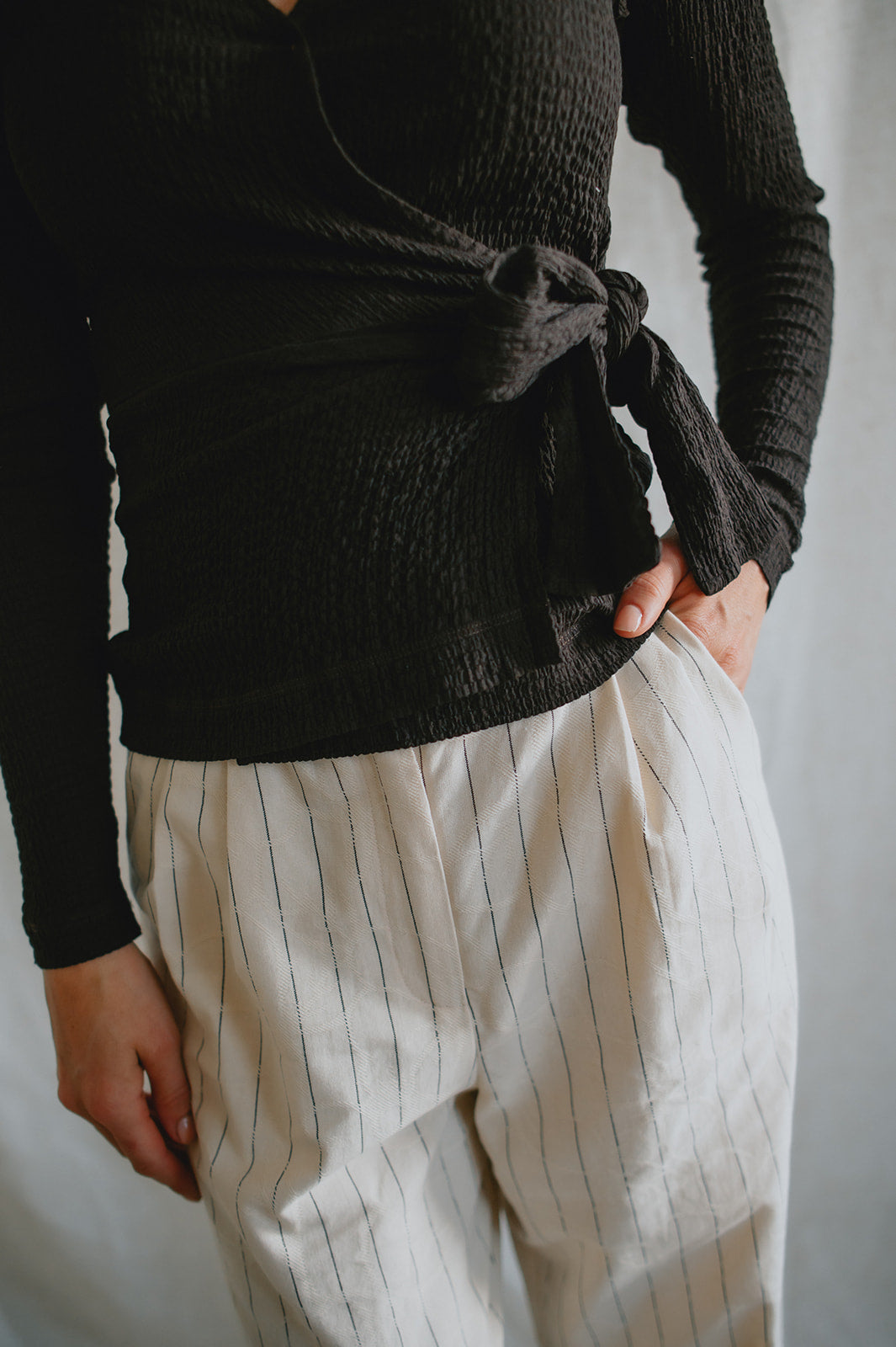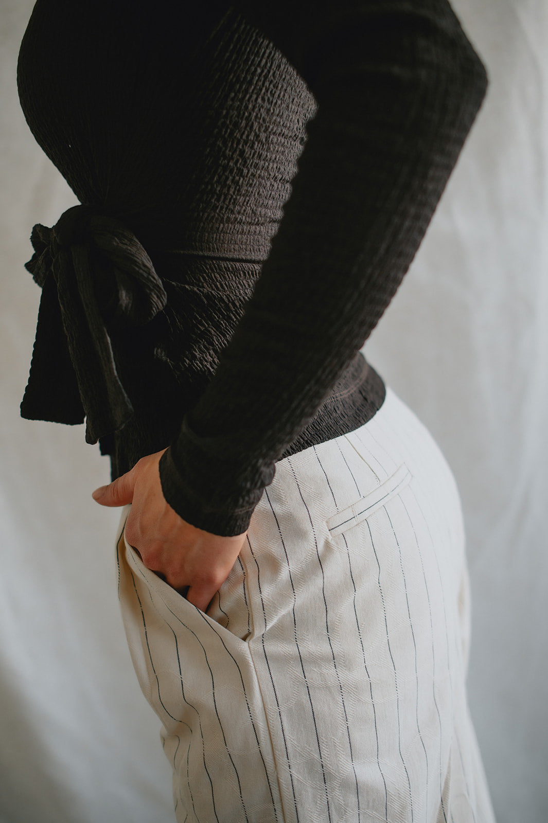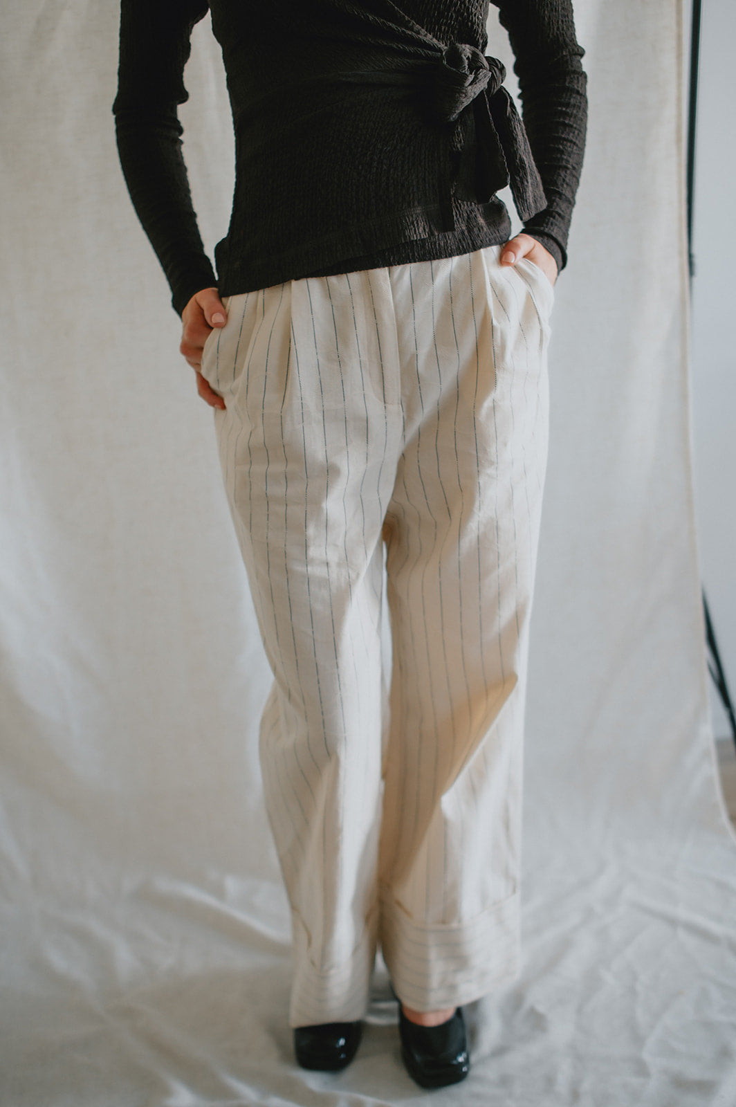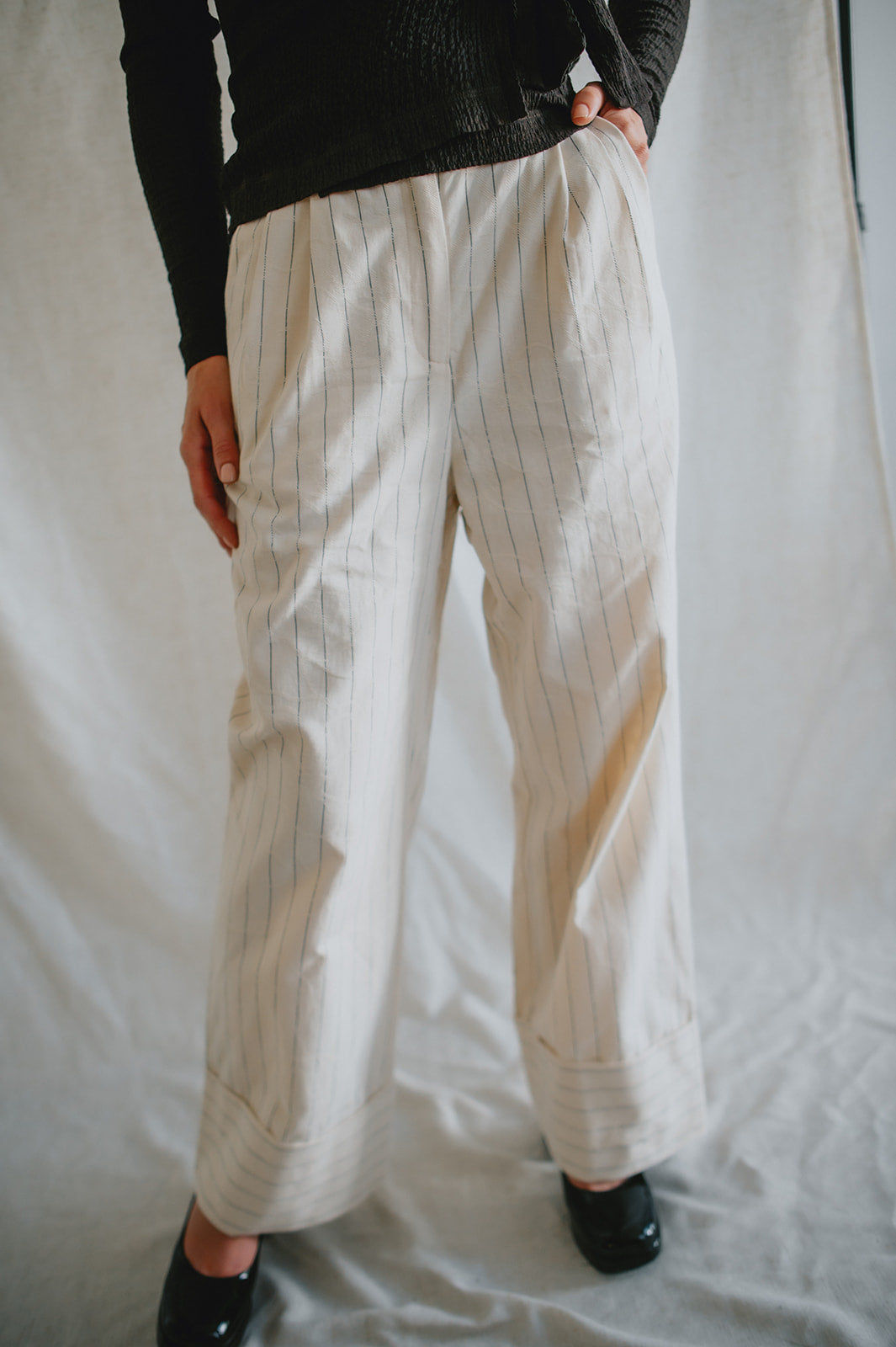 Introducing the Pia pant, from thick woven jacquard fabric for a luxurious feel. The wide-leg cut, front pleats, and large lapels add a touch of sophistication. With two side slip pockets, two back pockets, and a hidden closure, these pants are both stylish and functional. The high waist, vertical pinstripe, and horizontal cuff detail complete the elevated look.