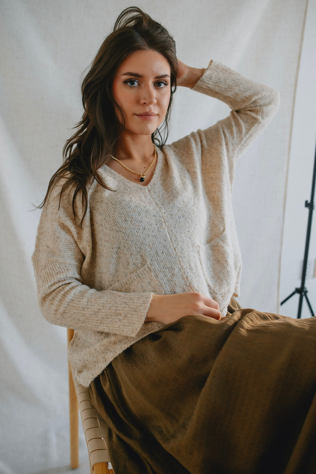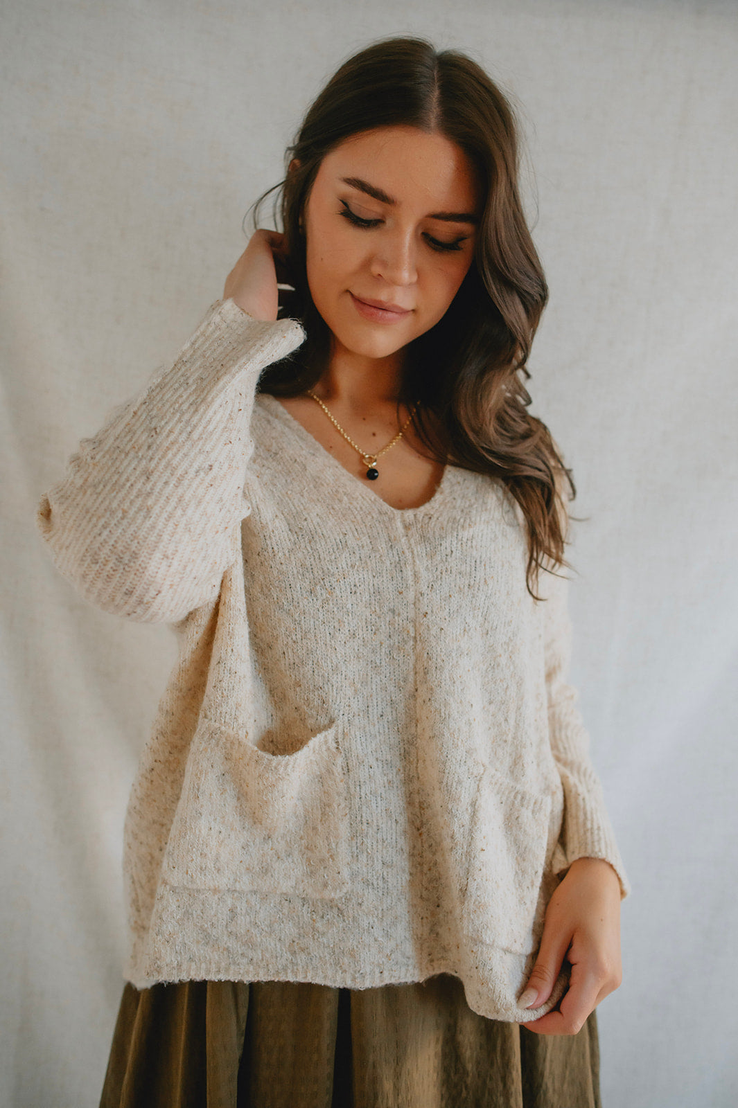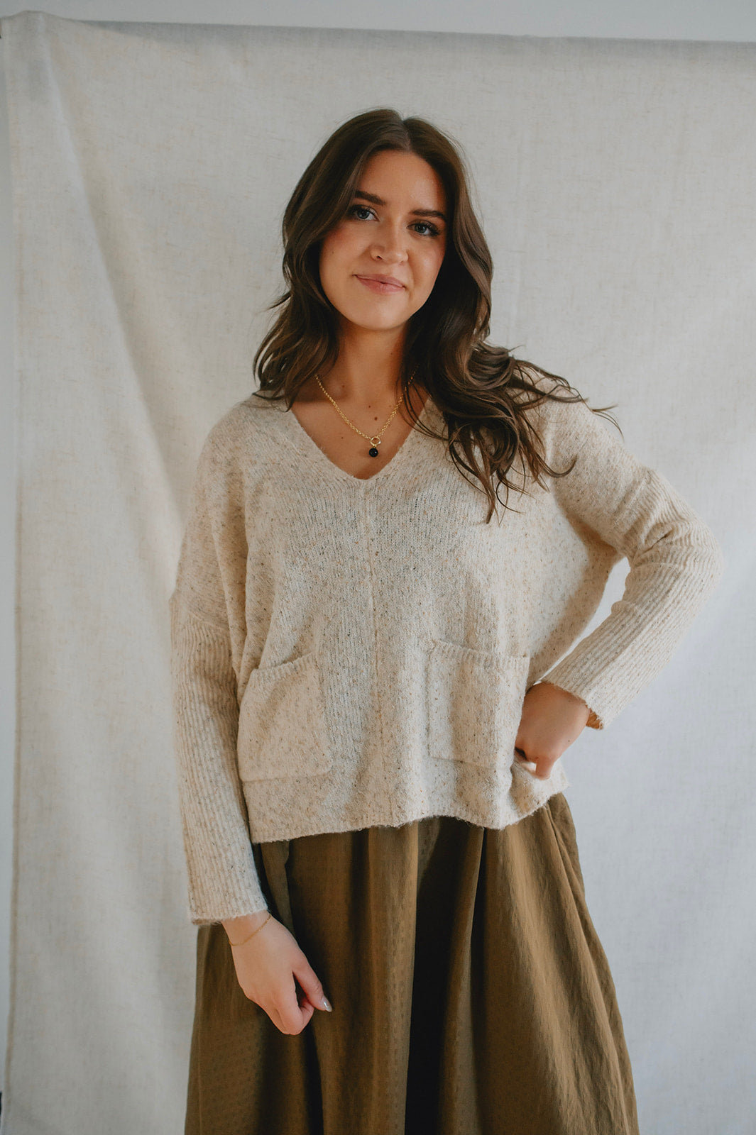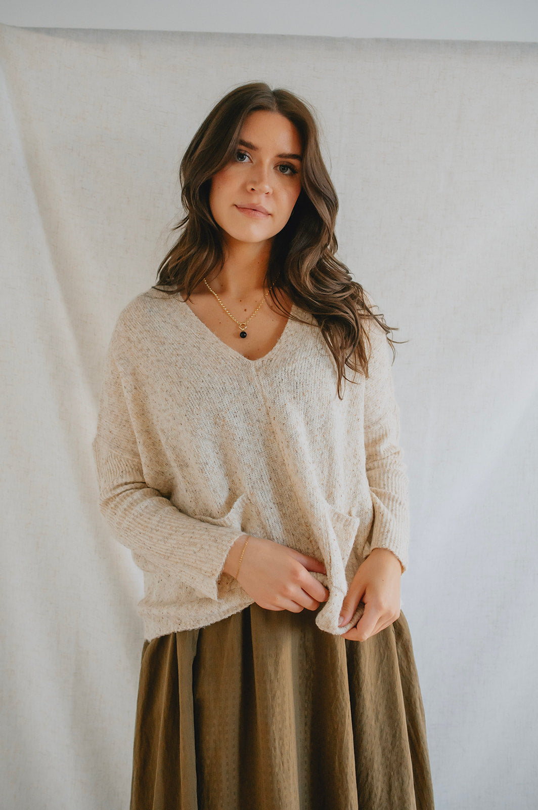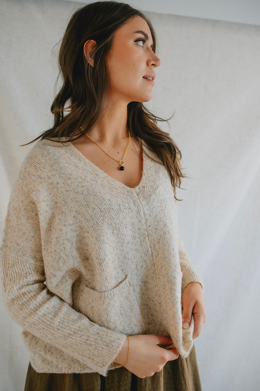 This sweater is one of the comfiest things you will ever wear. The oversized fit, v-neck, and touch of spandex make her feel so soft and light. We love the speckled look and the front pockets.