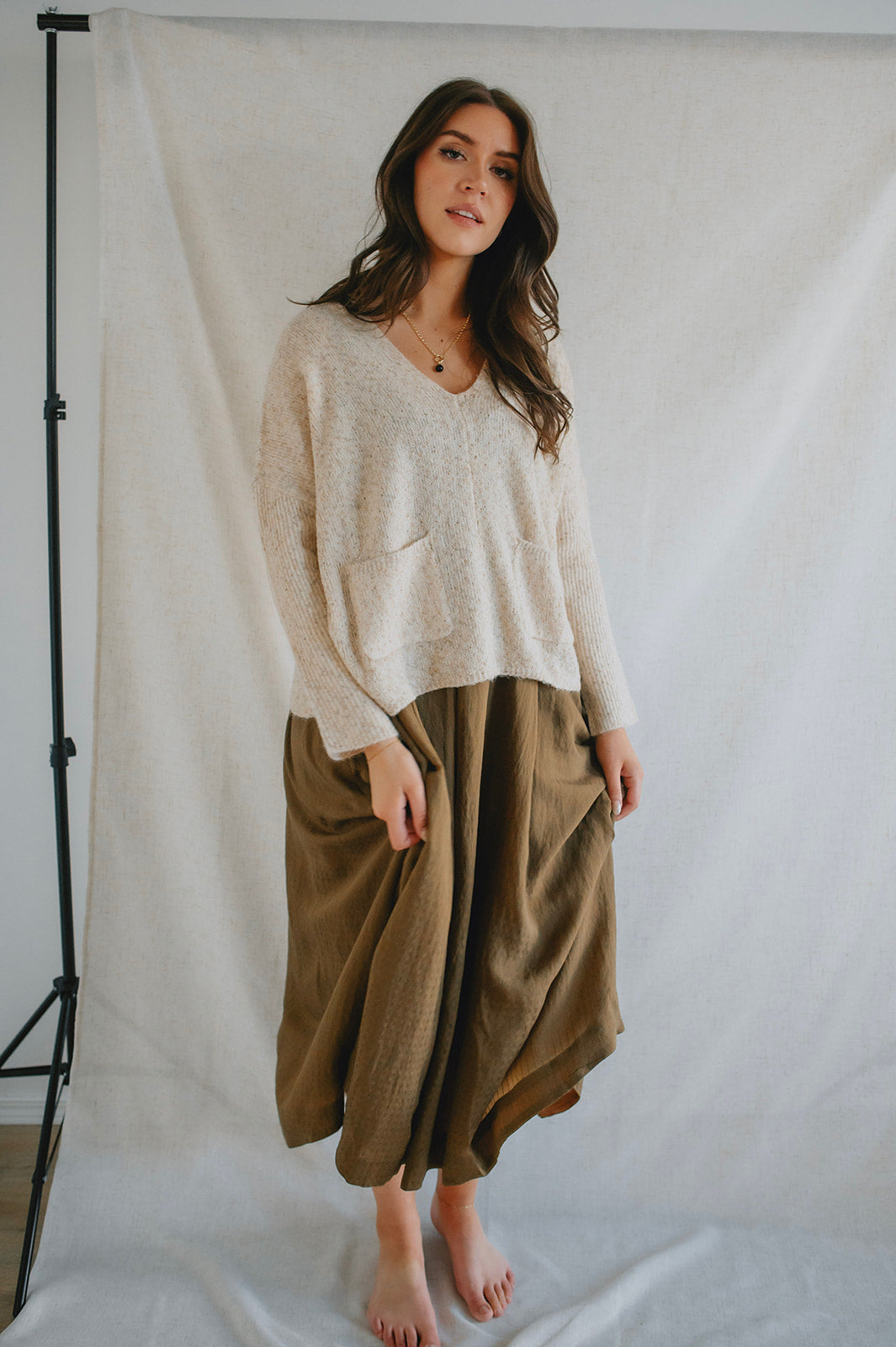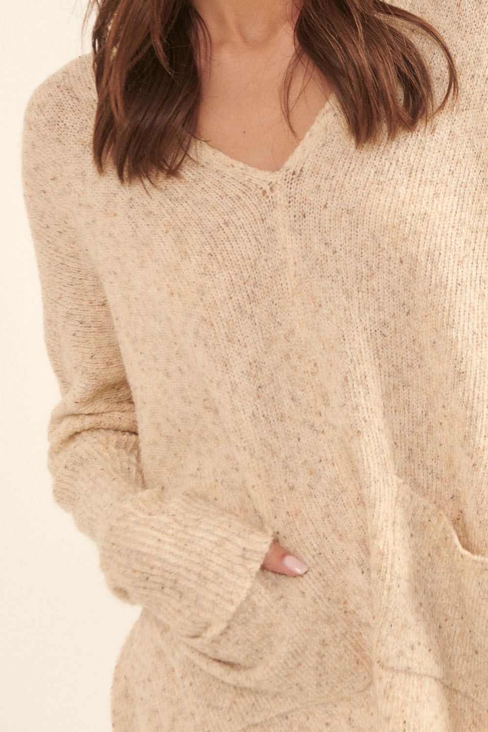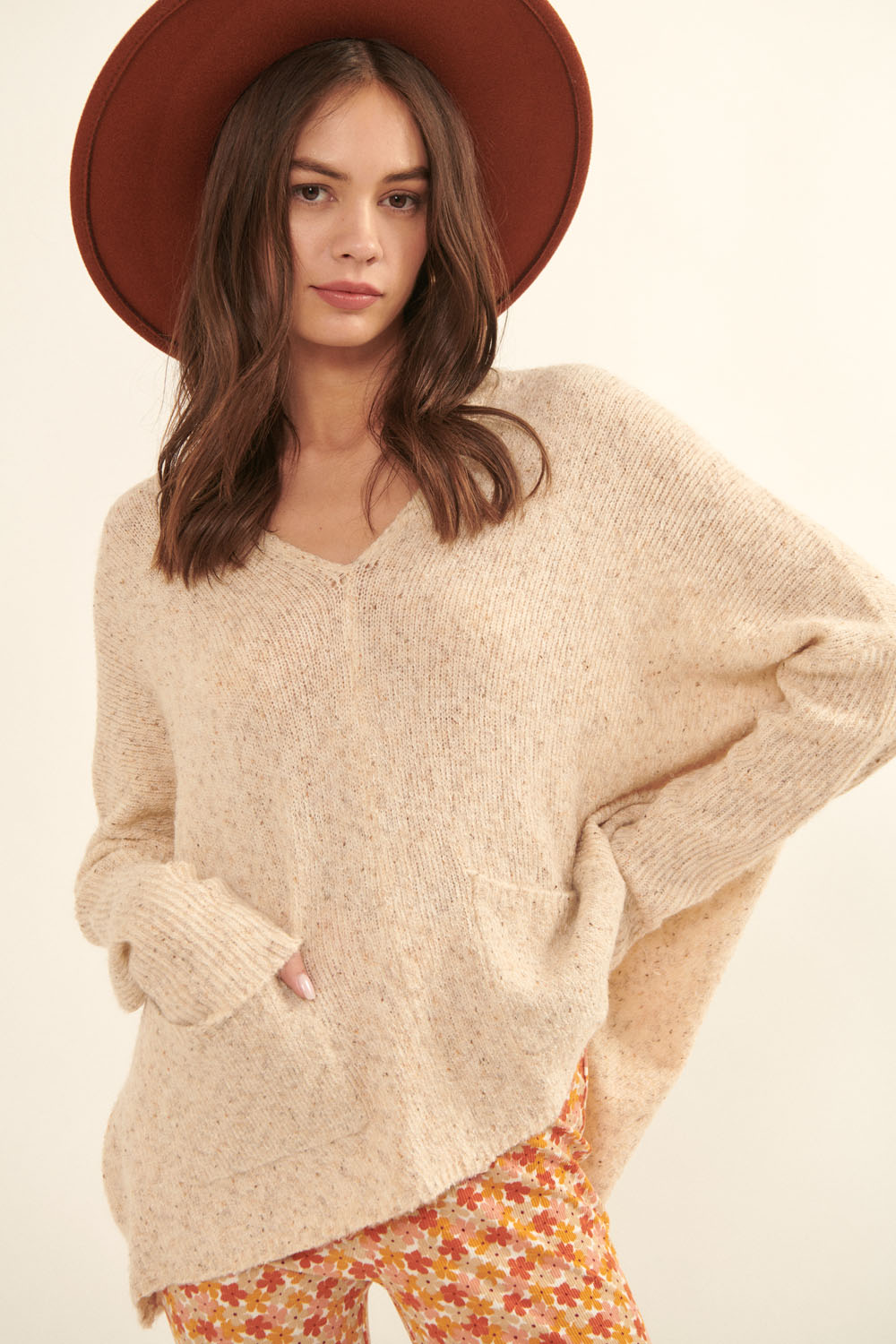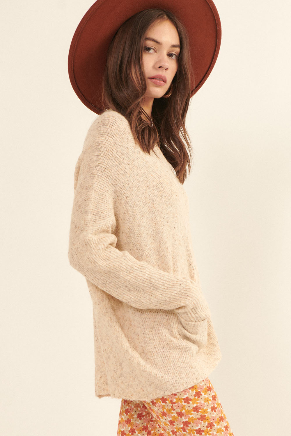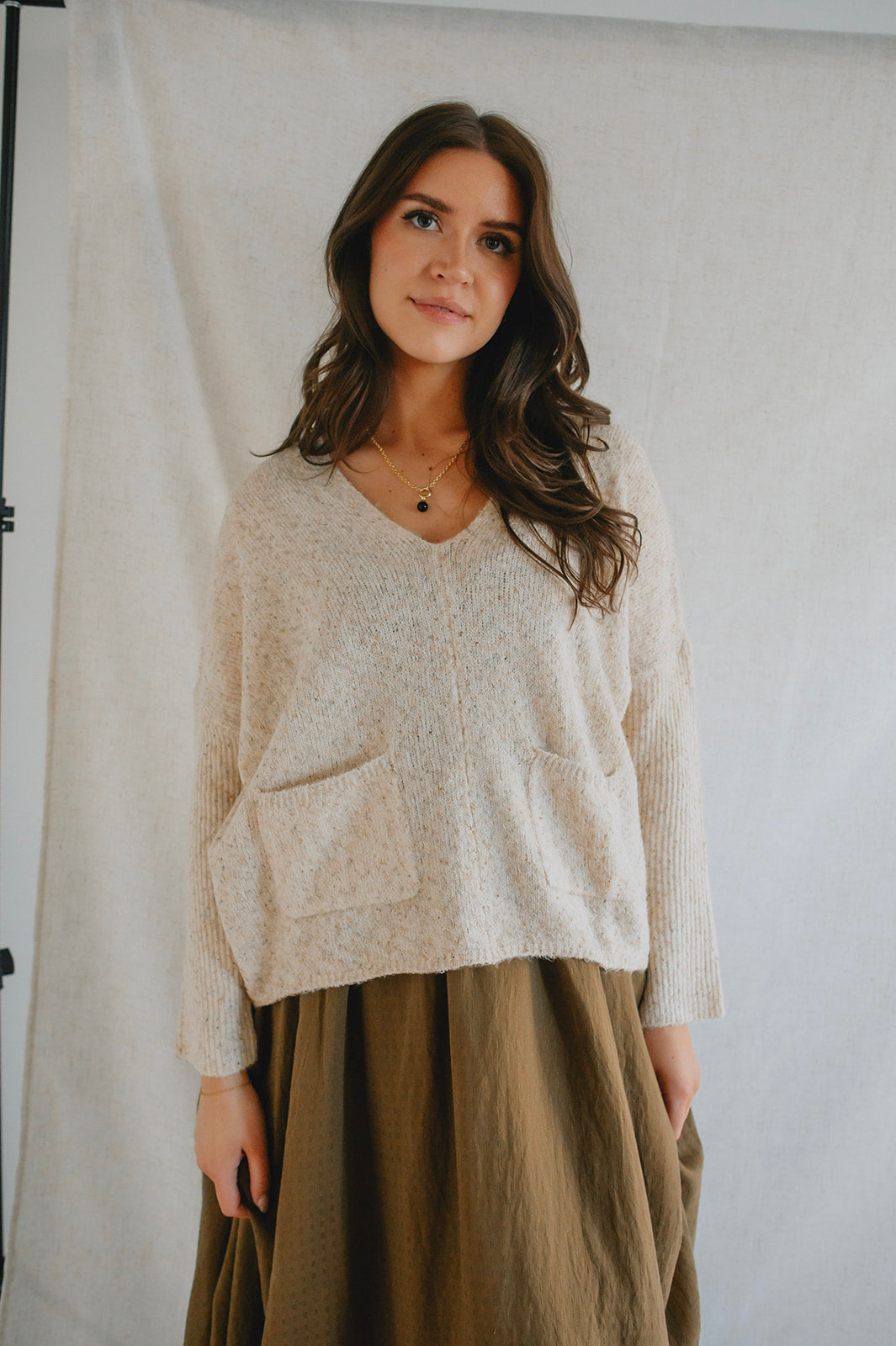 This sweater is one of the comfiest things you will ever wear. The oversized fit, v-neck, and touch of spandex make her feel so soft and light. We love the speckled look and the front pockets.