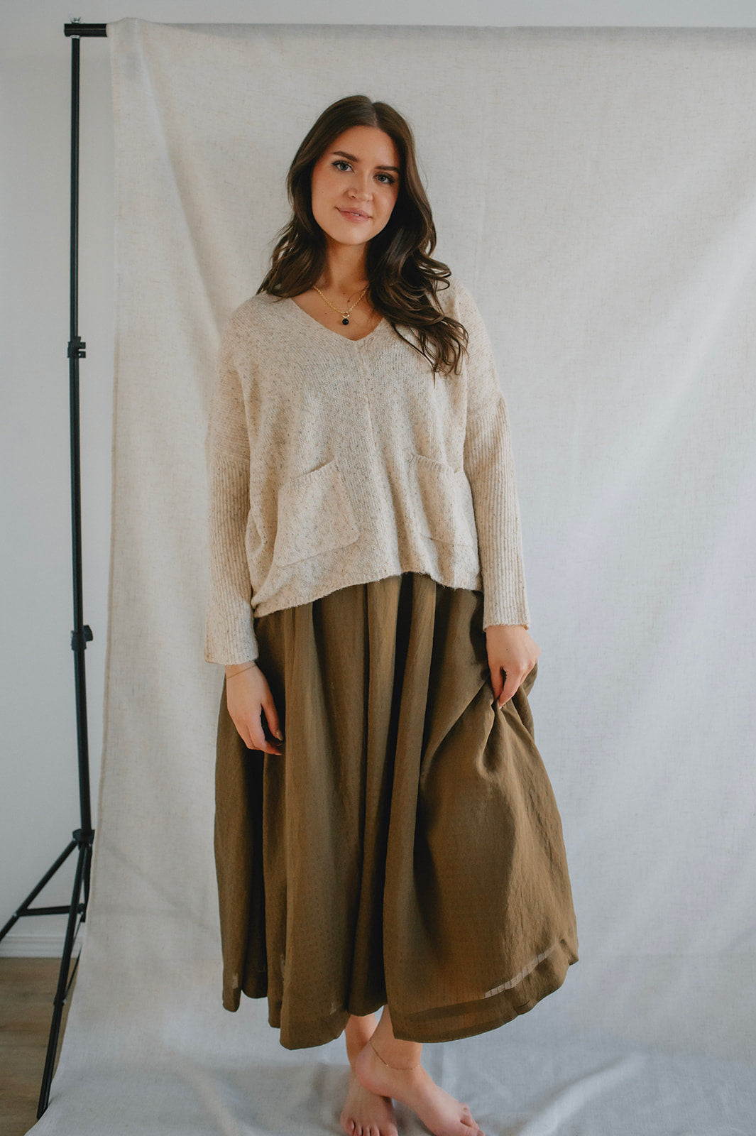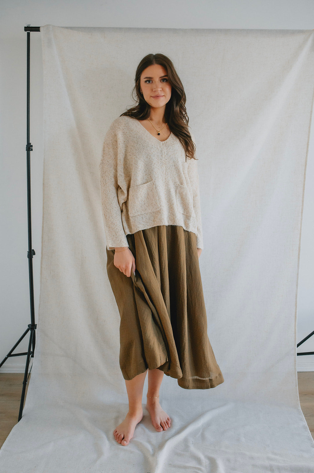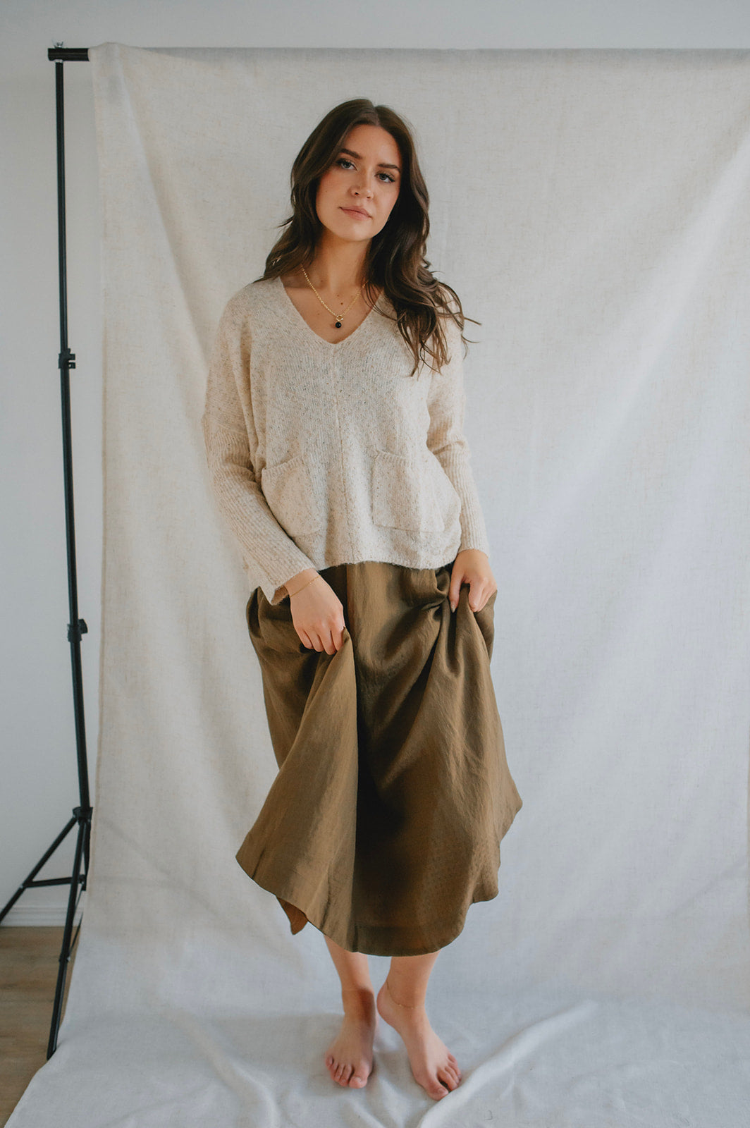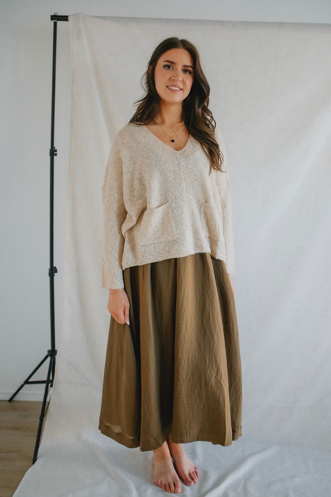This sweater is one of the comfiest things you will ever wear. The oversized fit, v-neck, and touch of spandex make her feel so soft and light. We love the speckled look and the front pockets.