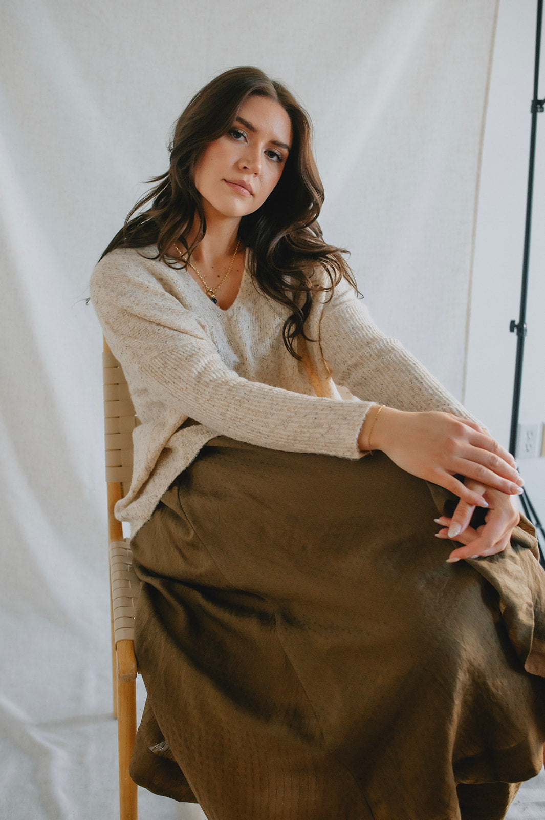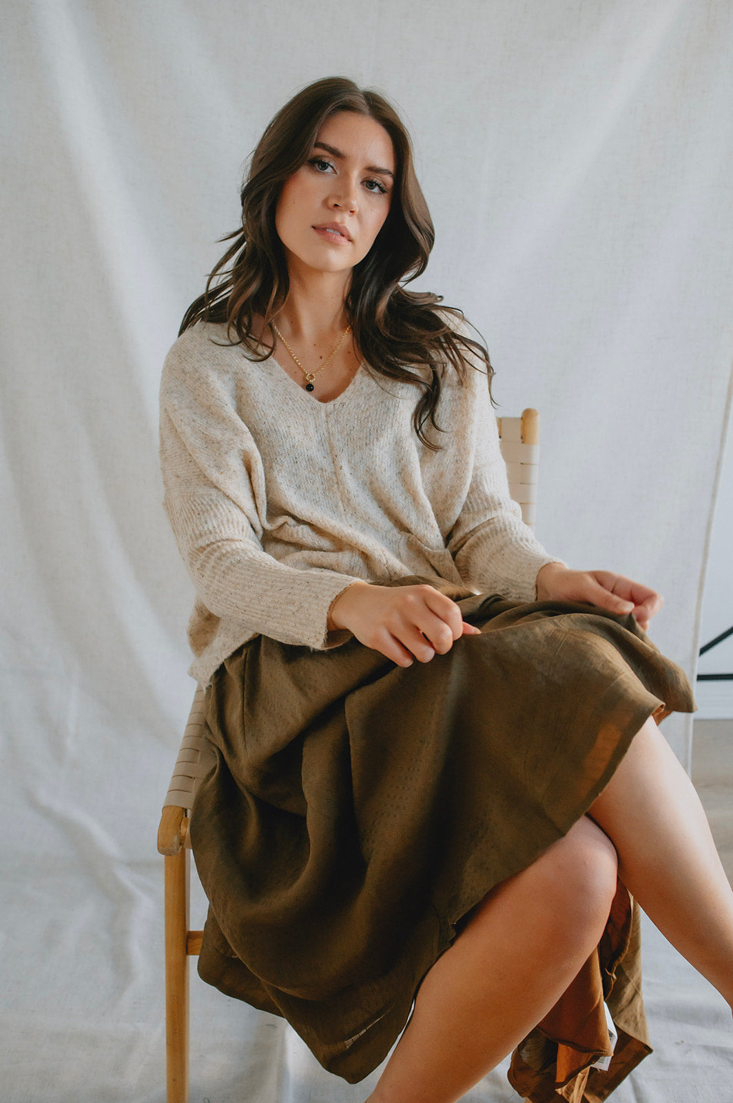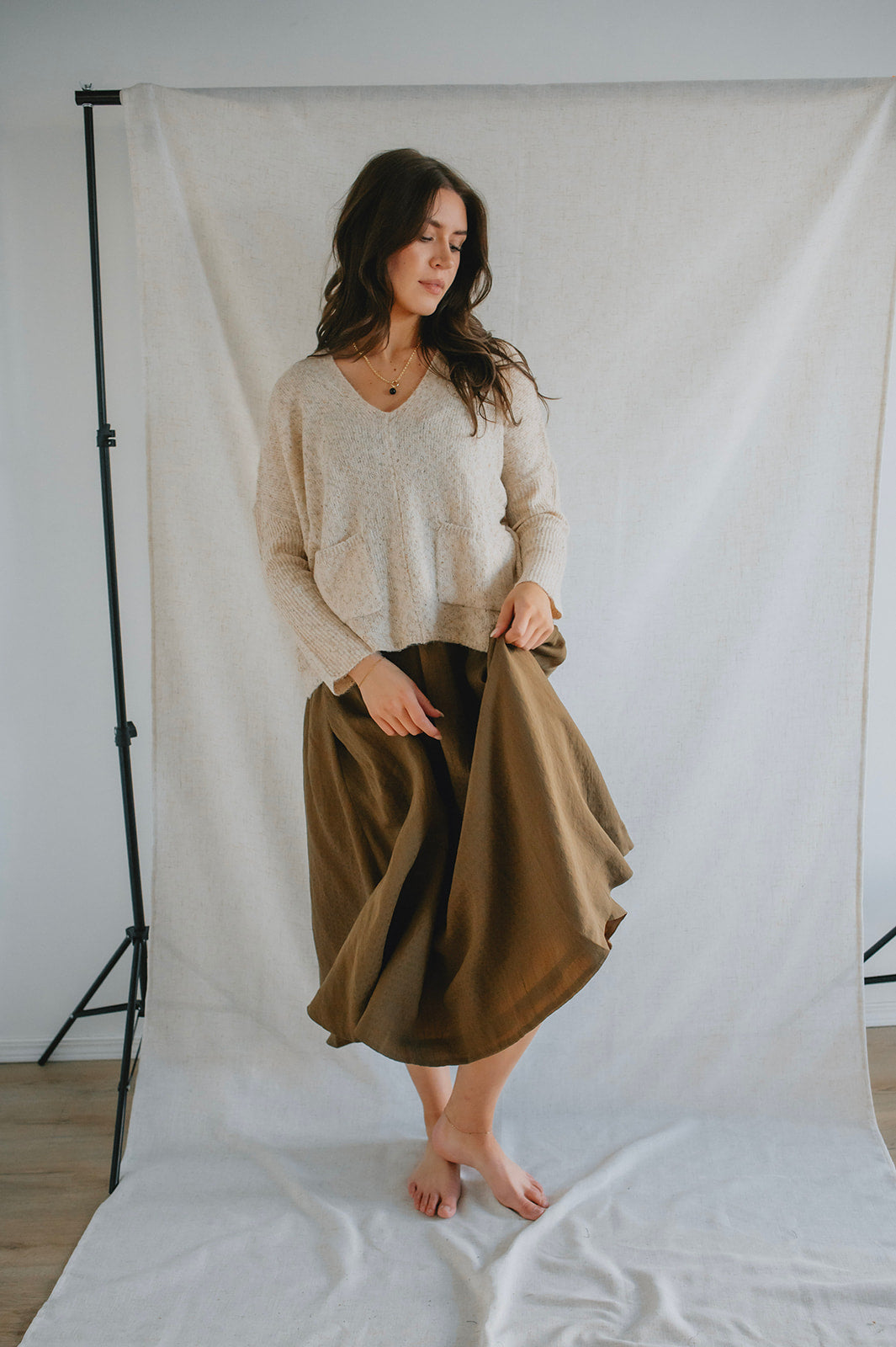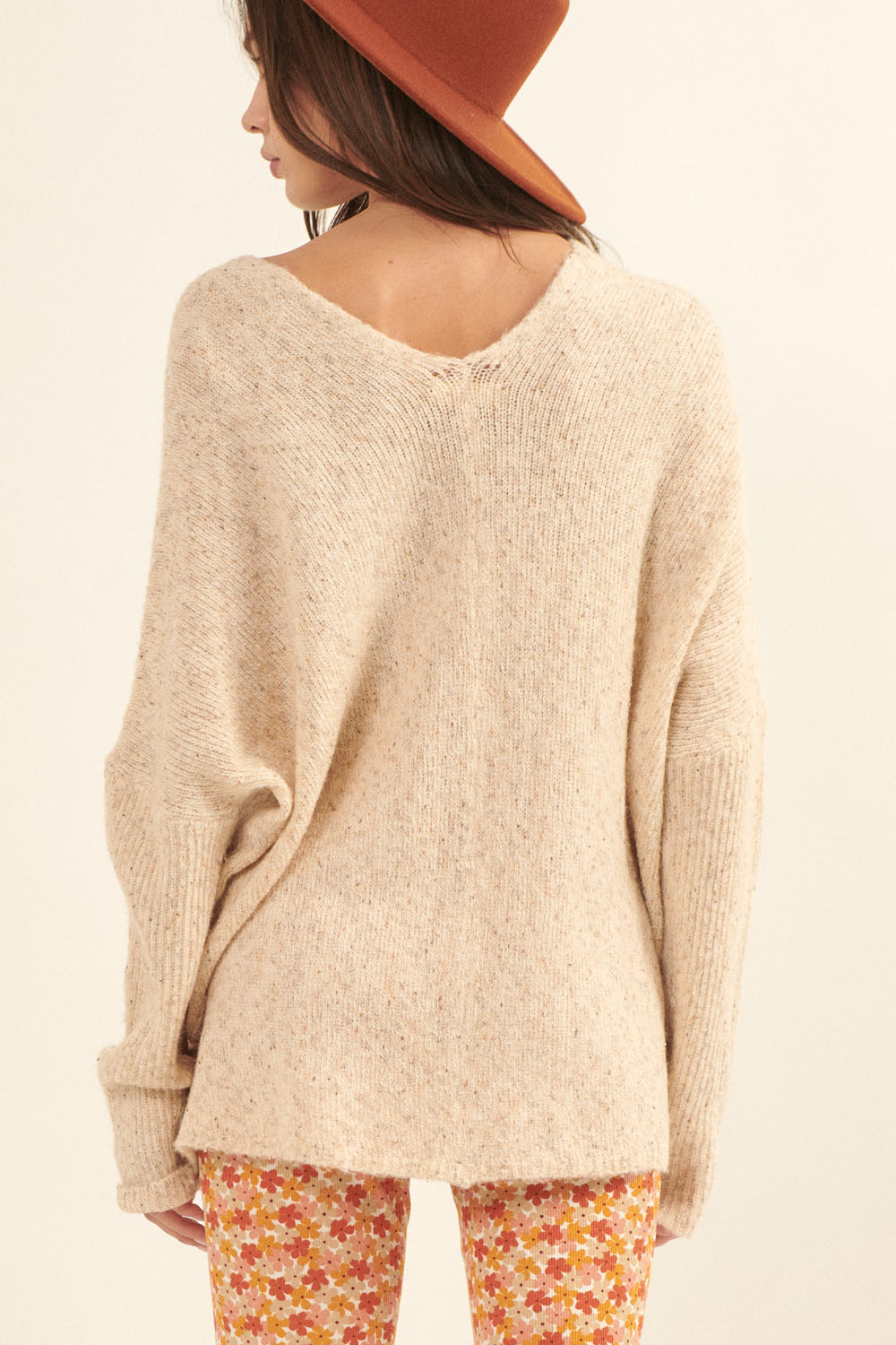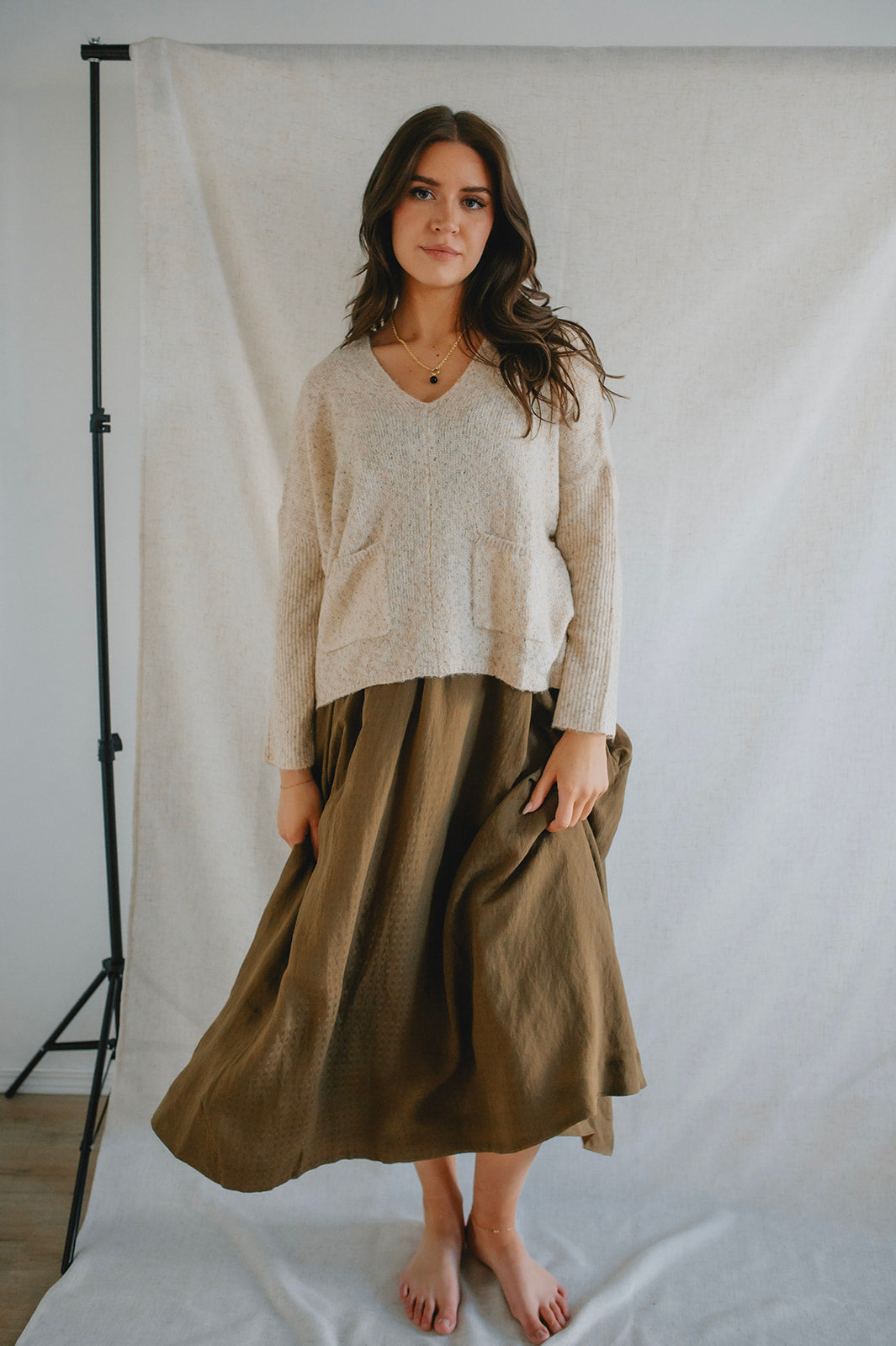 This sweater is one of the comfiest things you will ever wear. The oversized fit, v-neck, and touch of spandex make her feel so soft and light. We love the speckled look and the front pockets.