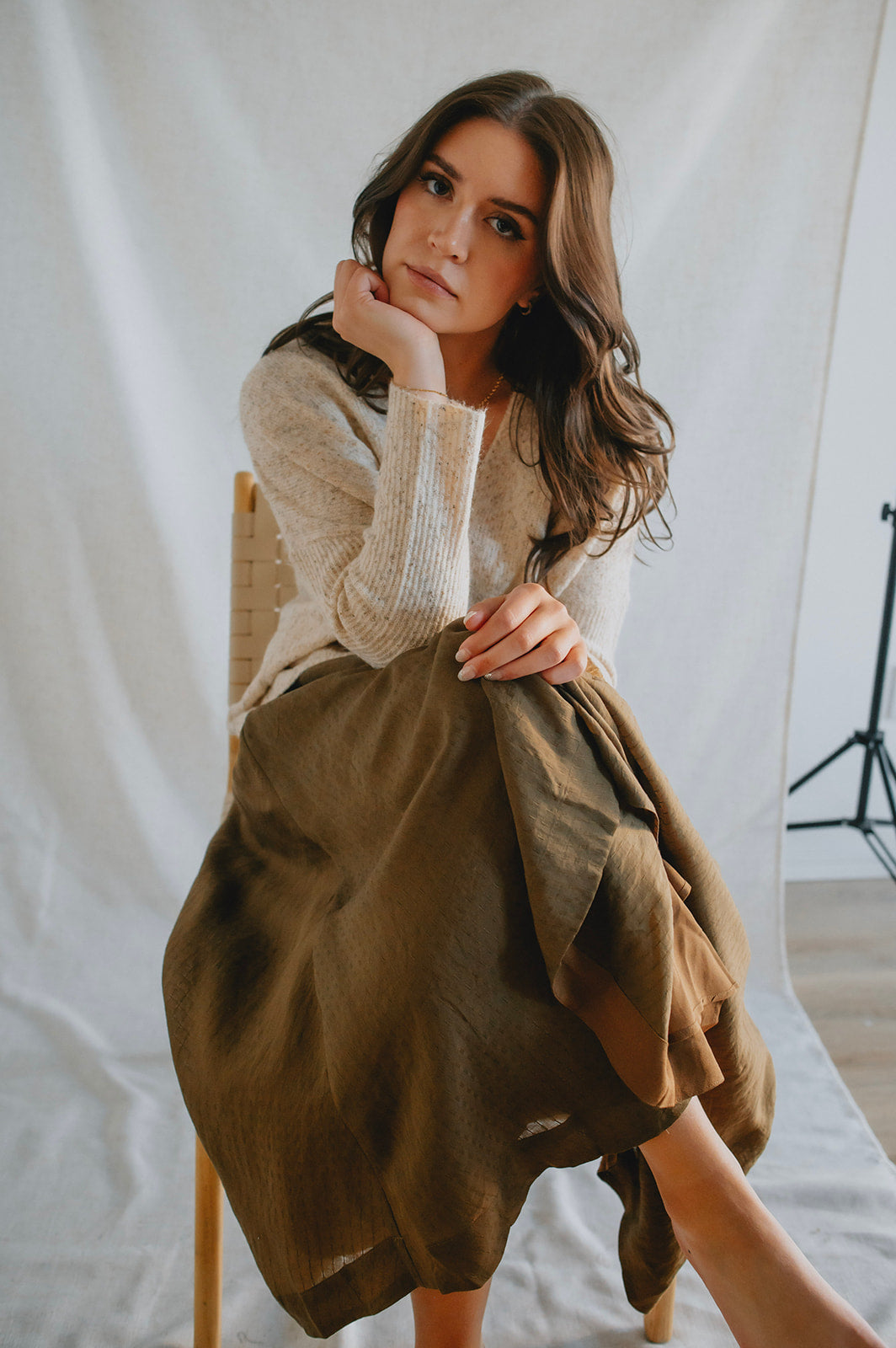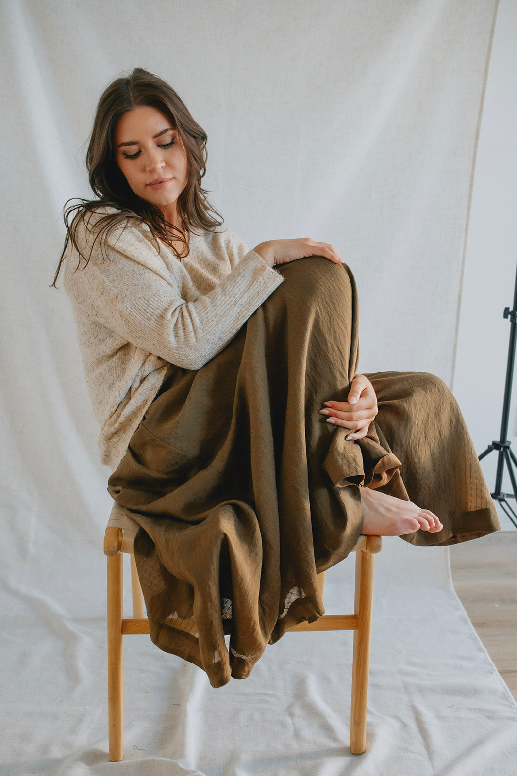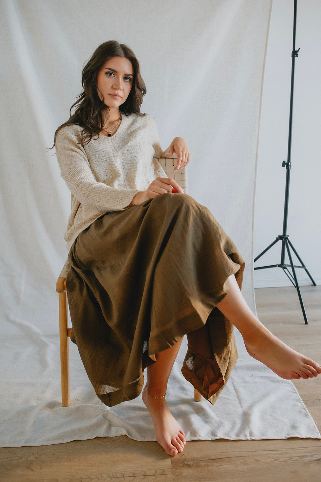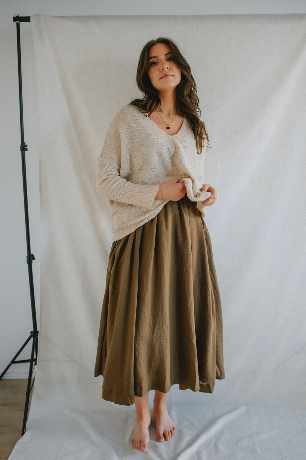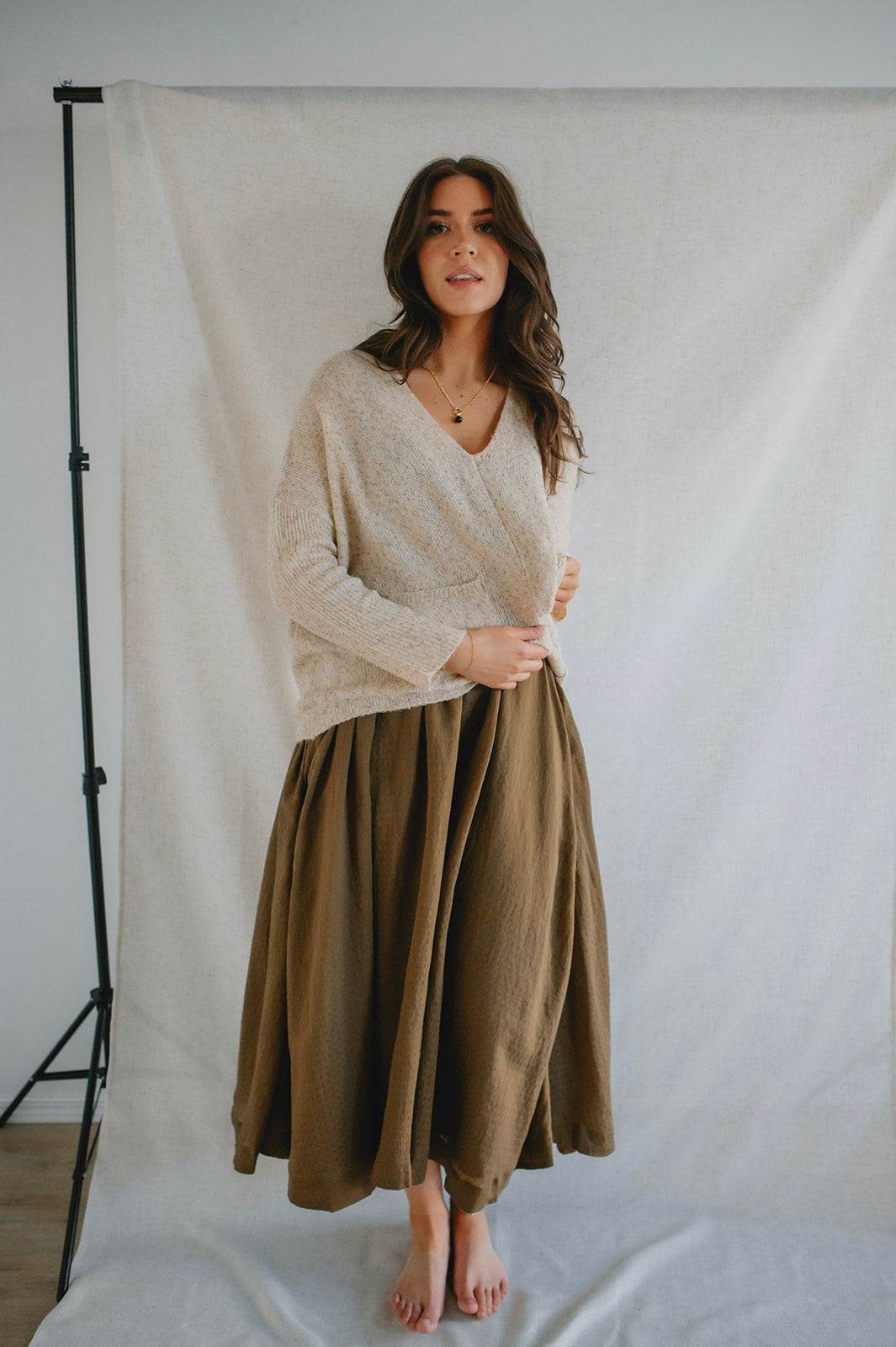 This sweater is one of the comfiest things you will ever wear. The oversized fit, v-neck, and touch of spandex make her feel so soft and light. We love the speckled look and the front pockets.