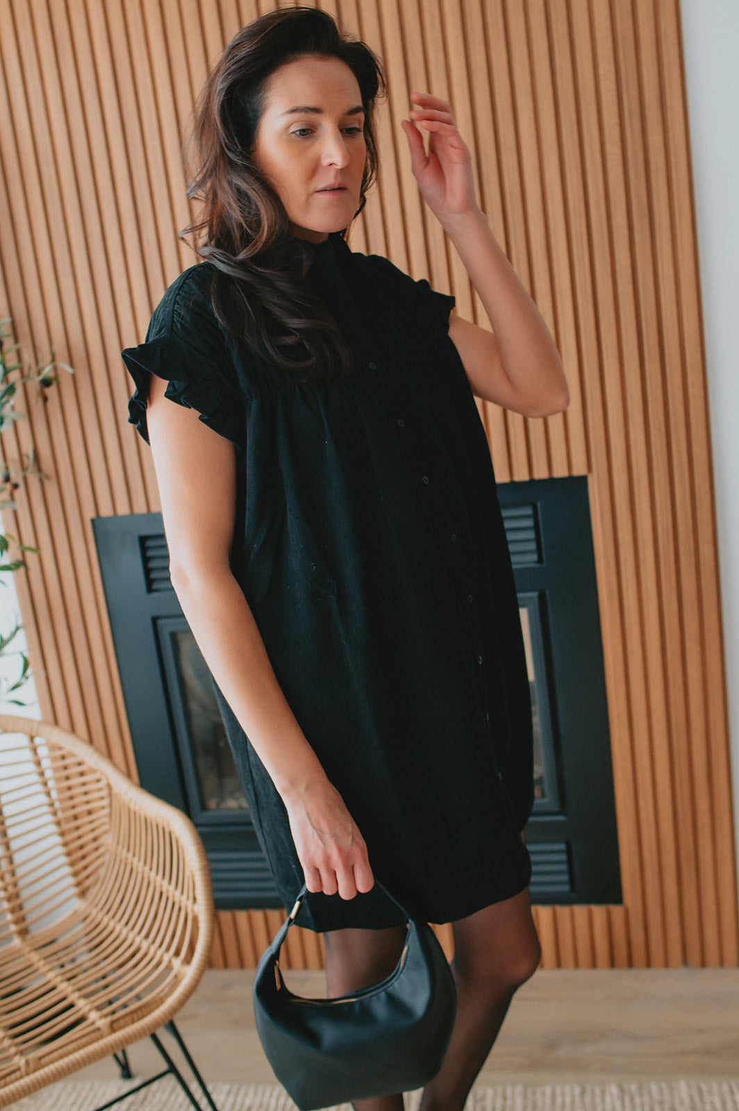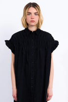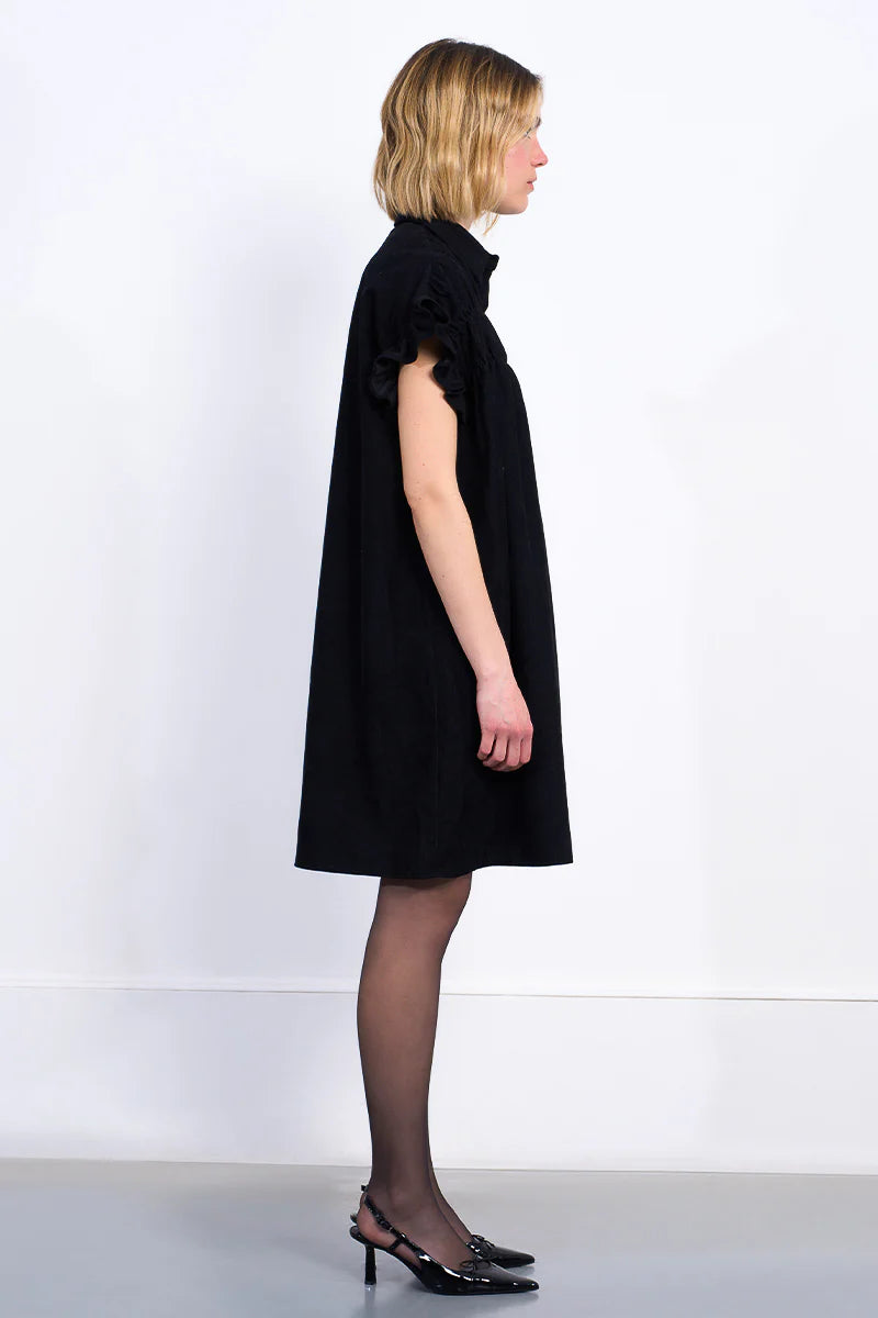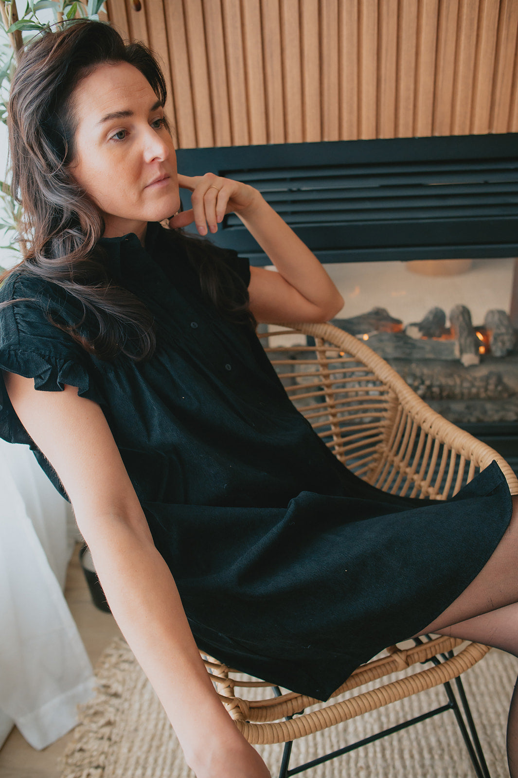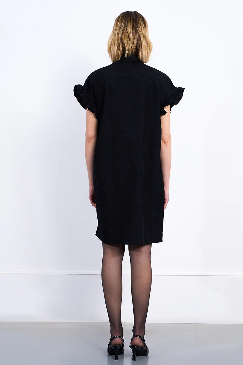 A structured take on everyday elegance. The Sabel Corduroy Dress is crafted from a thicker, refined material and designed with a straight fit for a clean, streamlined silhouette. Short sleeves are elevated with ruffled stripes for a soft, feminine touch, while the shirt collar and ruched bust bring subtle shape and polish.