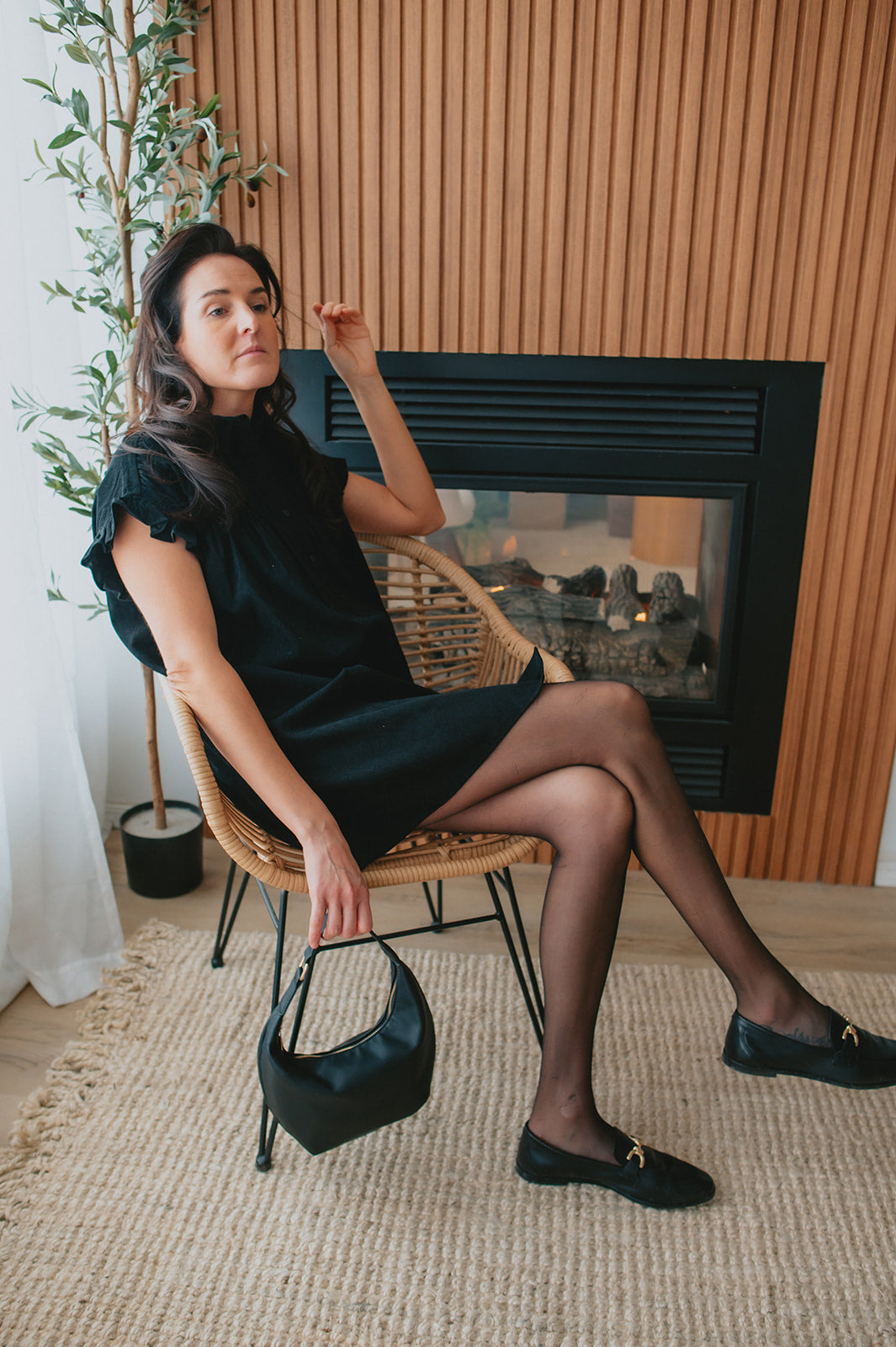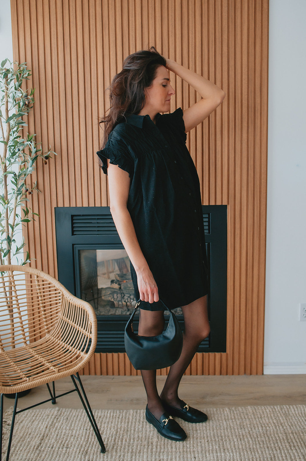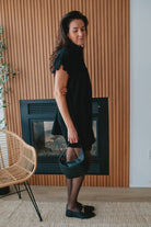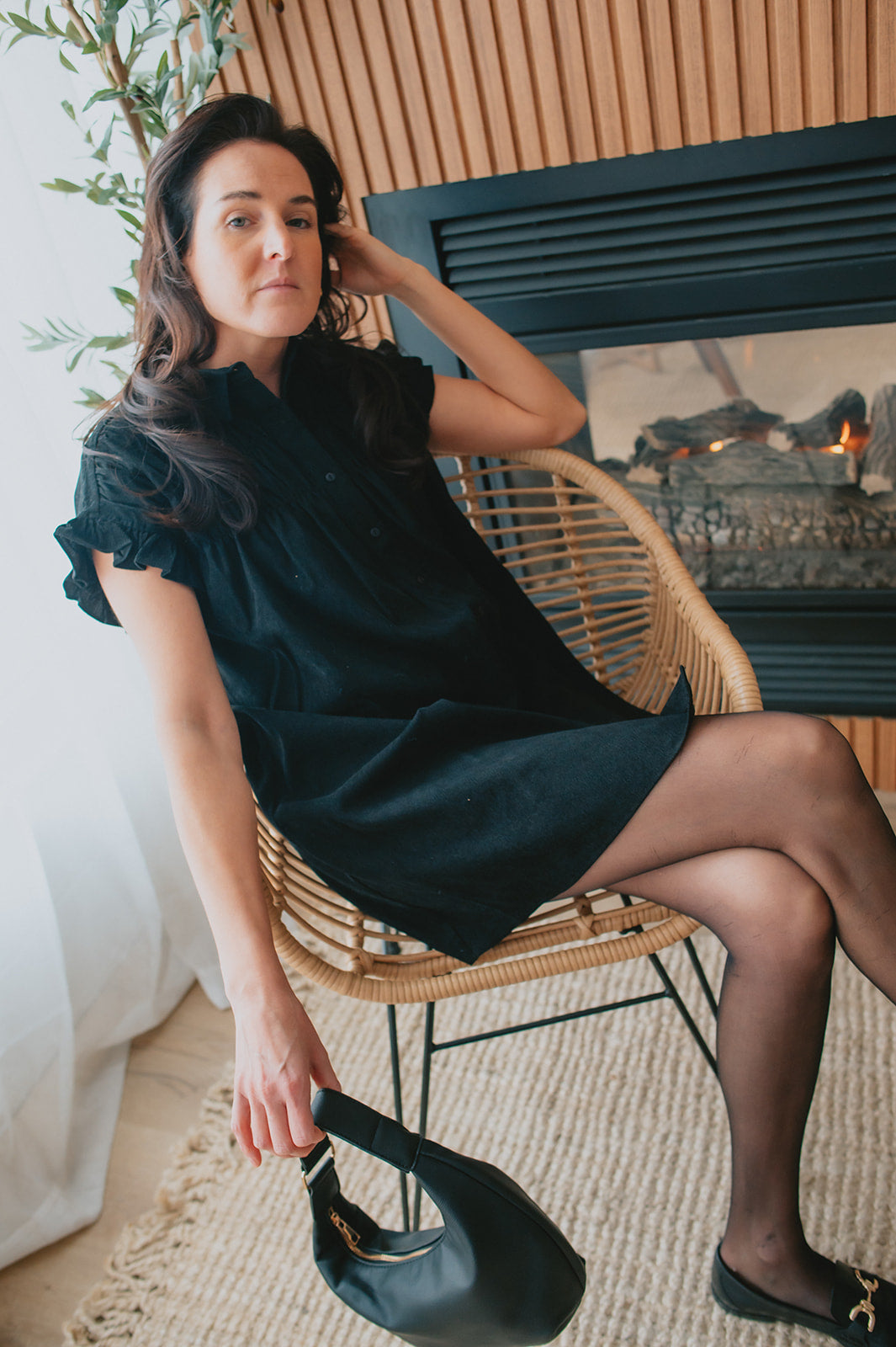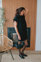 A structured take on everyday elegance. The Sabel Corduroy Dress is crafted from a thicker, refined material and designed with a straight fit for a clean, streamlined silhouette. Short sleeves are elevated with ruffled stripes for a soft, feminine touch, while the shirt collar and ruched bust bring subtle shape and polish.