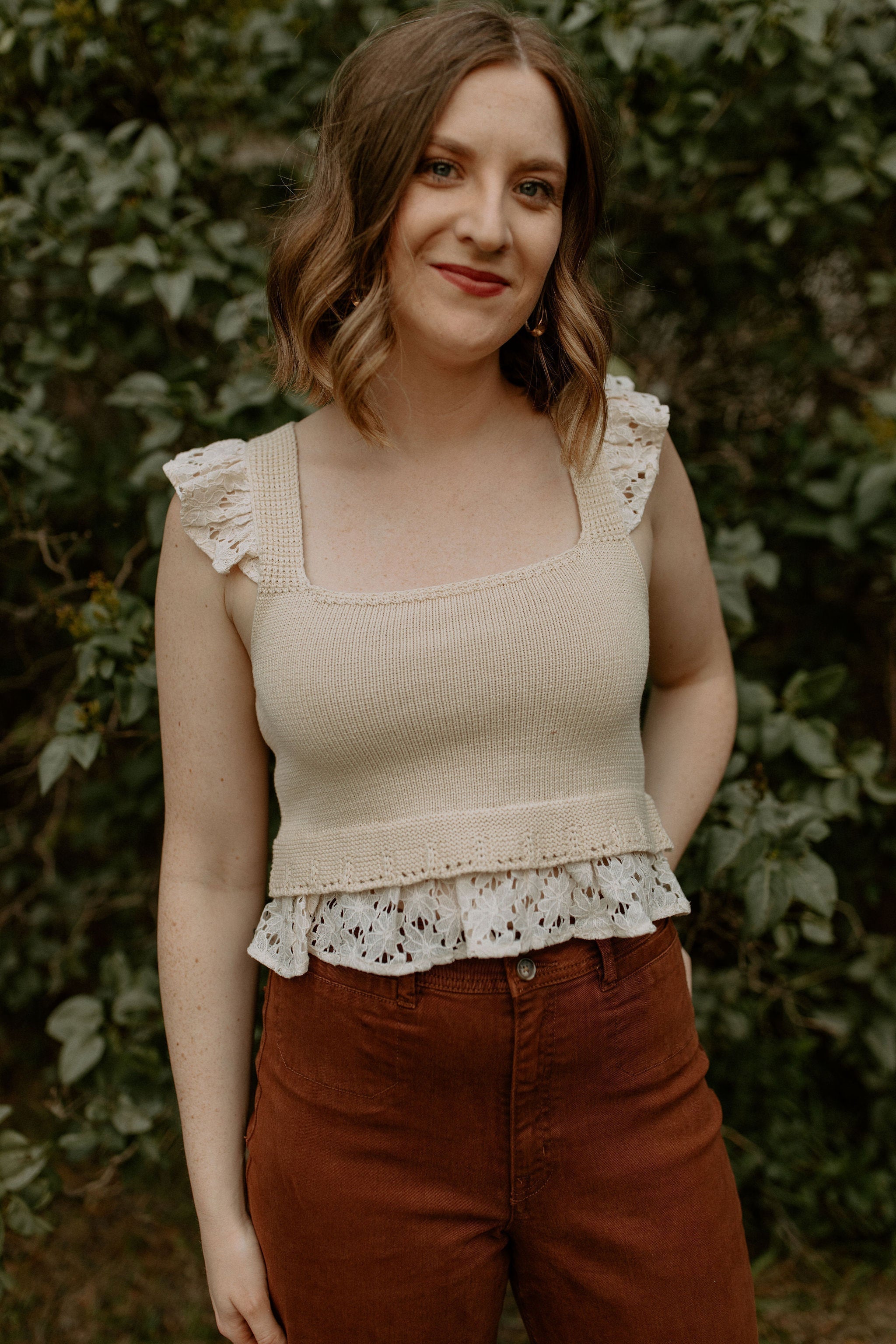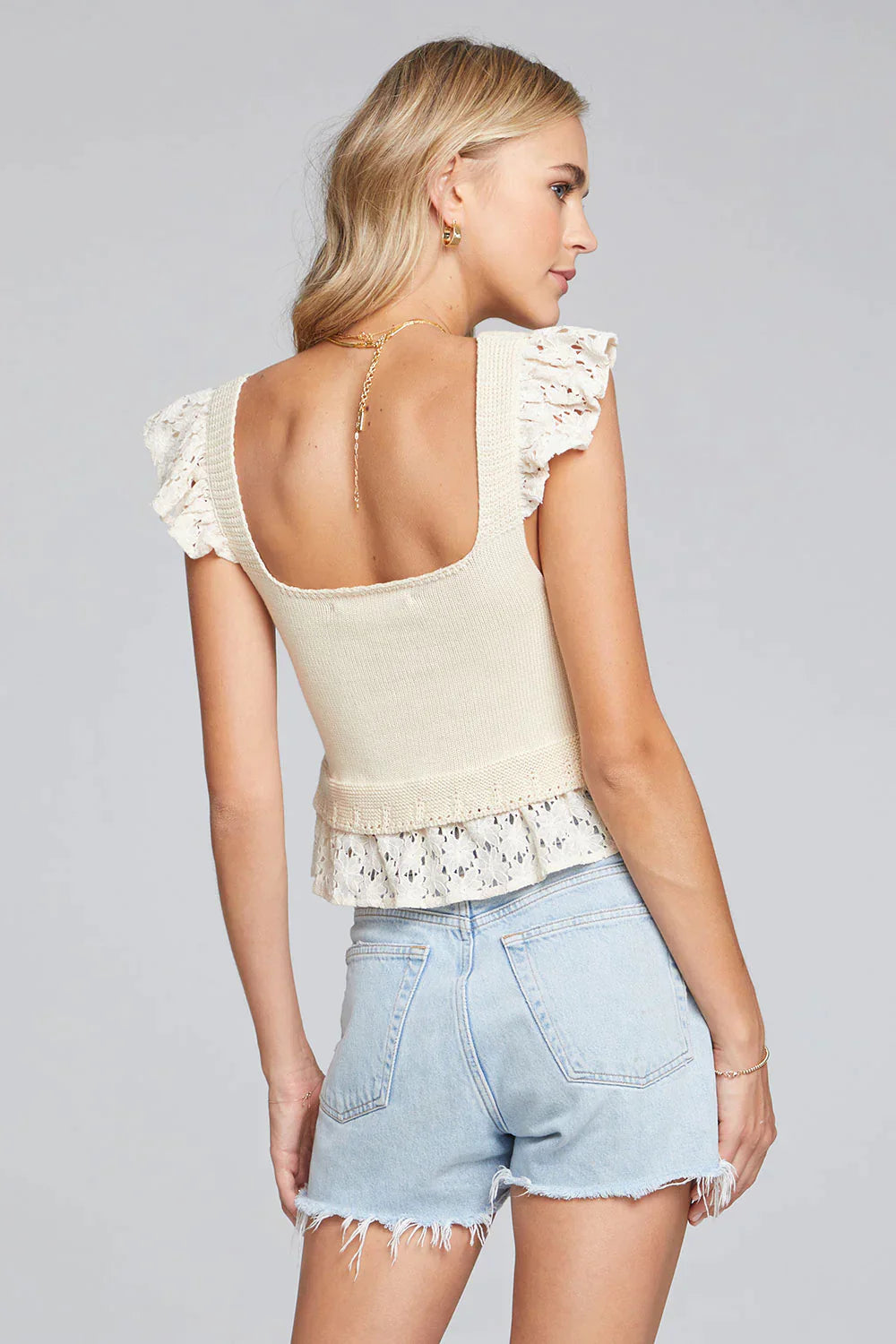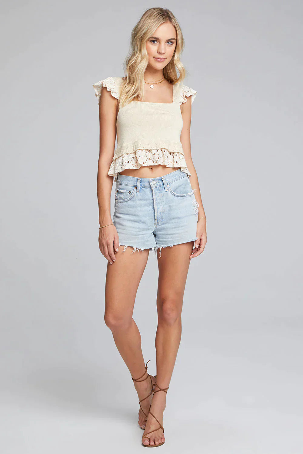 Feminine and flirty! Our ruffle Short Sleeve Sara Top features sweater material and crochet lace. Pair with denim and chunky sandals or under a cardigan for a laid back look. The natural, off-white shade is always in season, so keep this at the front of your closet.