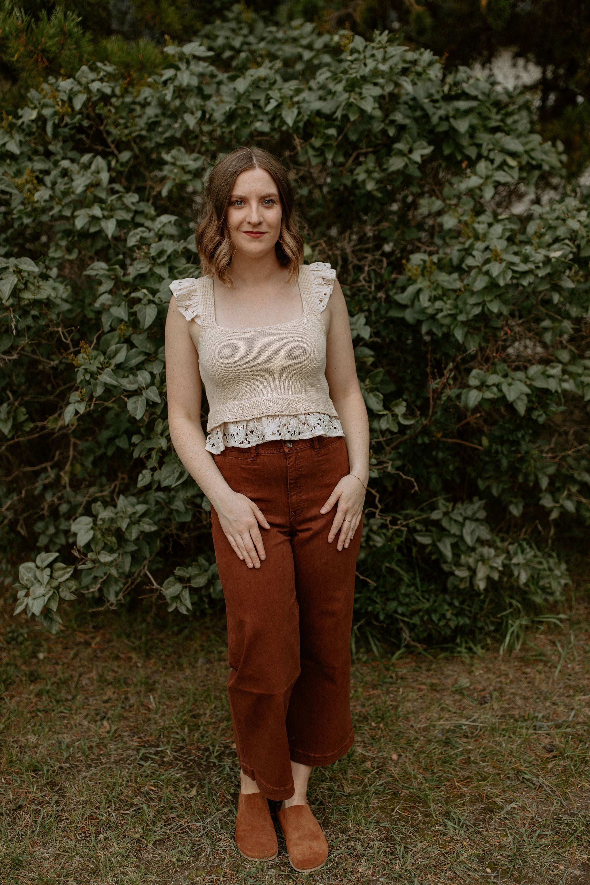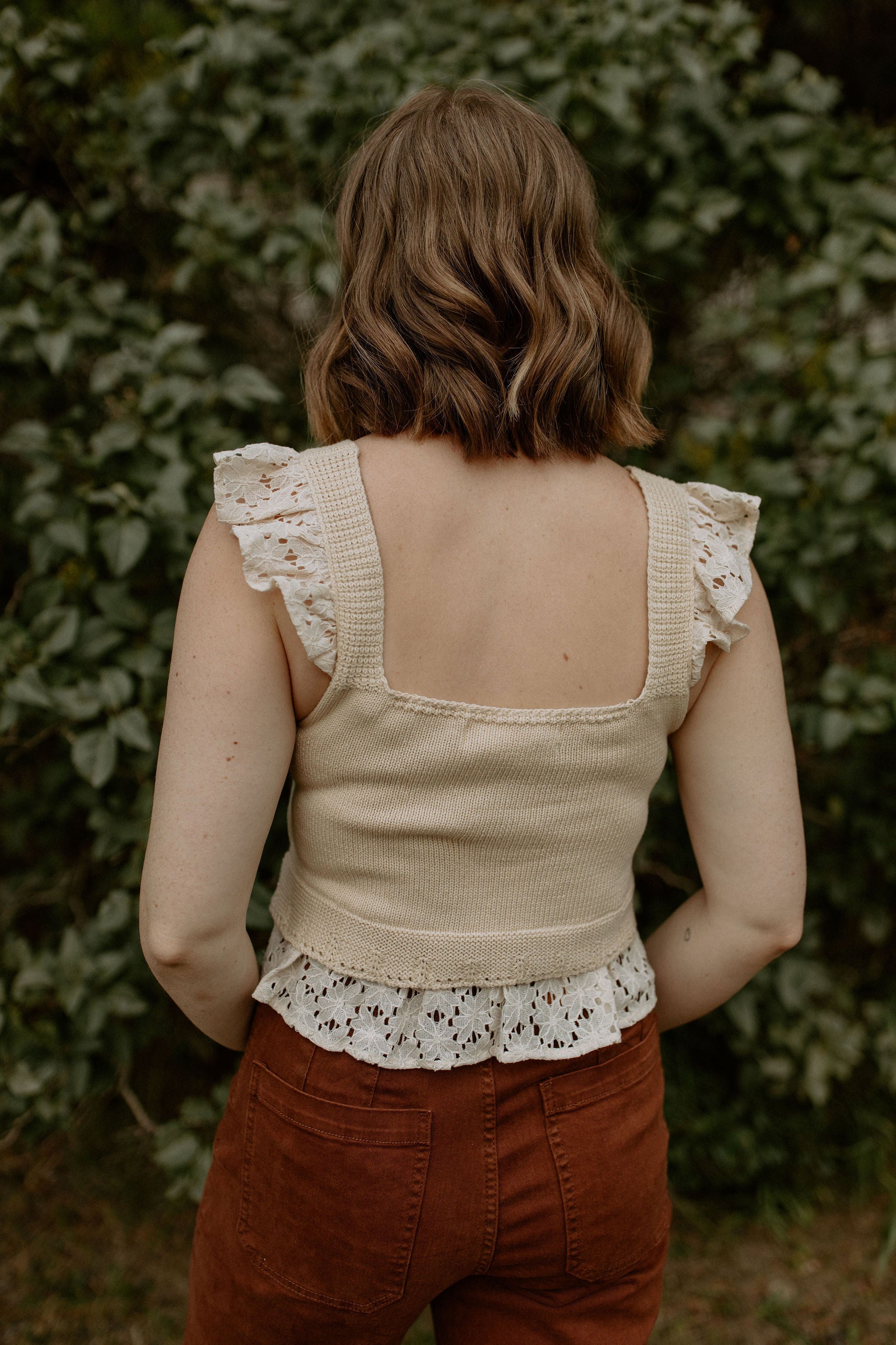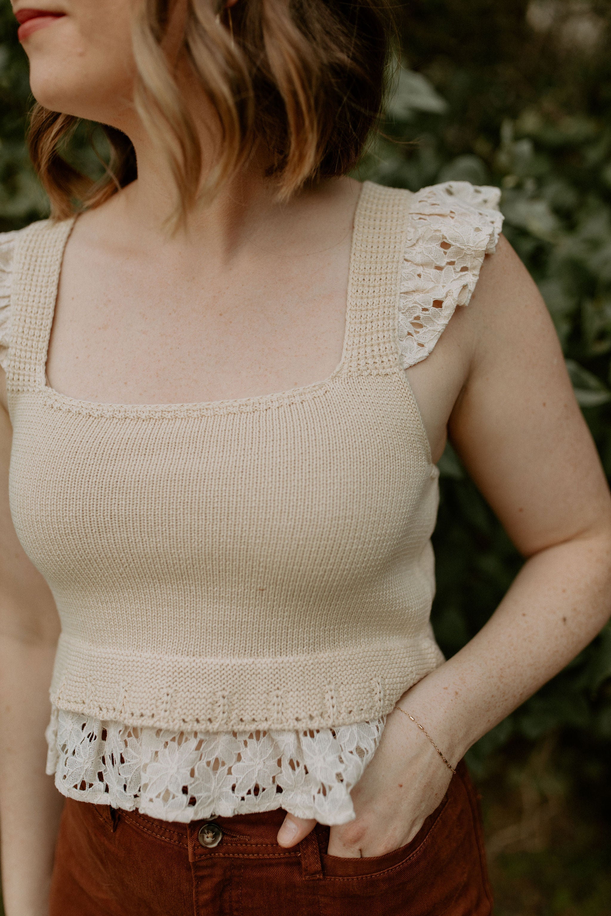 Feminine and flirty! Our ruffle Short Sleeve Sara Top features sweater material and crochet lace. Pair with denim and chunky sandals or under a cardigan for a laid back look. The natural, off-white shade is always in season, so keep this at the front of your closet.