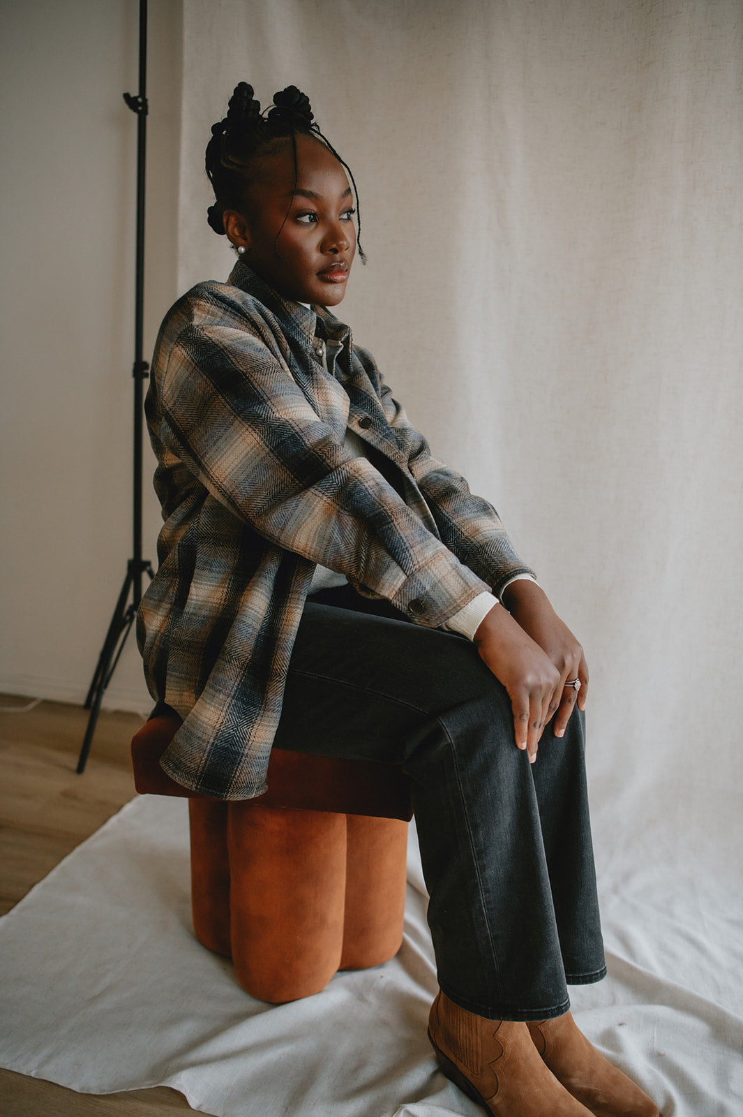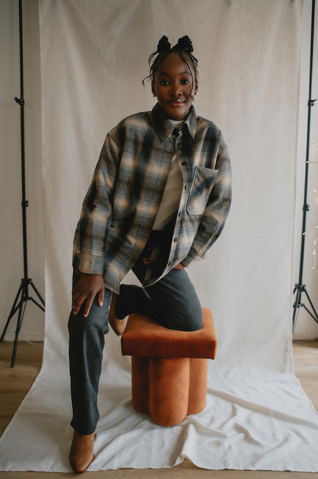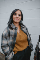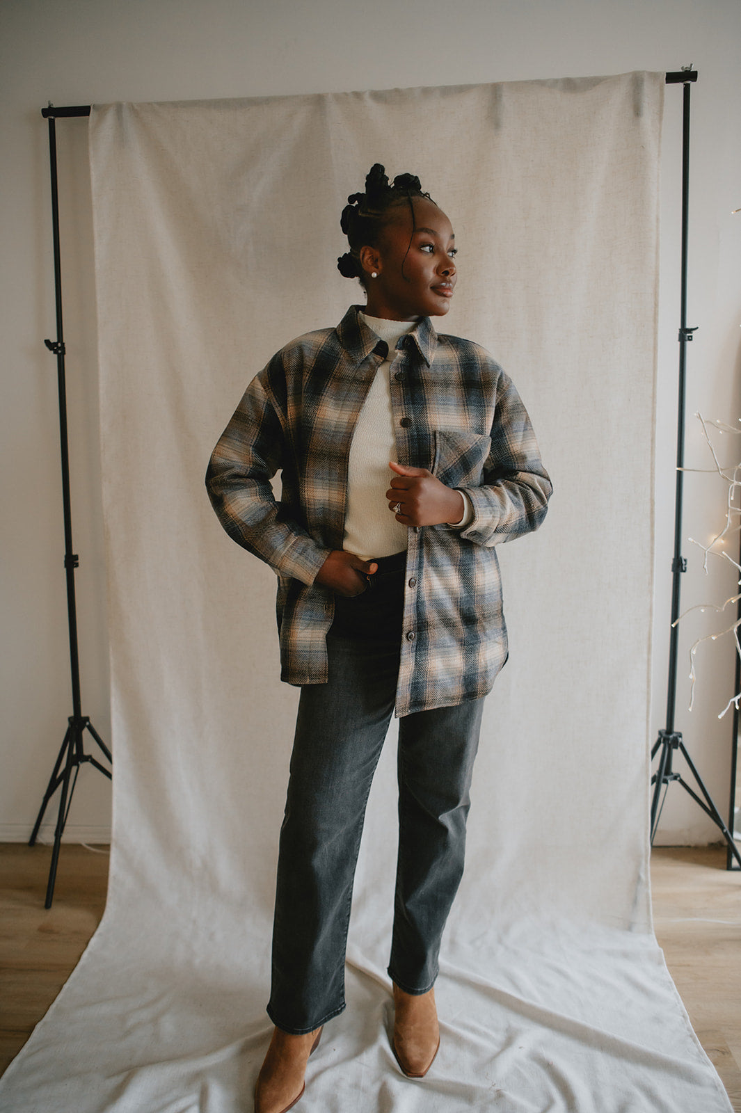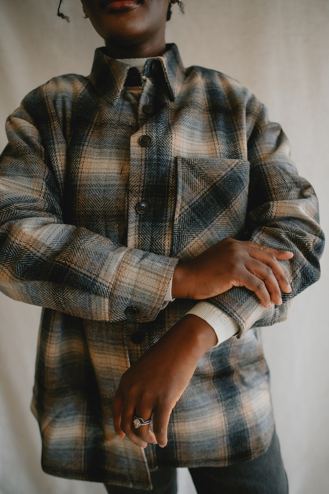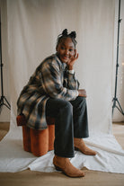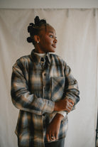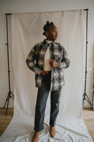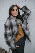Crafted from a wool blend of navy and brown tones, the Studio Plaid jacket features a timeless tartan pattern that feels both cozy and refined. Designed with an easy snap-front closure and a single chest pocket, it blends heritage style with everyday wearability.
