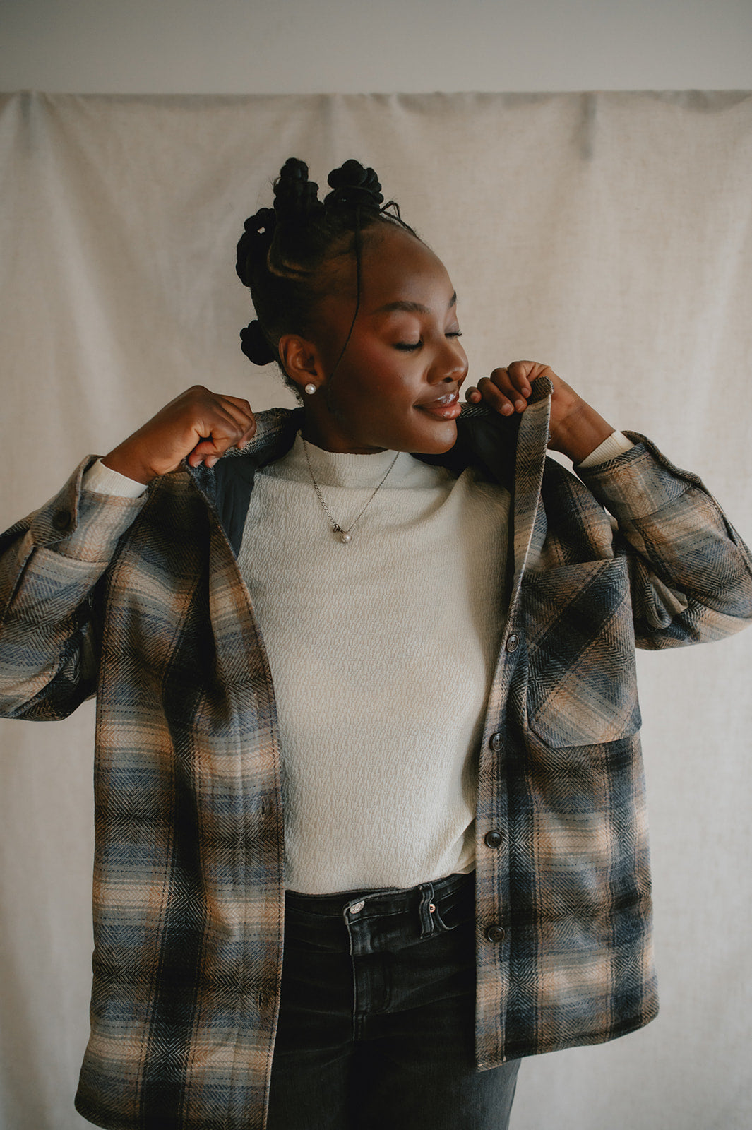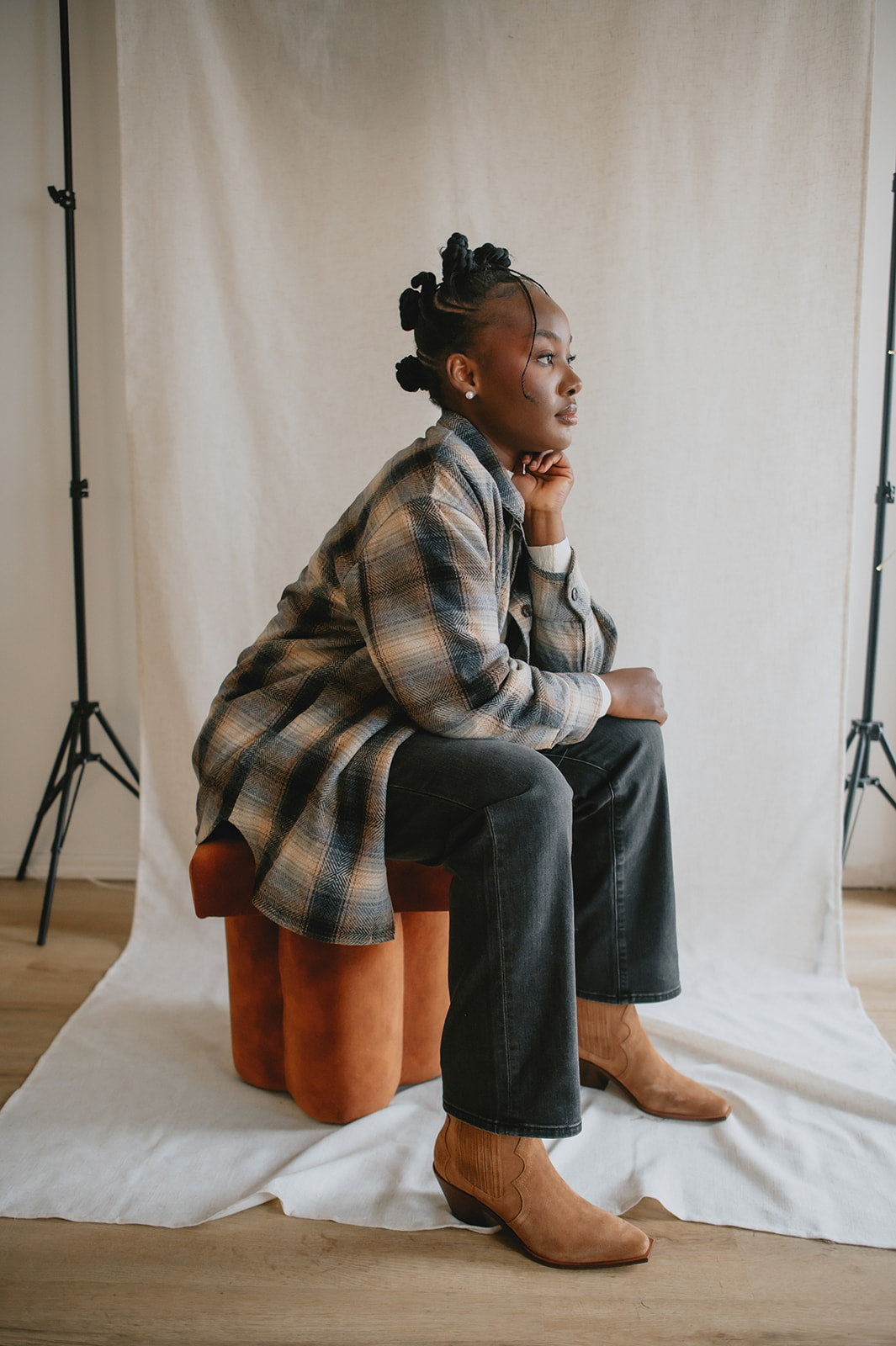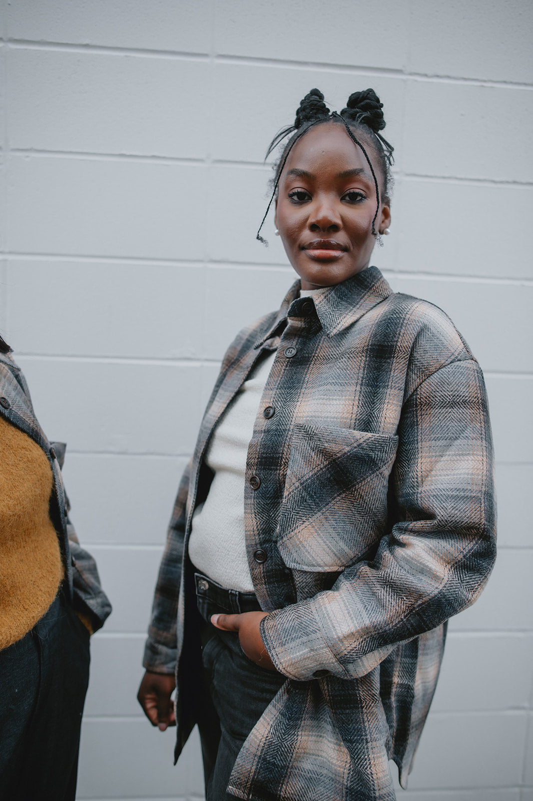 Crafted from a wool blend of navy and brown tones, the Studio Plaid jacket features a timeless tartan pattern that feels both cozy and refined. Designed with an easy snap-front closure and a single chest pocket, it blends heritage style with everyday wearability.