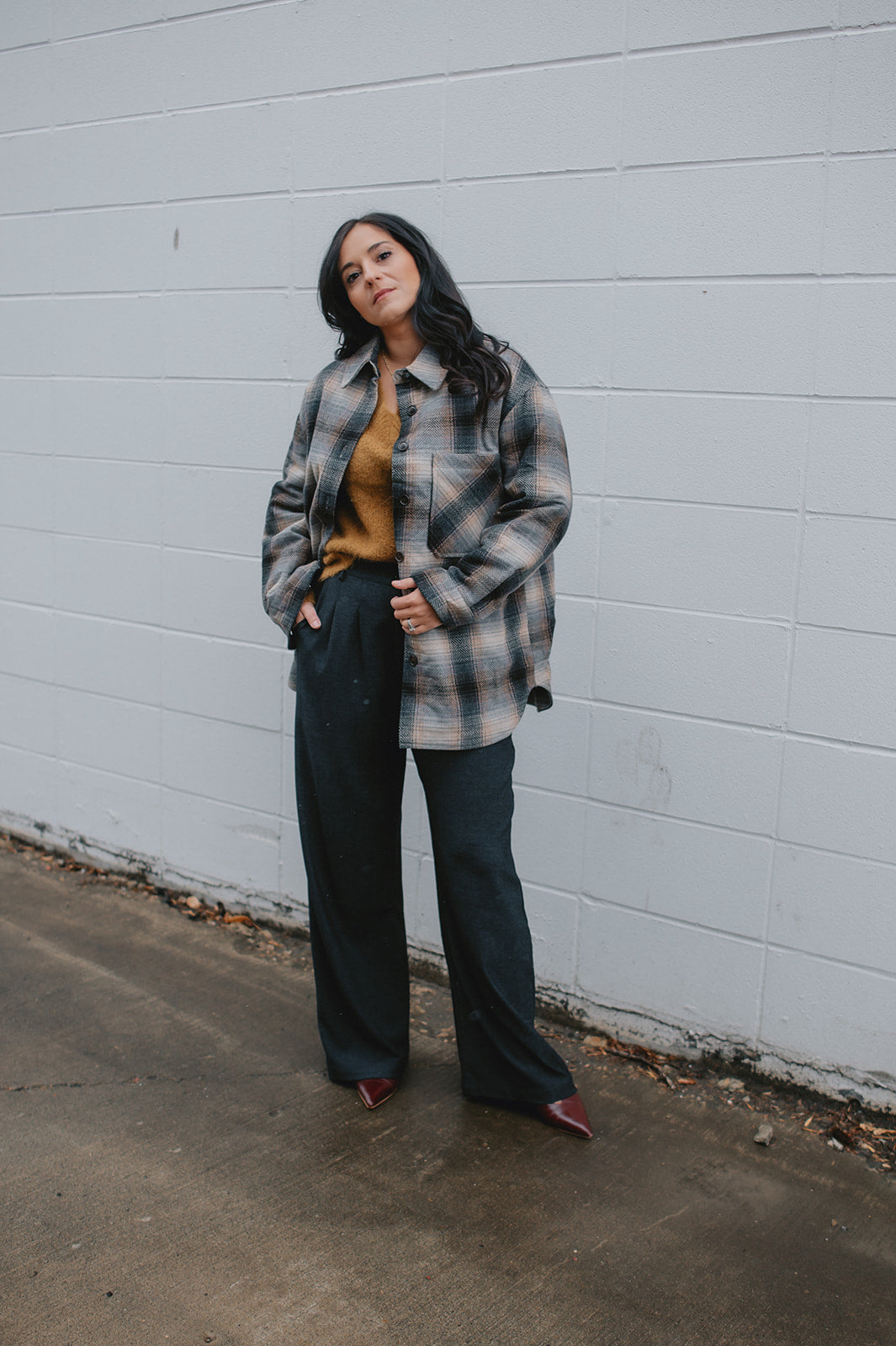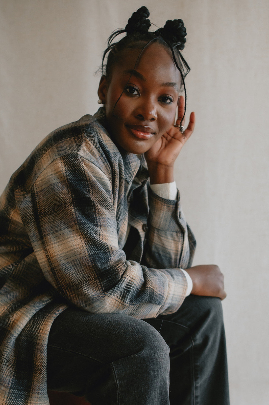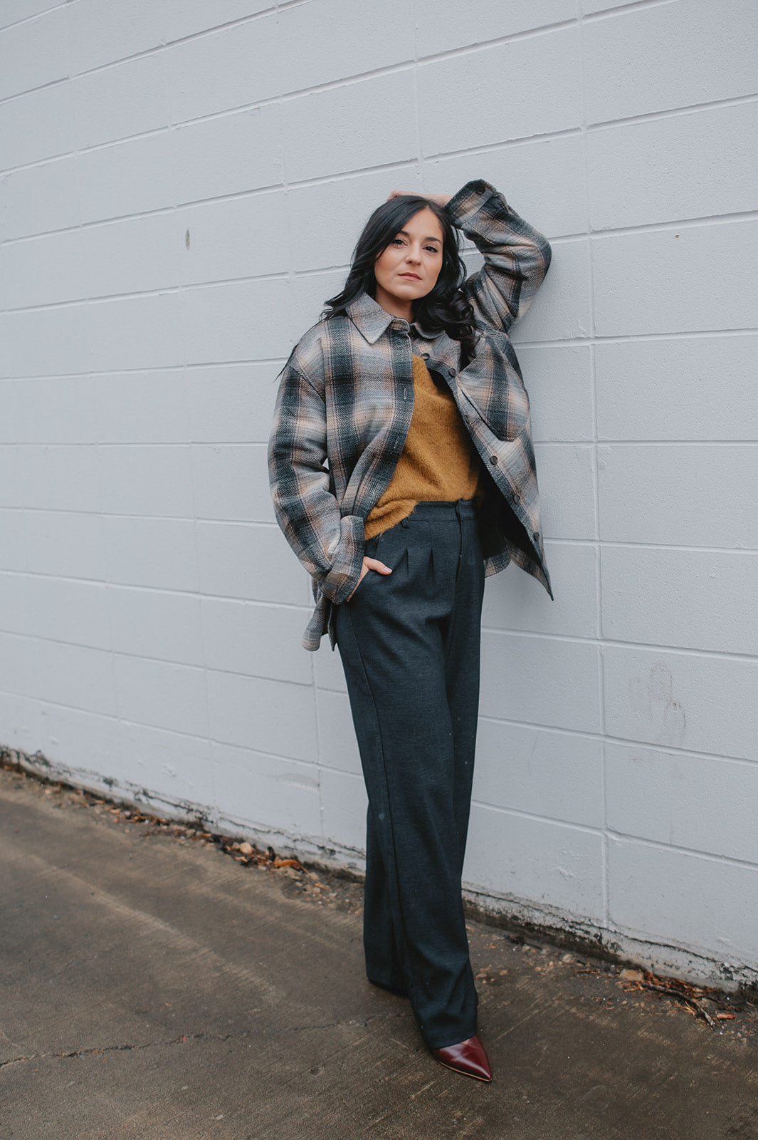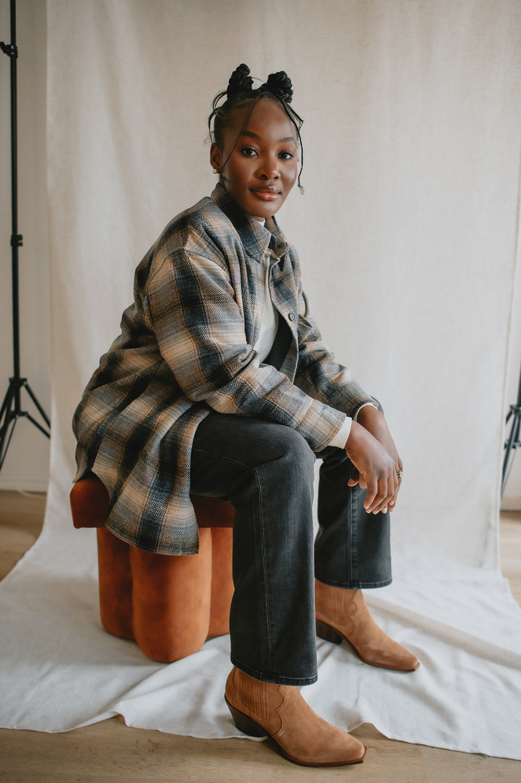 Crafted from a wool blend of navy and brown tones, the Studio Plaid jacket features a timeless tartan pattern that feels both cozy and refined. Designed with an easy snap-front closure and a single chest pocket, it blends heritage style with everyday wearability.