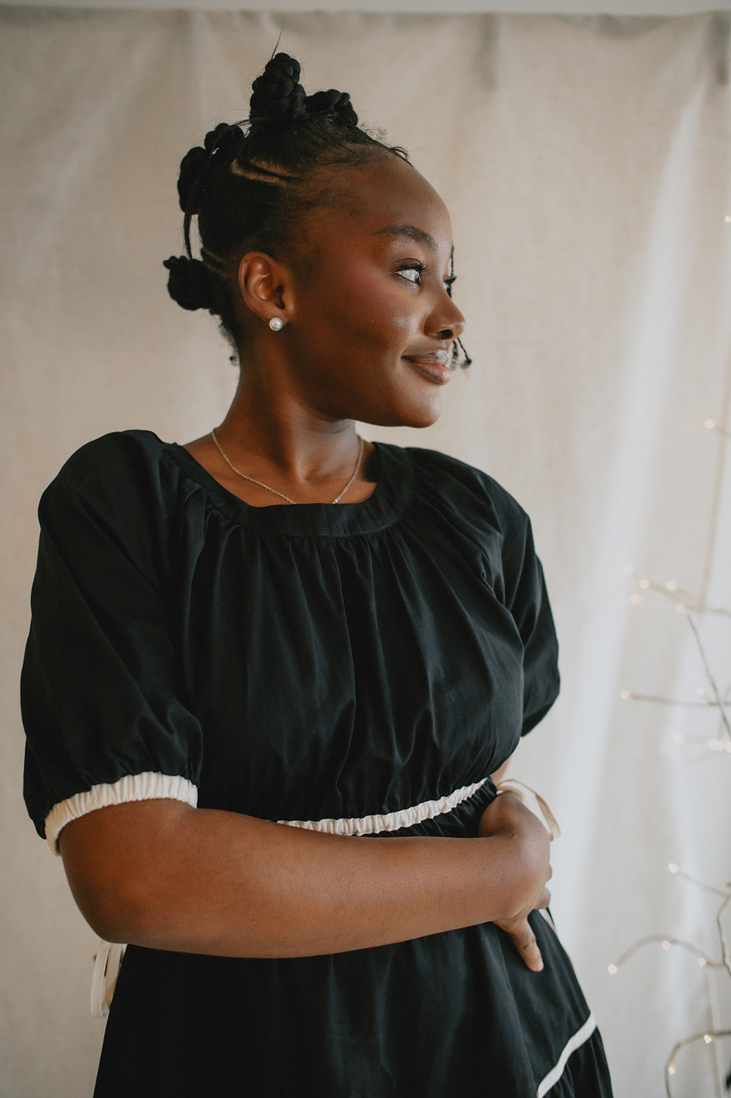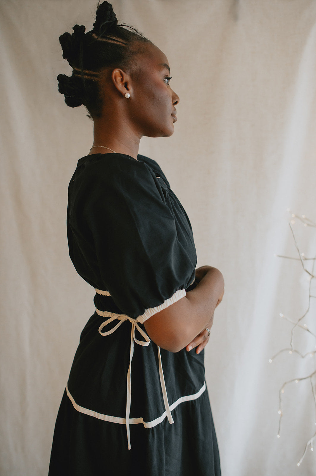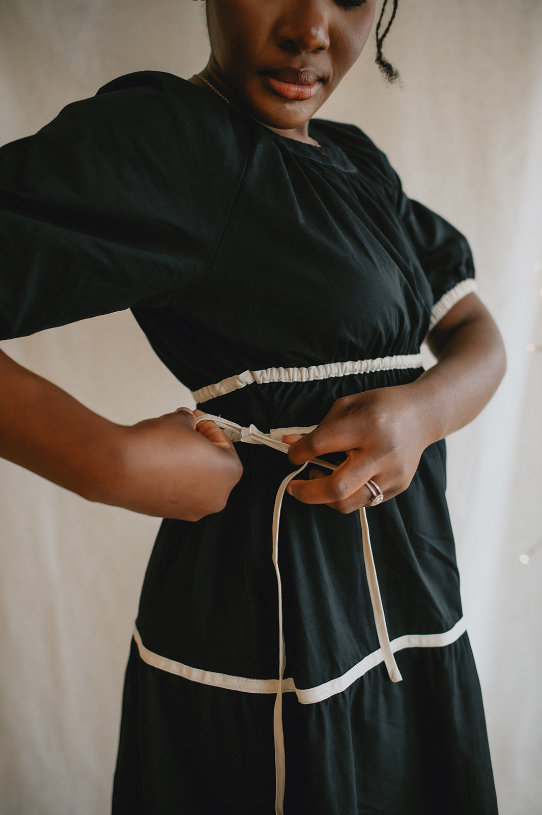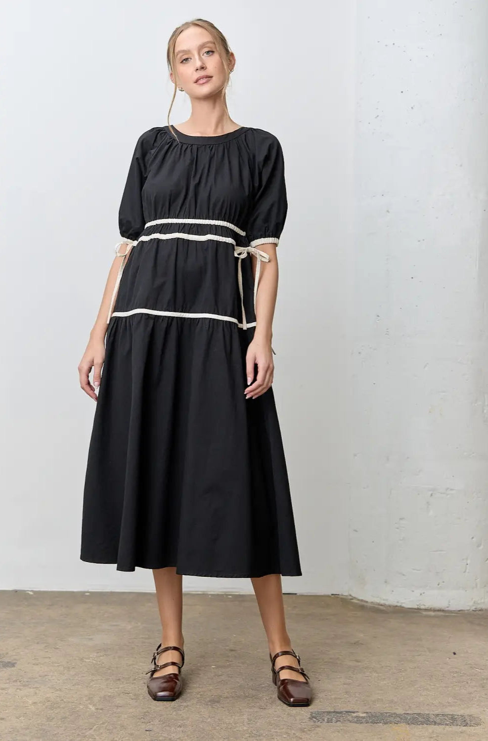 Effortlessly charming with a touch of modern flair, this Contrast Tie Midi Dress is your new go-to for elevated everyday style. Featuring a flattering around-the-neck design and soft puff sleeves, it blends romantic details with contemporary structure. The midi length offers graceful movement for any occasion. Whether you're headed to brunch or a weekend getaway, this dress brings timeless femininity with a fresh twist.