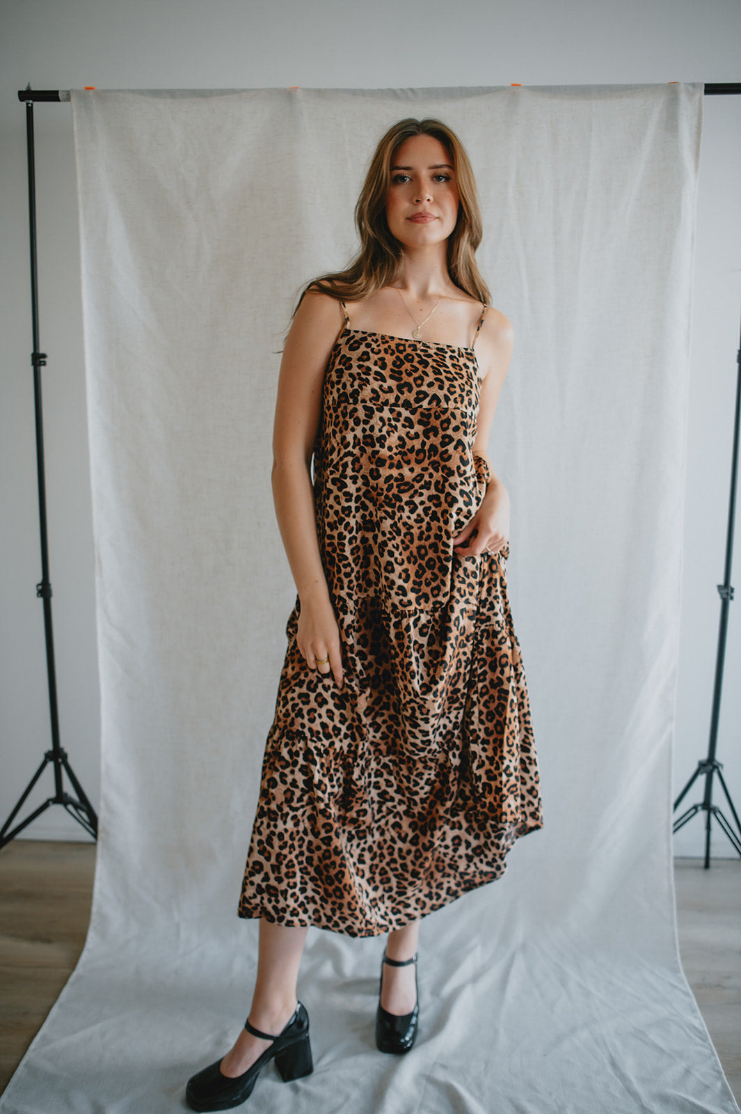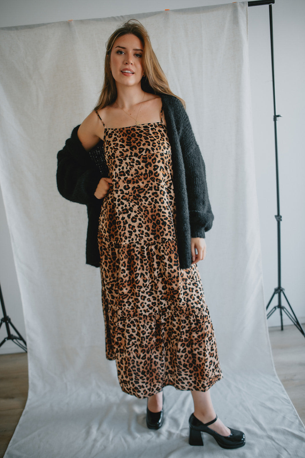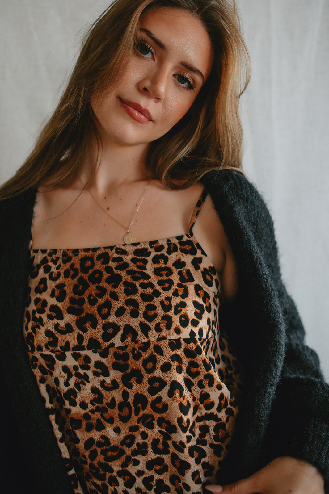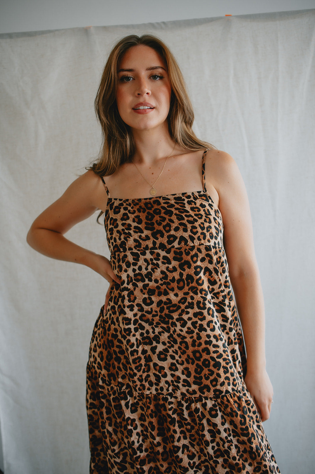 Turn heads in the Velora Satin Dress, designed to make a statement wherever you go. Crafted from smooth, high-shine satin with a subtle leopard print, this dress drapes beautifully over the body for a flattering, fluid silhouette. The square neckline and delicate thin straps create a clean, modern shape that frames the collarbone and shoulders with effortless elegance.