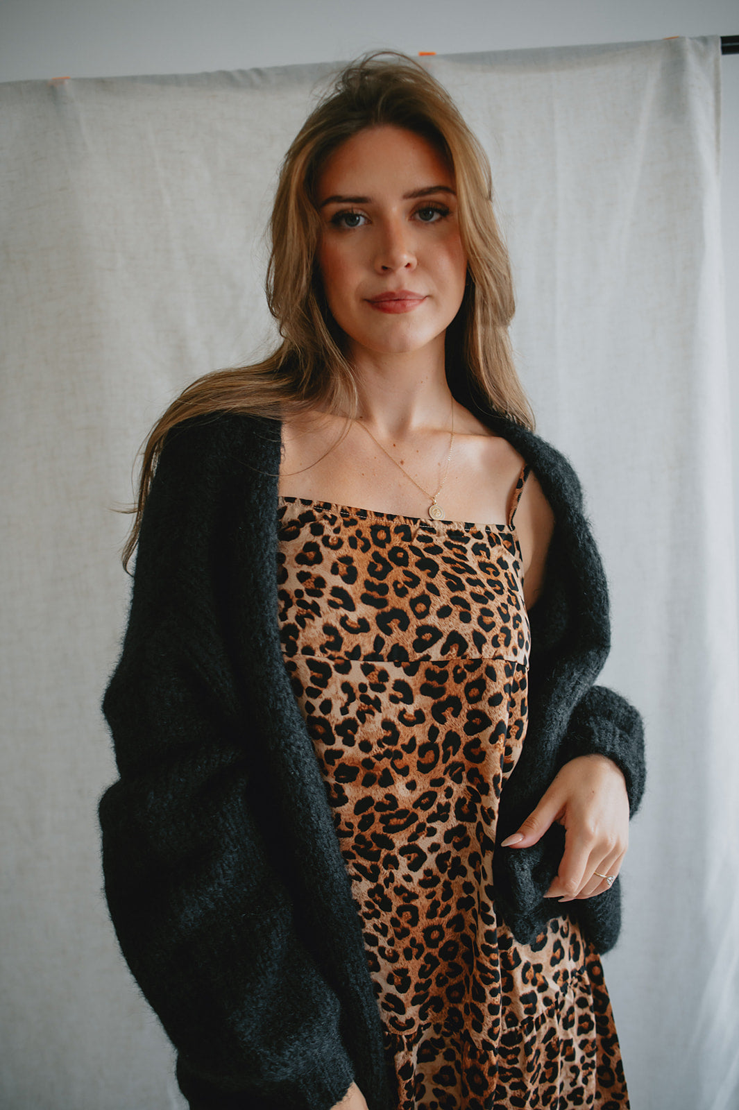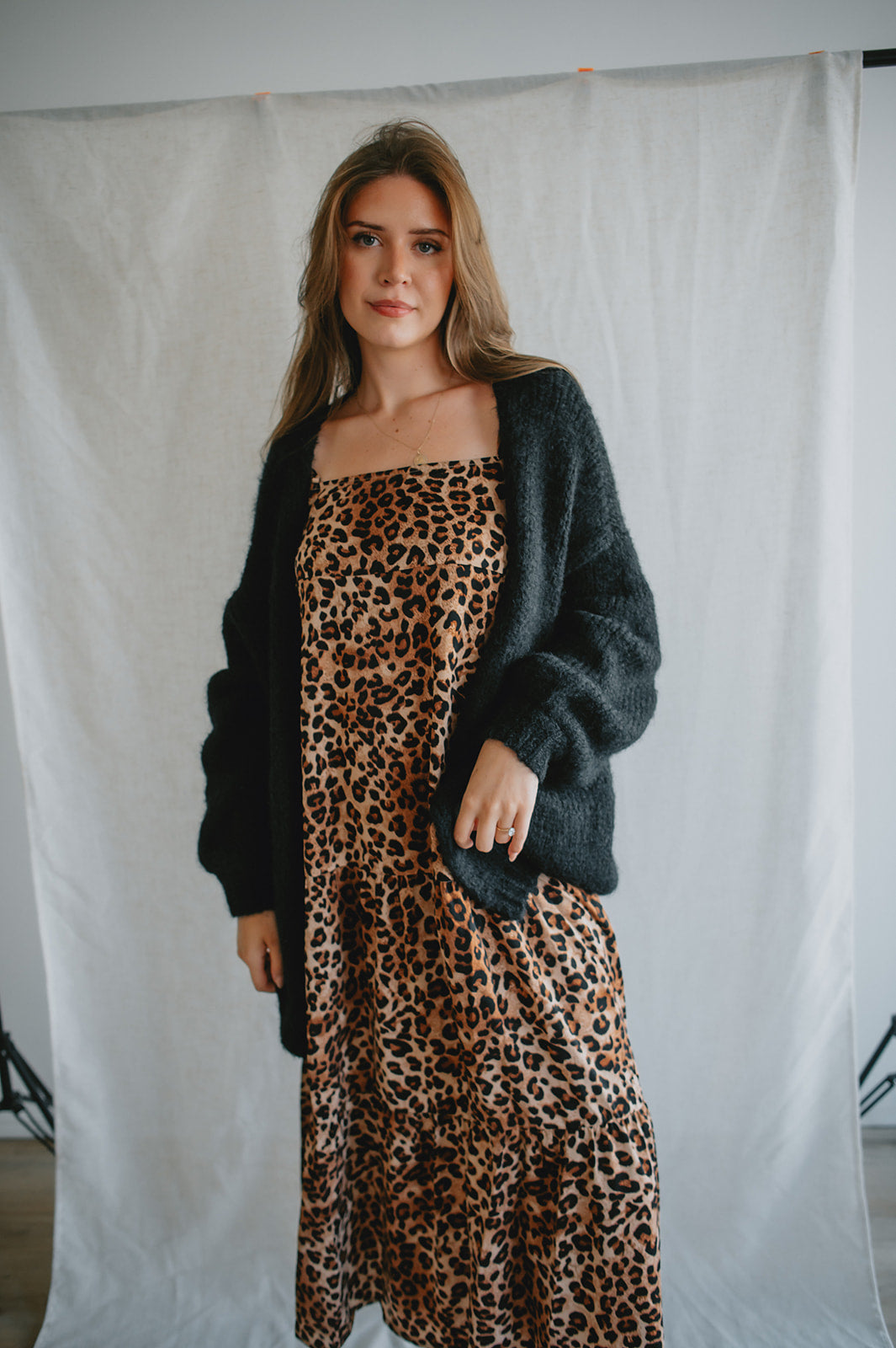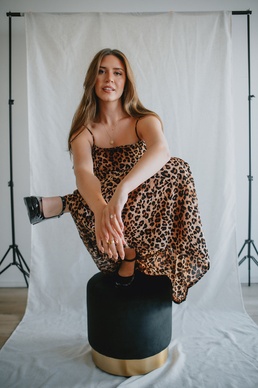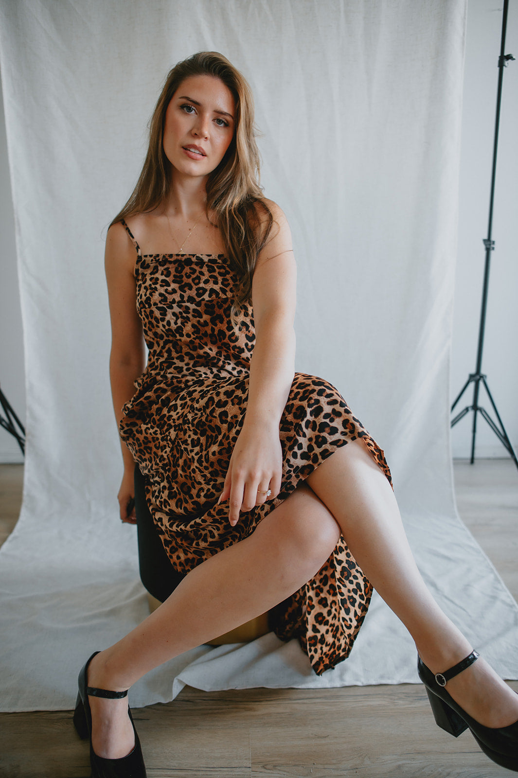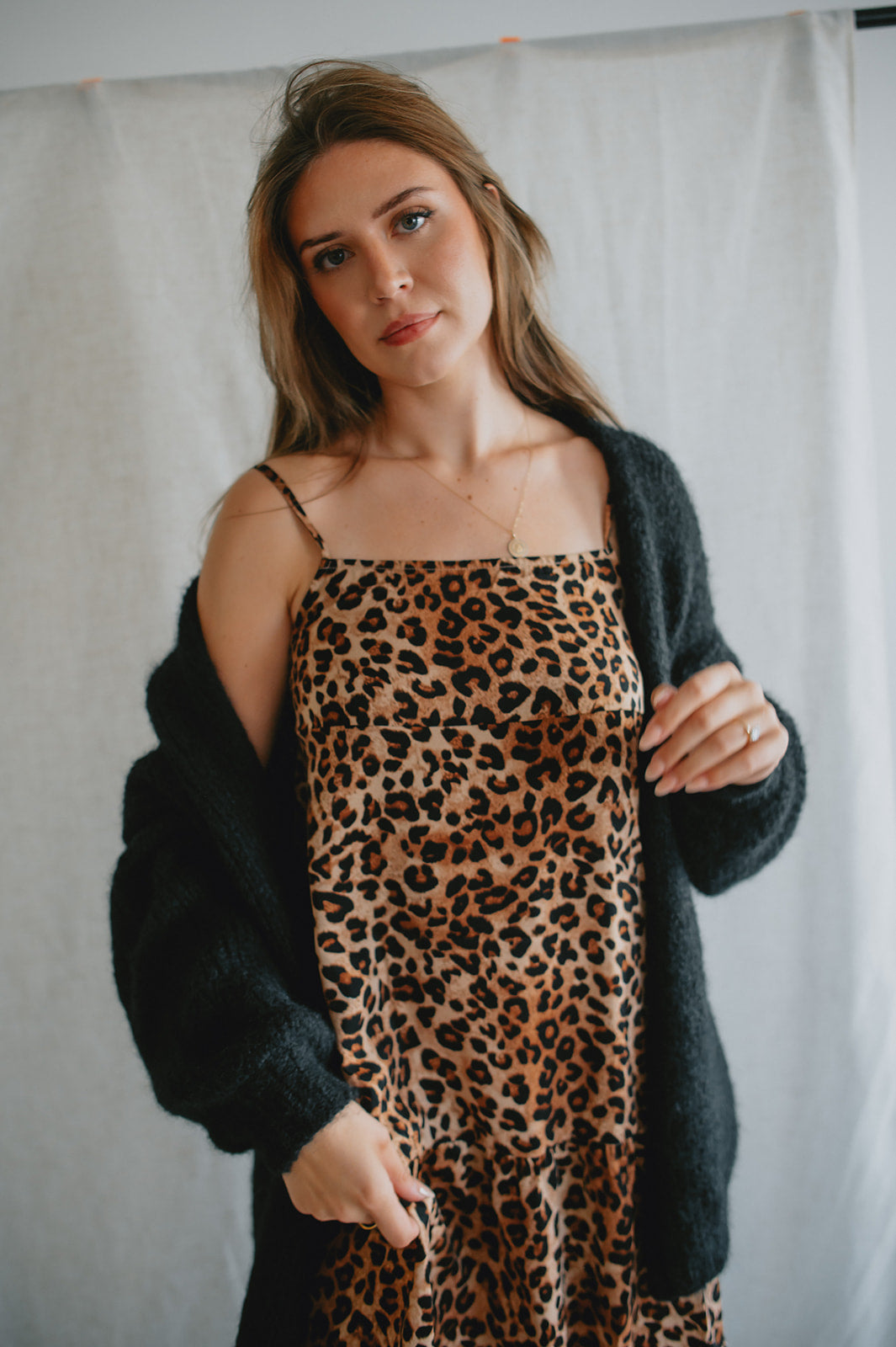 Turn heads in the Velora Satin Dress, designed to make a statement wherever you go. Crafted from smooth, high-shine satin with a subtle leopard print, this dress drapes beautifully over the body for a flattering, fluid silhouette. The square neckline and delicate thin straps create a clean, modern shape that frames the collarbone and shoulders with effortless elegance.