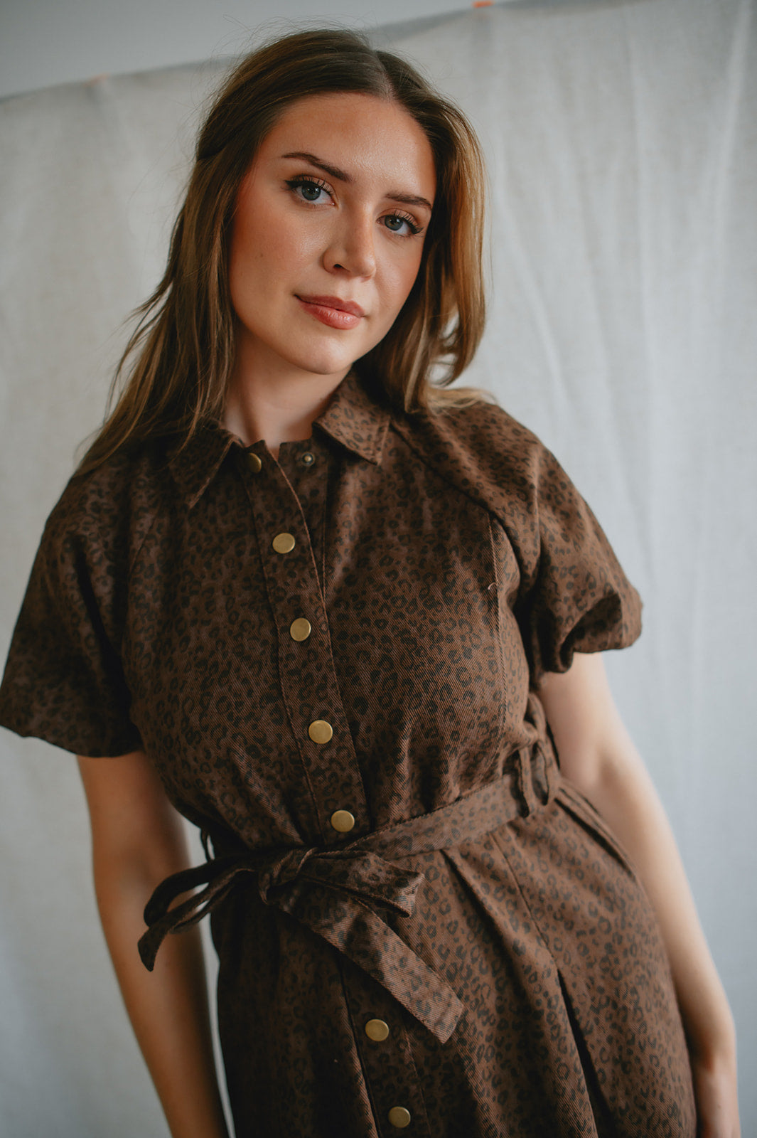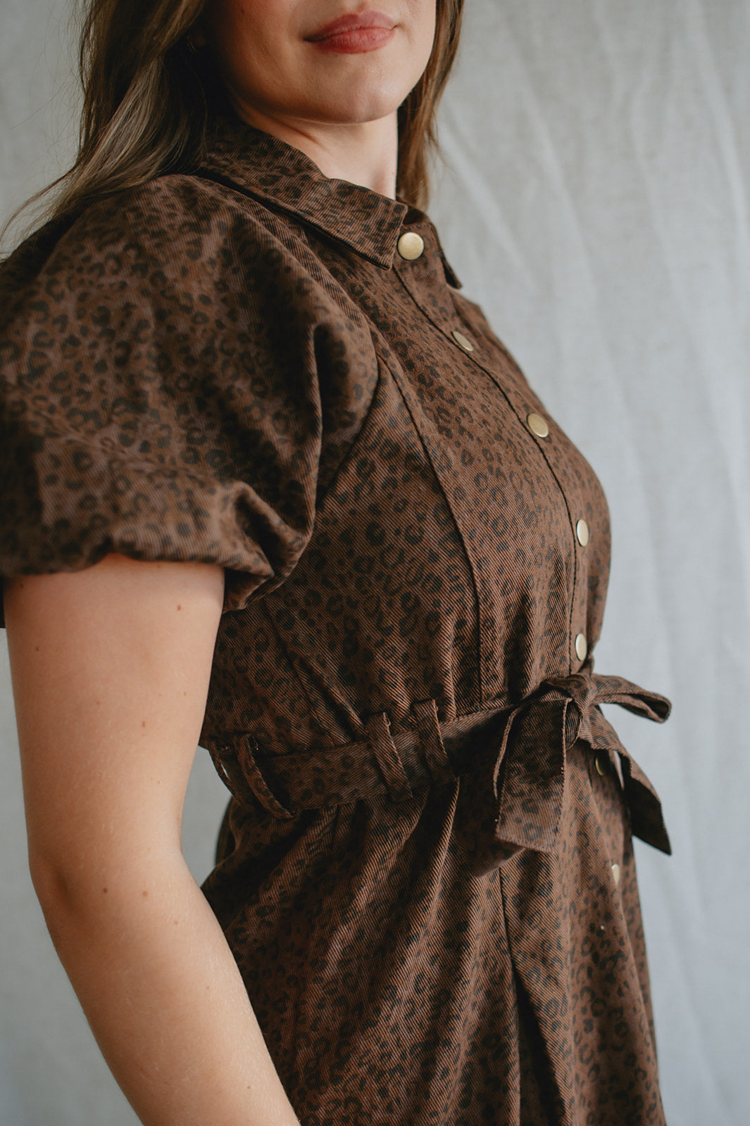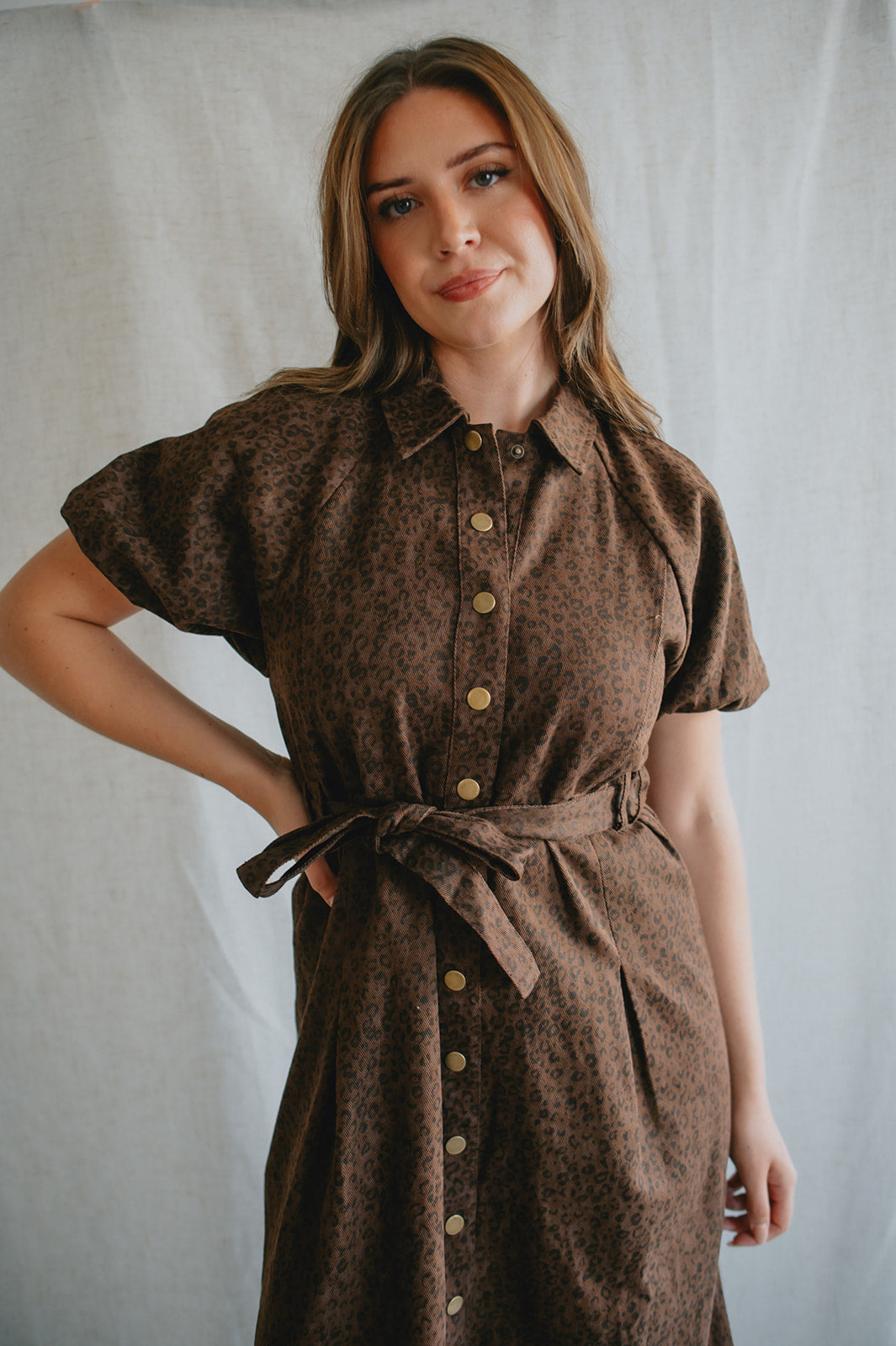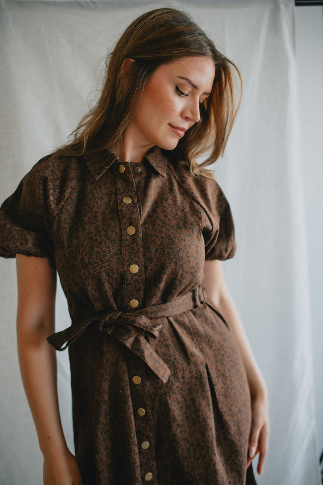 Make a bold statement with this effortlessly chic leopard print midi dress. Designed with a structured collared neckline and a full button-down front, it blends classic shirting details with standout style. A self-tie waist cinches the silhouette for a flattering, customizable fit, while elasticated sleeve cuffs add soft volume and comfort.