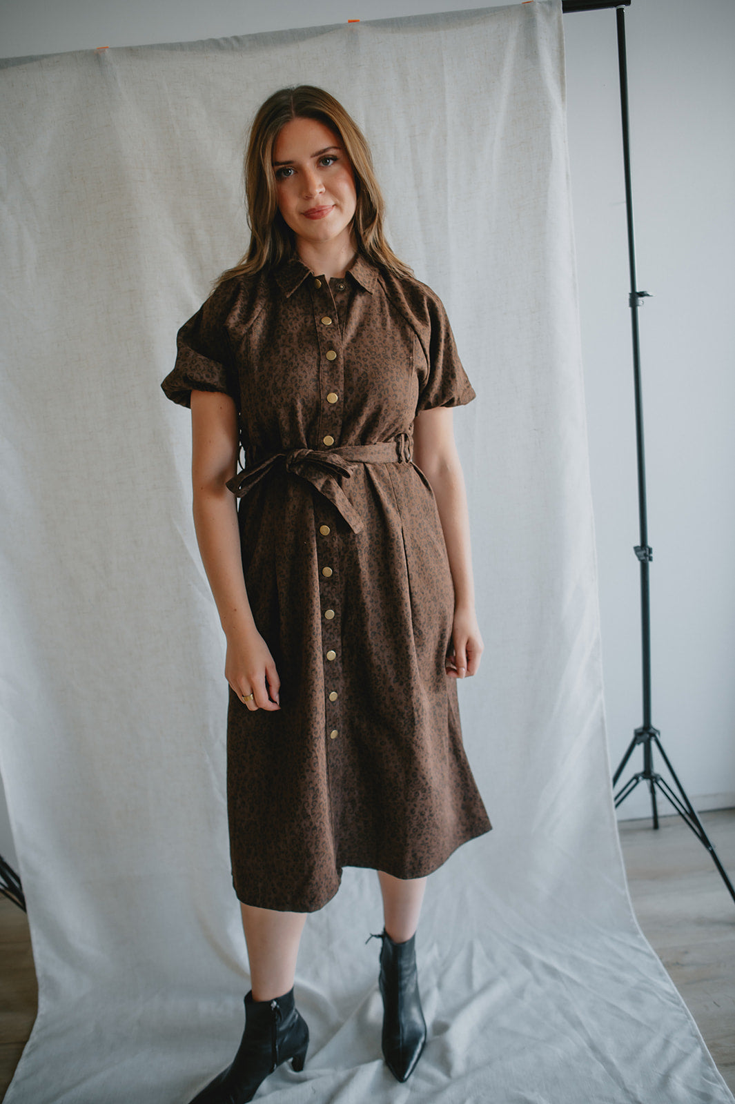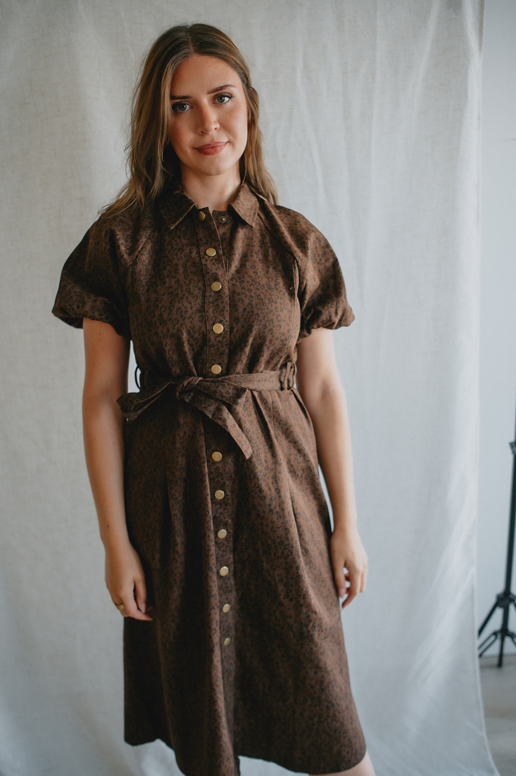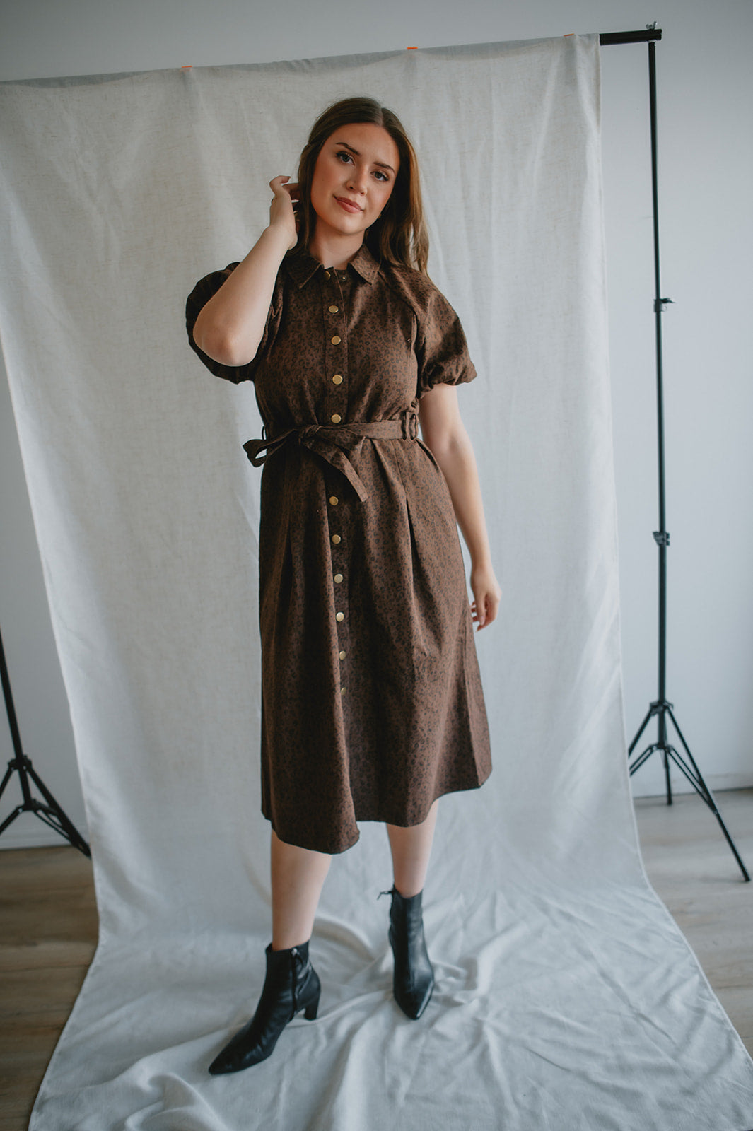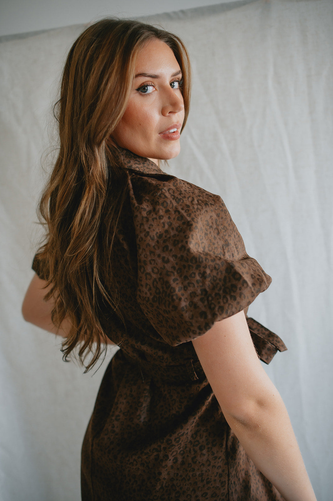 Make a bold statement with this effortlessly chic leopard print midi dress. Designed with a structured collared neckline and a full button-down front, it blends classic shirting details with standout style. A self-tie waist cinches the silhouette for a flattering, customizable fit, while elasticated sleeve cuffs add soft volume and comfort.