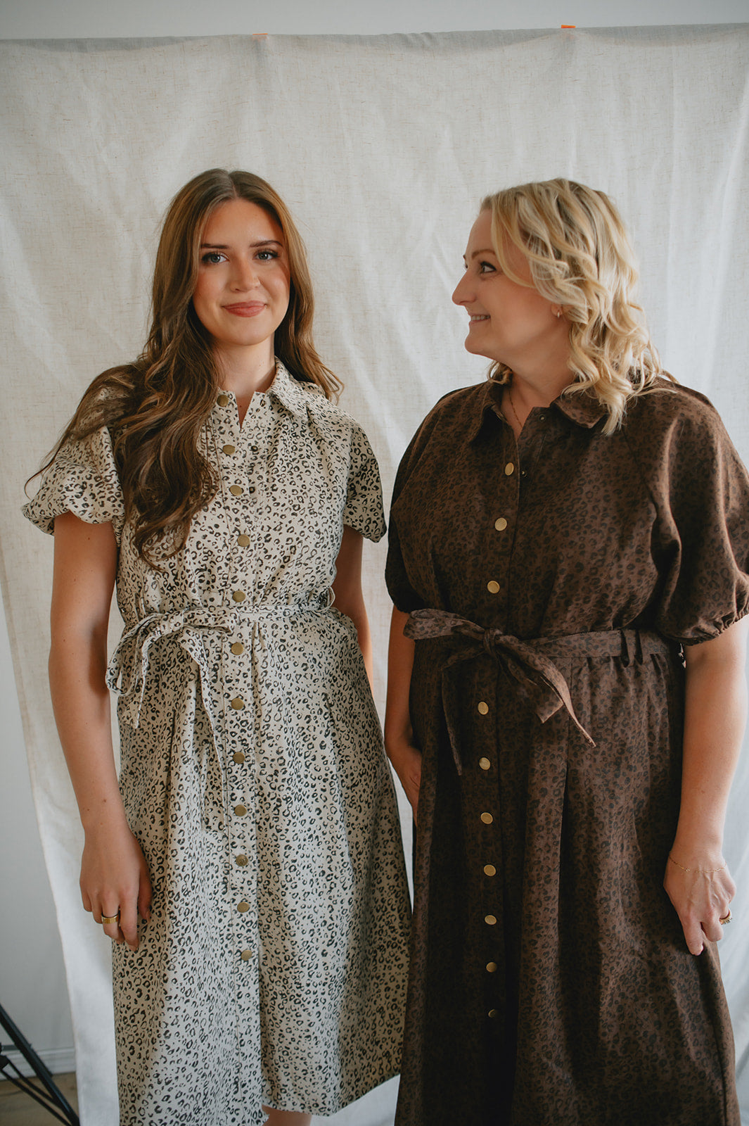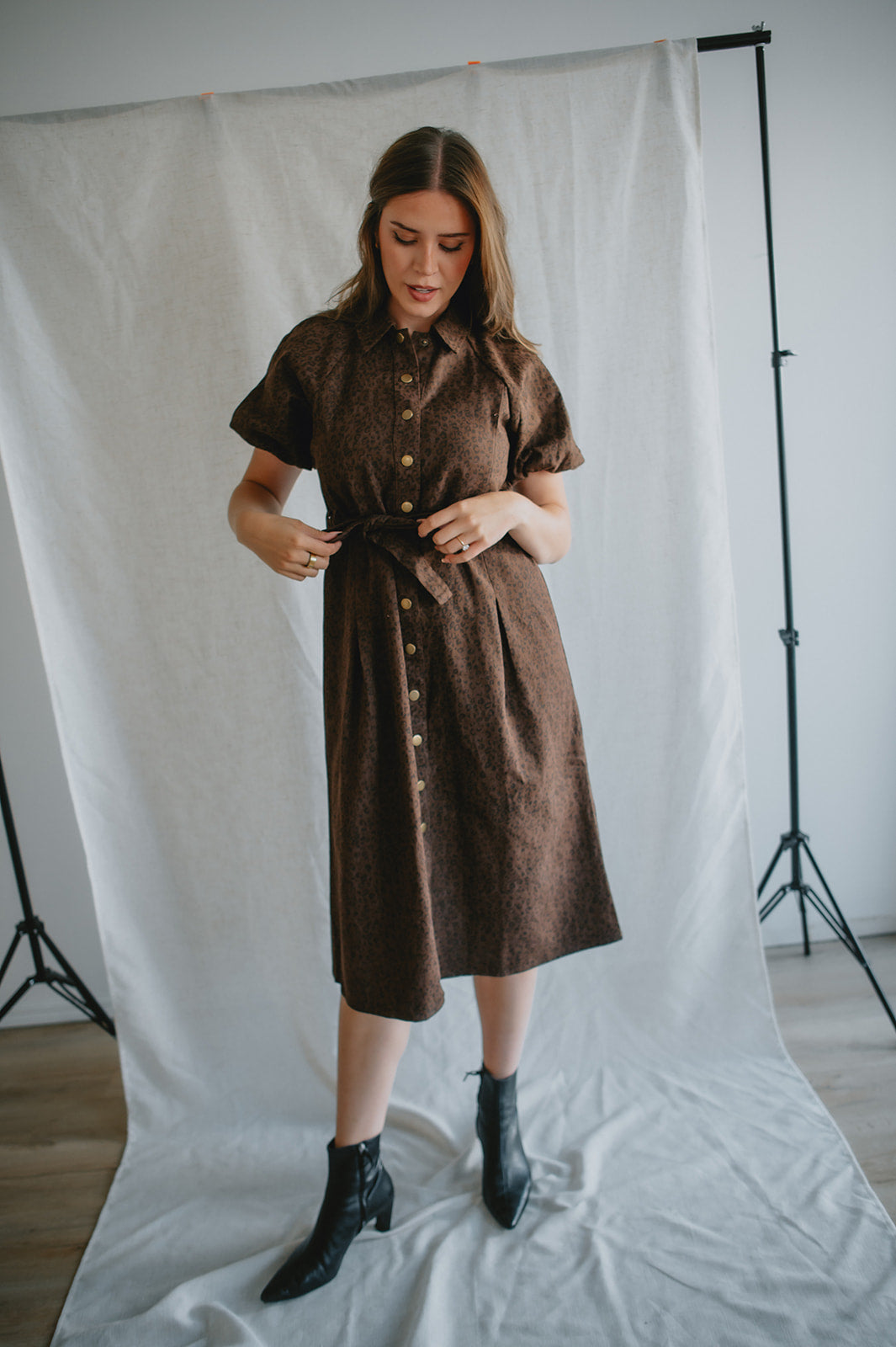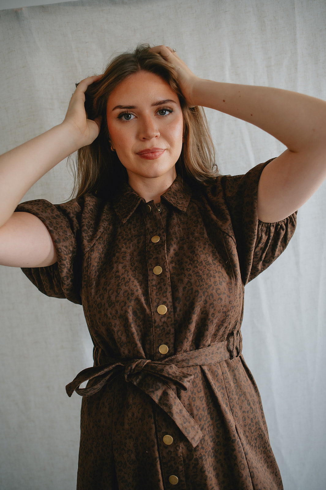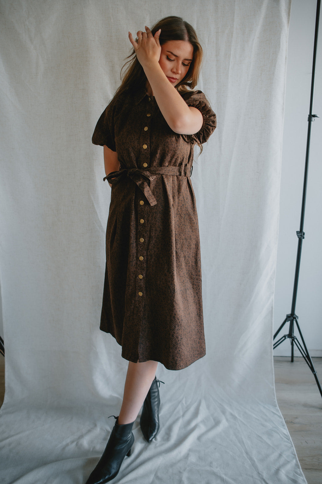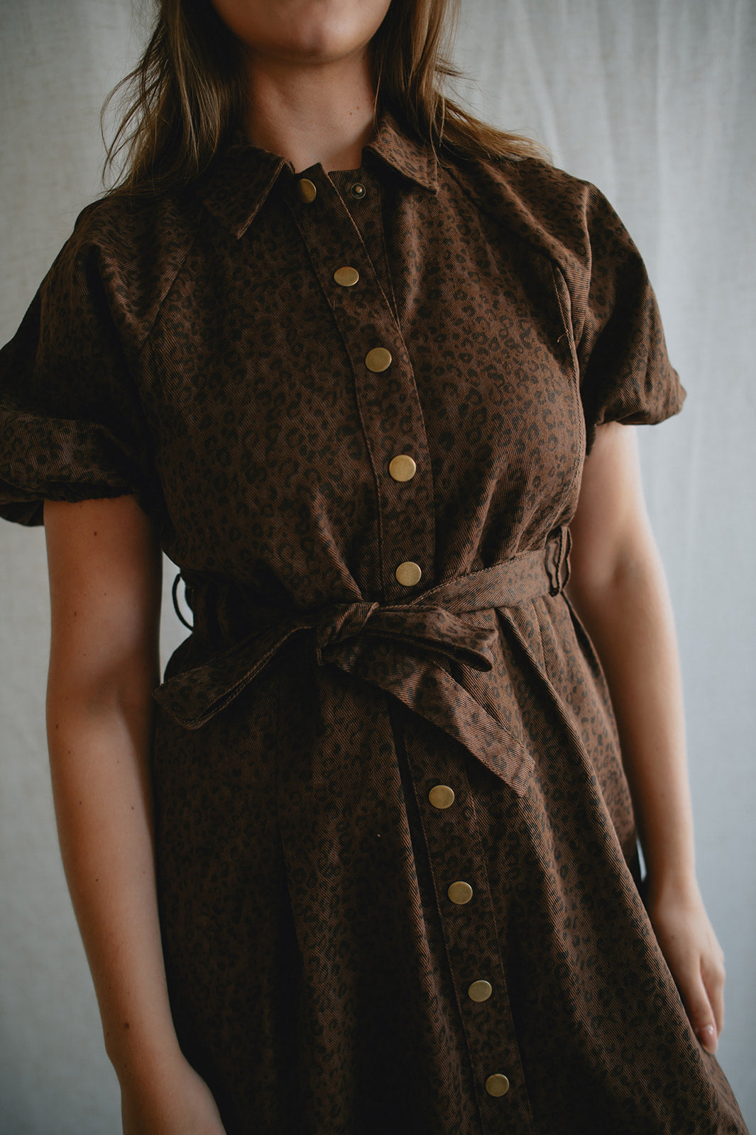 Make a bold statement with this effortlessly chic leopard print midi dress. Designed with a structured collared neckline and a full button-down front, it blends classic shirting details with standout style. A self-tie waist cinches the silhouette for a flattering, customizable fit, while elasticated sleeve cuffs add soft volume and comfort.