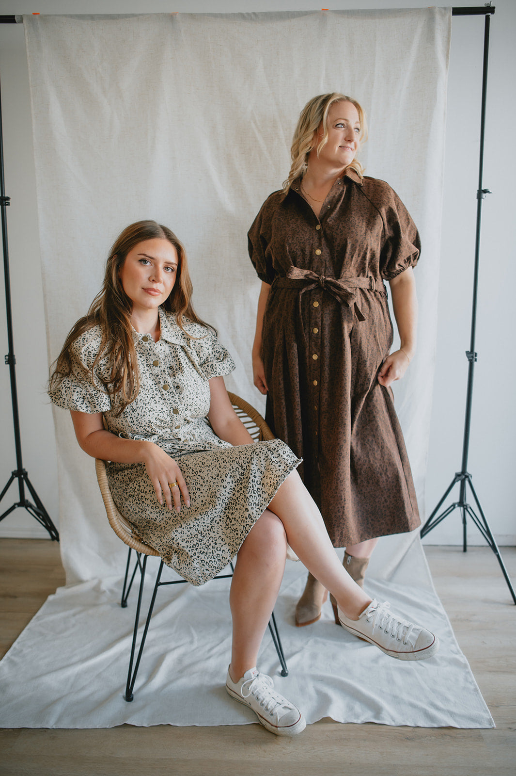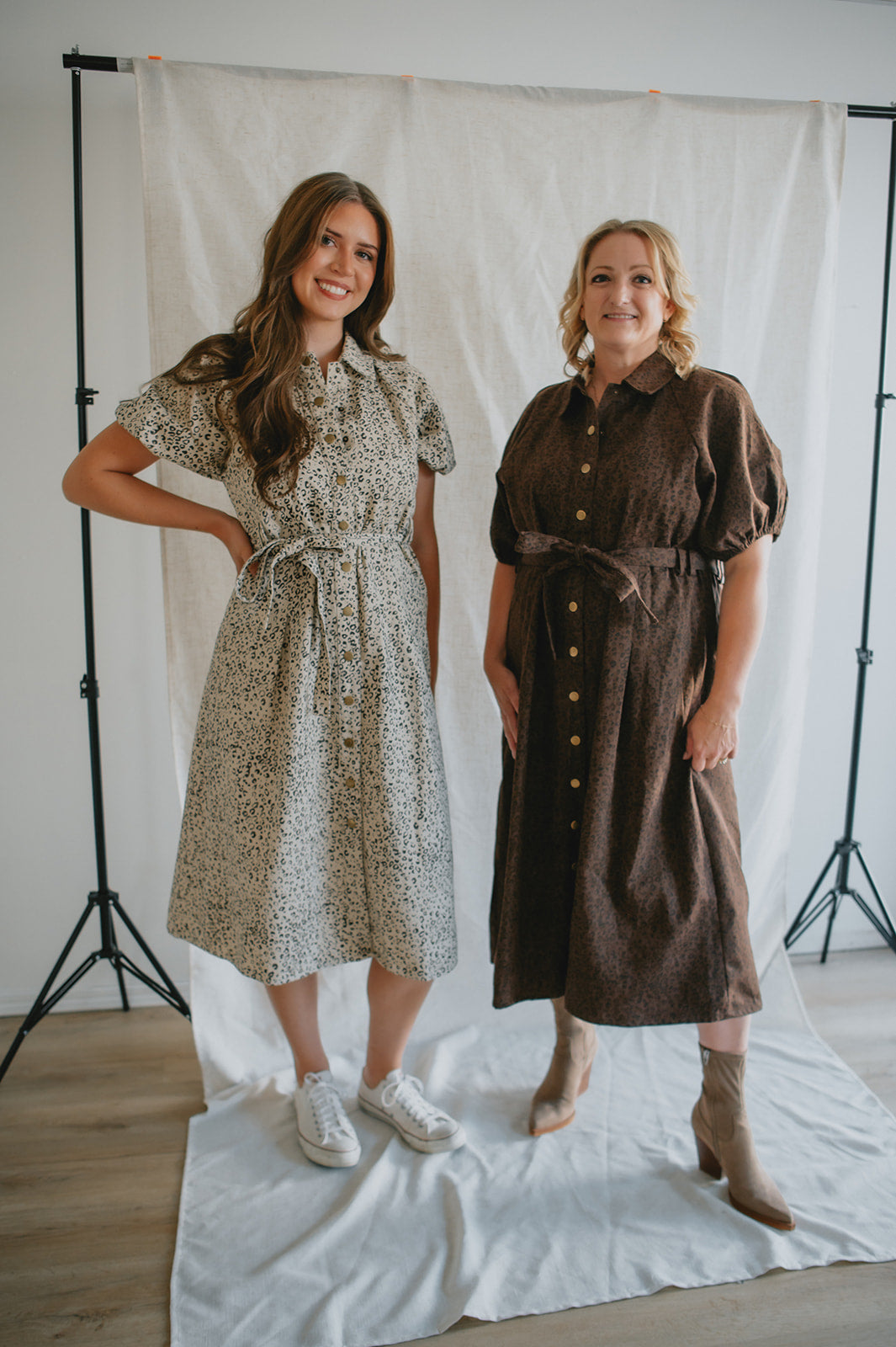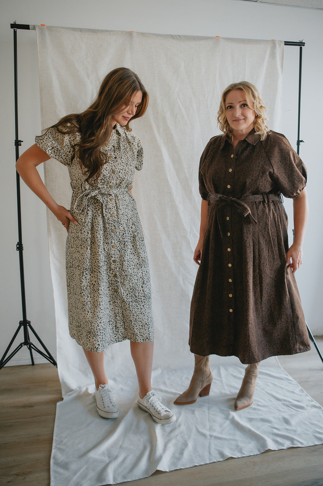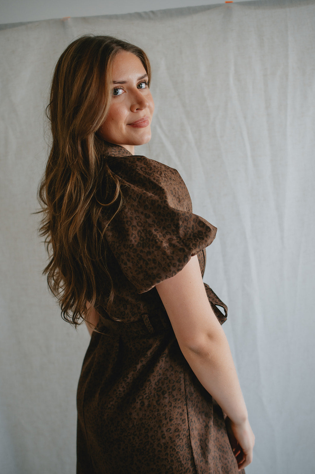 Make a bold statement with this effortlessly chic leopard print midi dress. Designed with a structured collared neckline and a full button-down front, it blends classic shirting details with standout style. A self-tie waist cinches the silhouette for a flattering, customizable fit, while elasticated sleeve cuffs add soft volume and comfort.