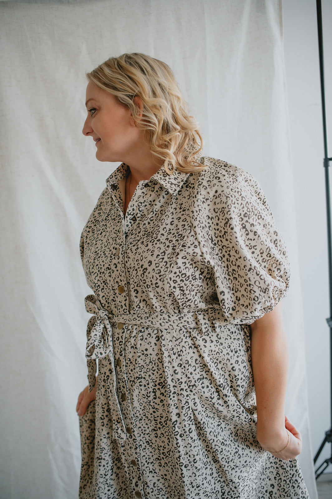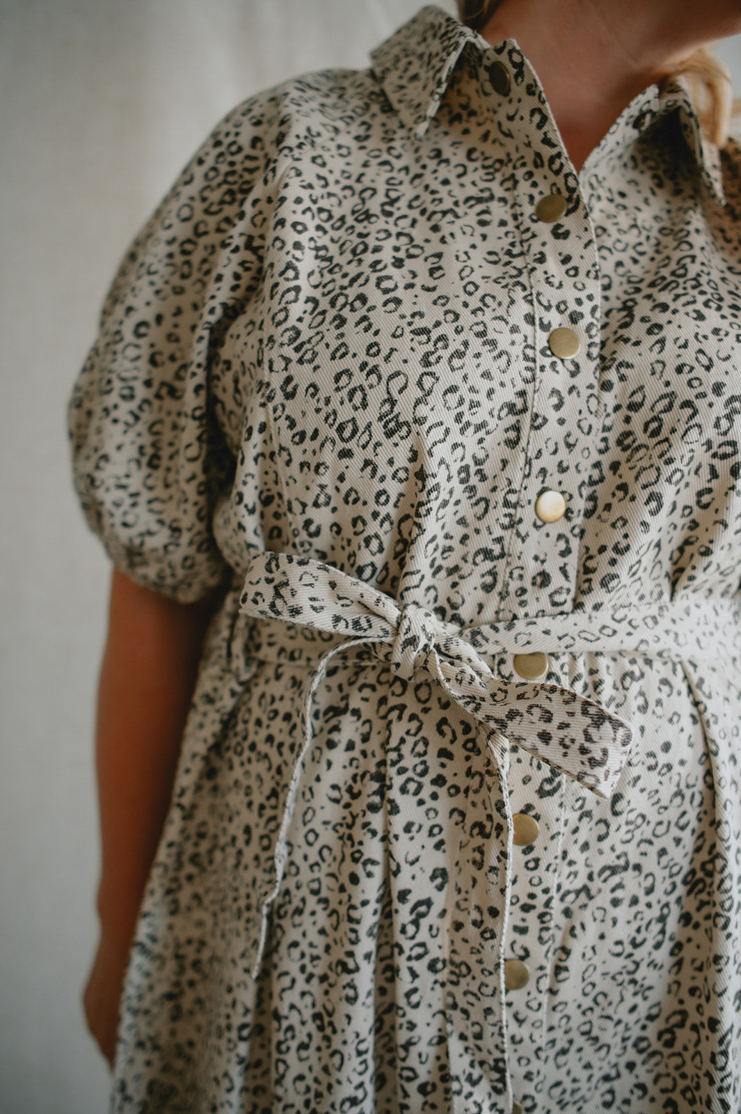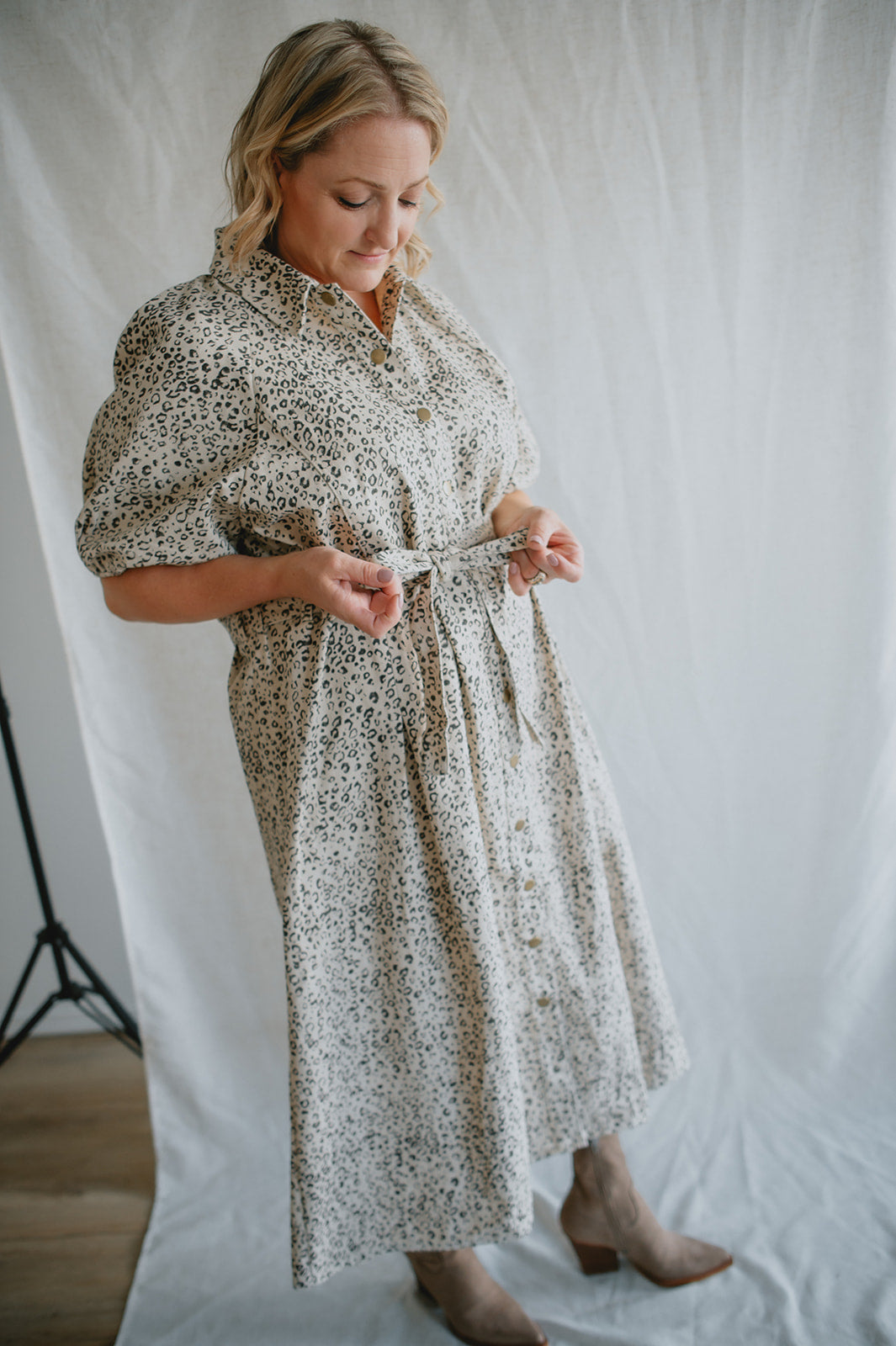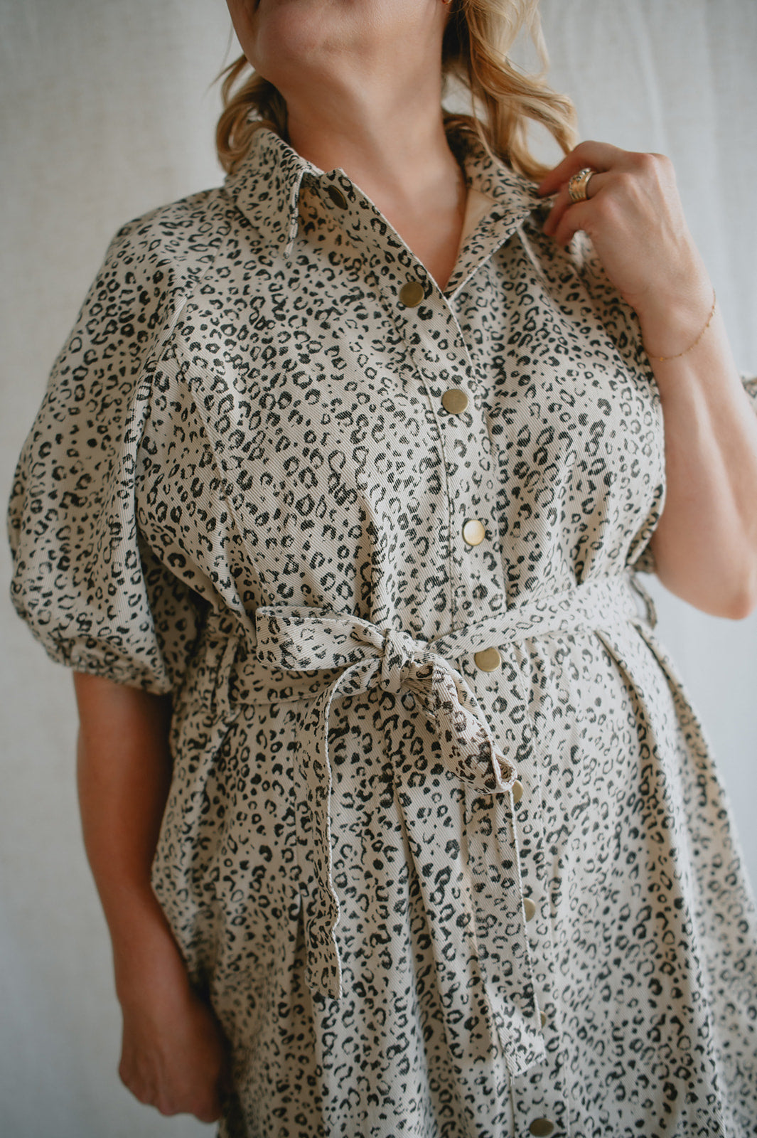 Make a bold statement with this effortlessly chic leopard print midi dress. Designed with a structured collared neckline and a full button-down front, it blends classic shirting details with standout style. A self-tie waist cinches the silhouette for a flattering, customizable fit, while elasticated sleeve cuffs add soft volume and comfort.