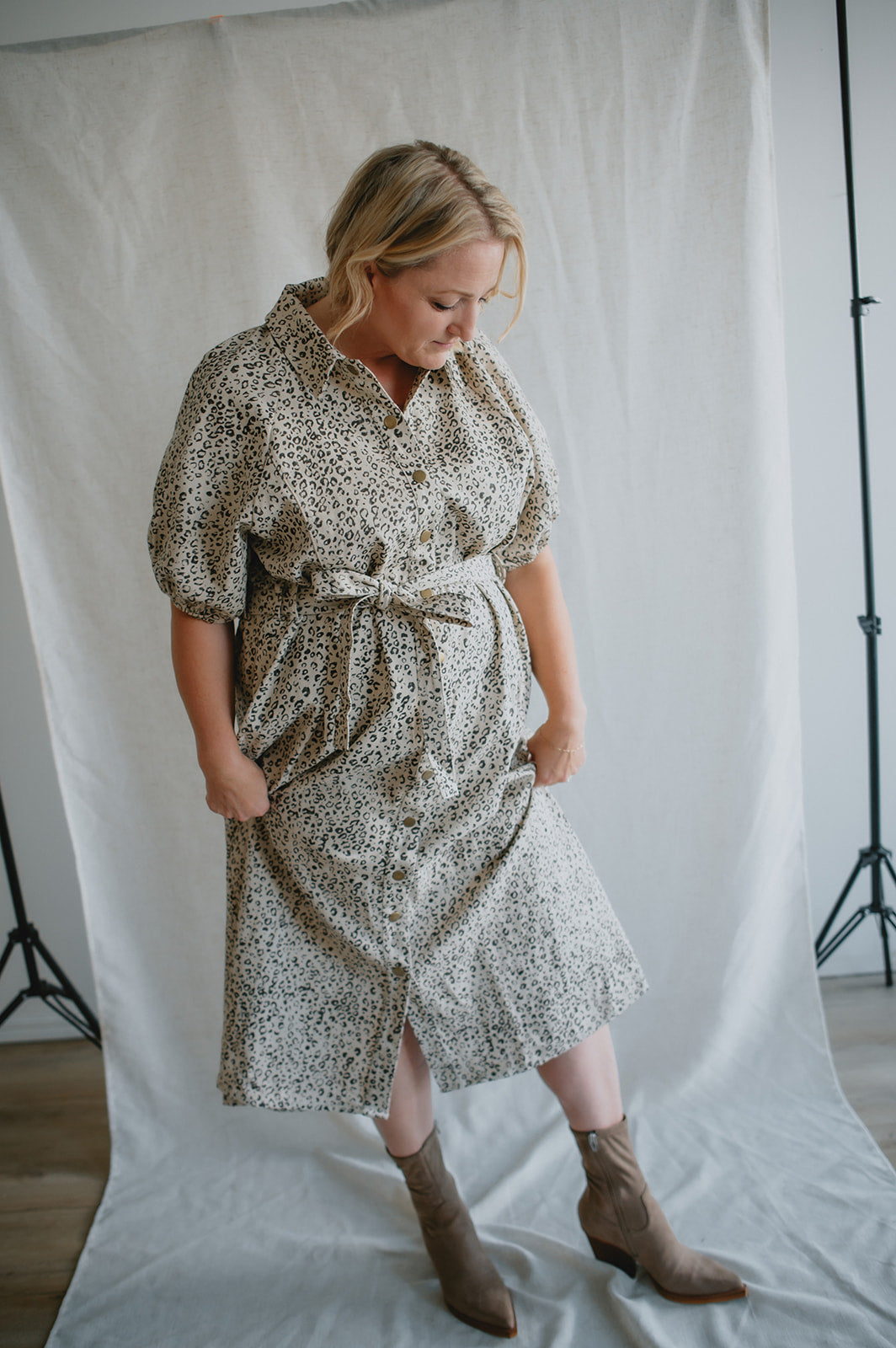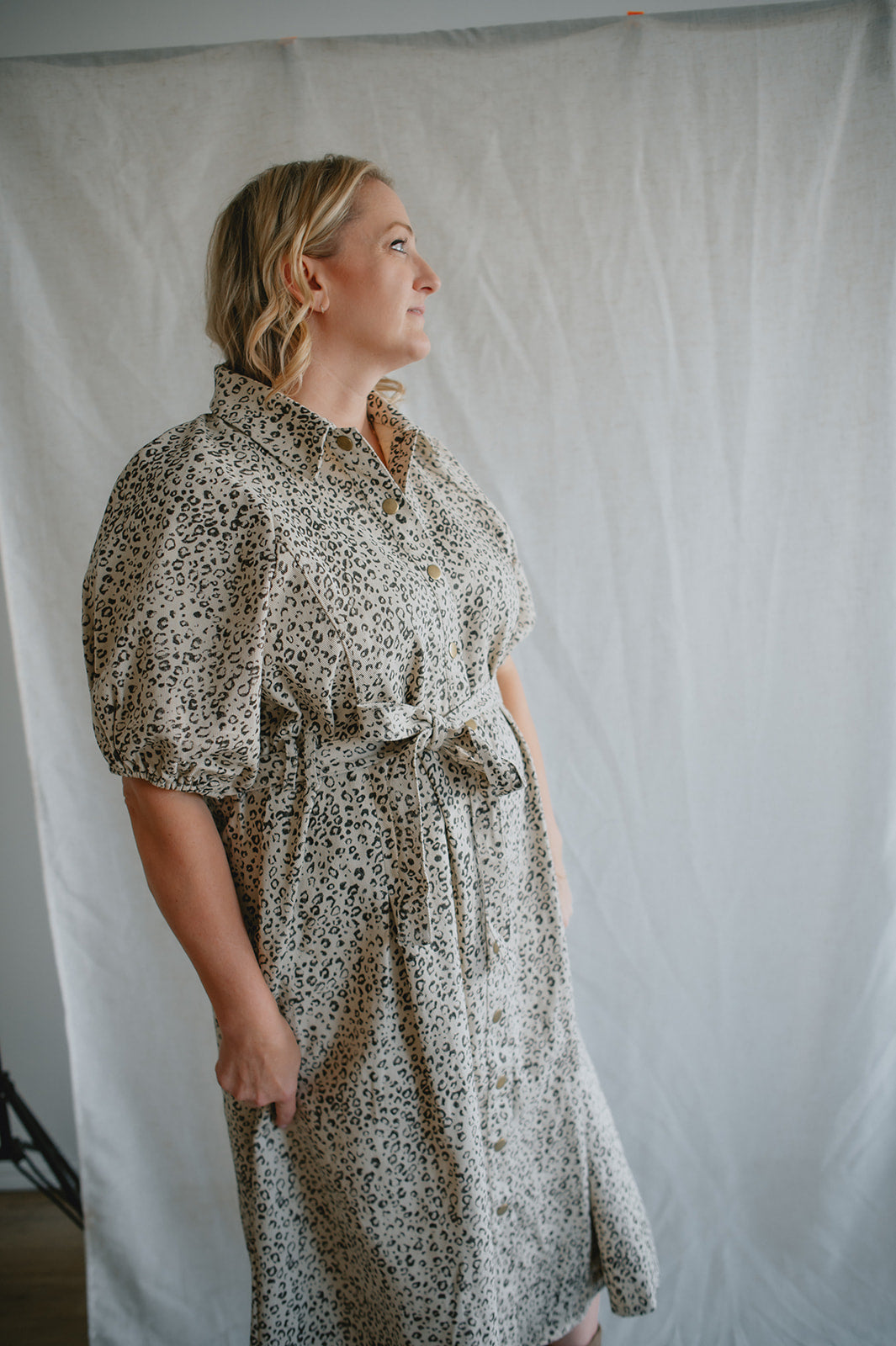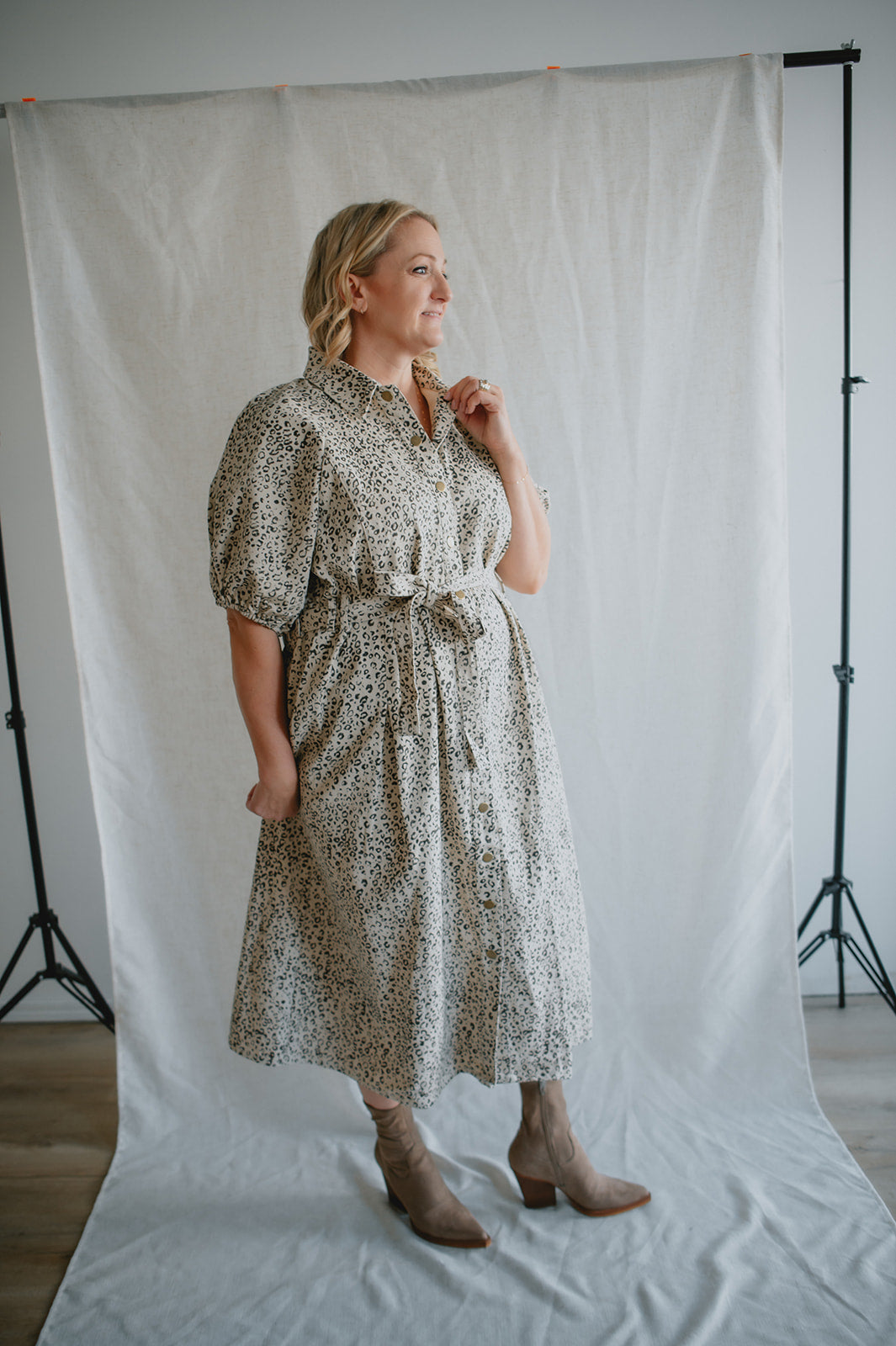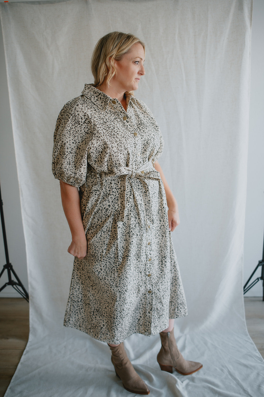 Make a bold statement with this effortlessly chic leopard print midi dress. Designed with a structured collared neckline and a full button-down front, it blends classic shirting details with standout style. A self-tie waist cinches the silhouette for a flattering, customizable fit, while elasticated sleeve cuffs add soft volume and comfort.