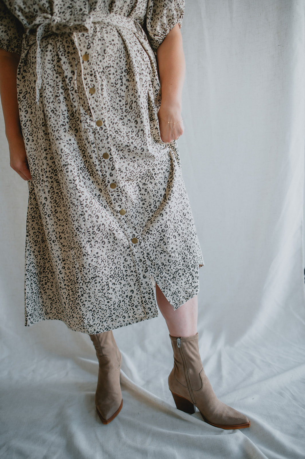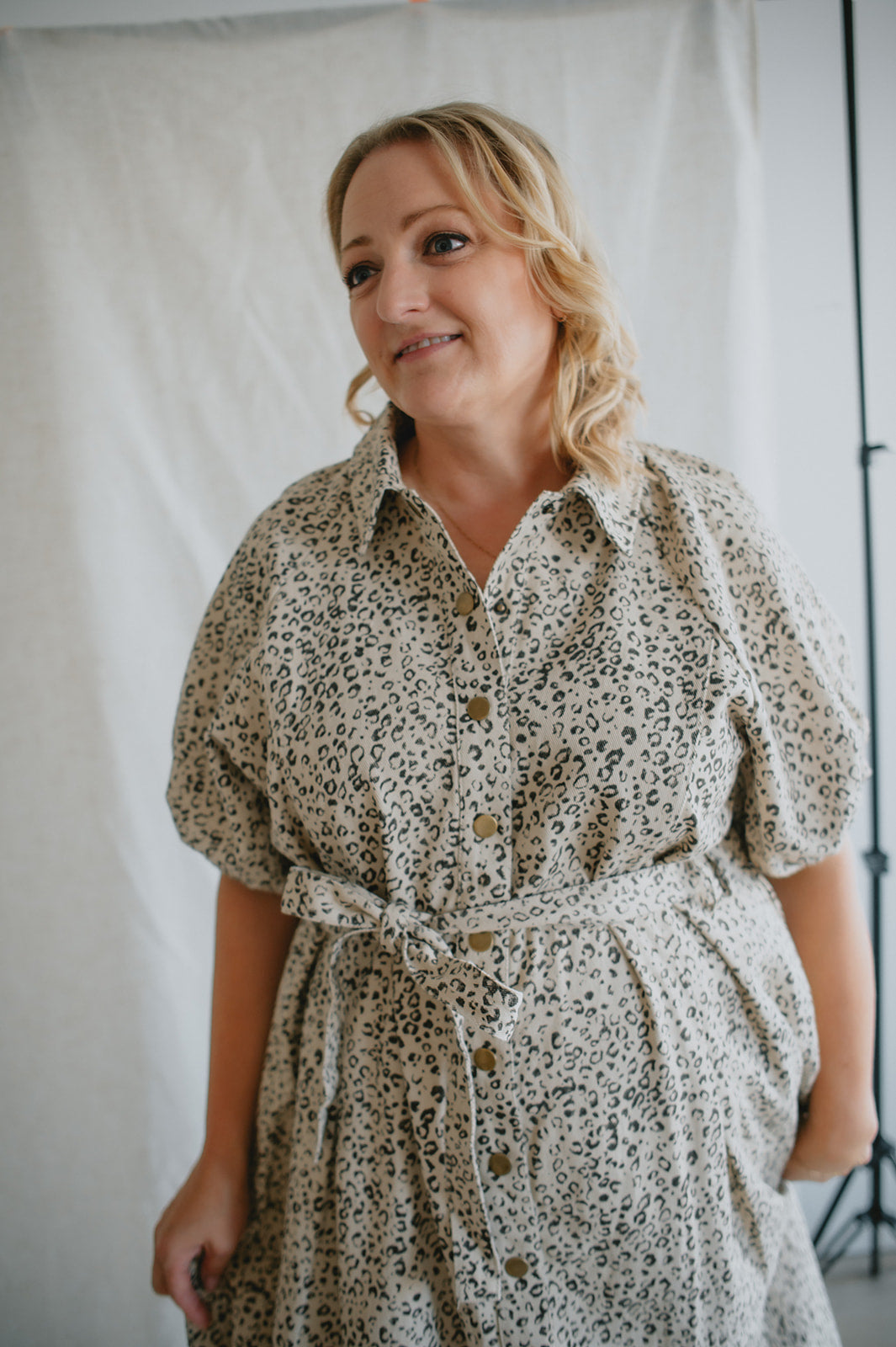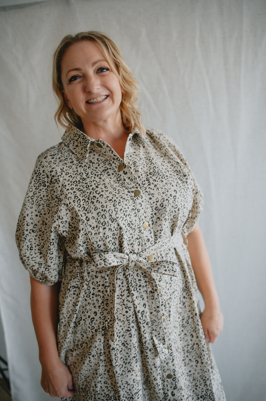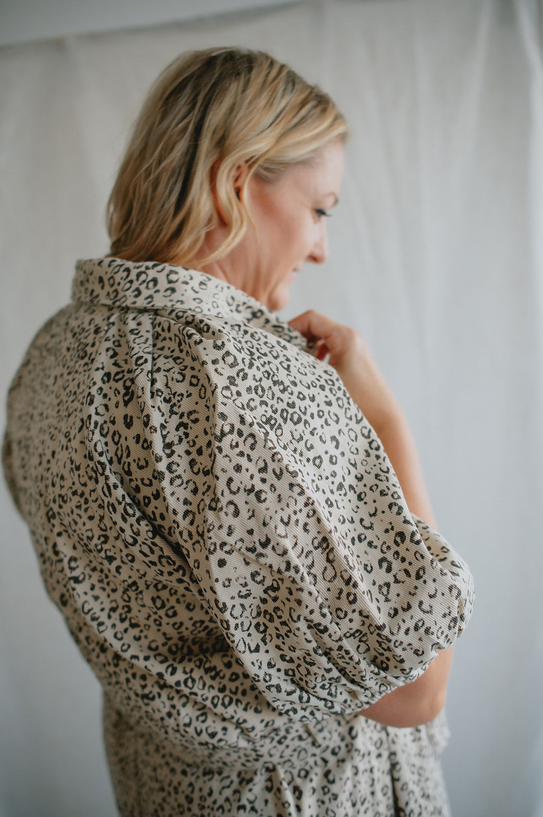 Make a bold statement with this effortlessly chic leopard print midi dress. Designed with a structured collared neckline and a full button-down front, it blends classic shirting details with standout style. A self-tie waist cinches the silhouette for a flattering, customizable fit, while elasticated sleeve cuffs add soft volume and comfort.