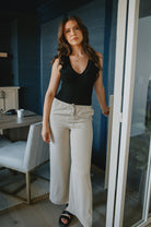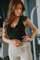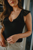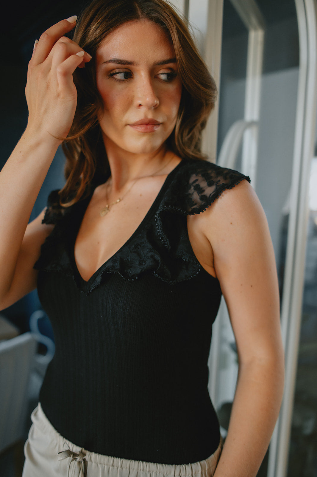 The Zoella Bodysuit is a simple knit, made from a soft rib. It features a lace ruffle around the neck, and tucks in perfectly with jeans, trousers, or shorts!