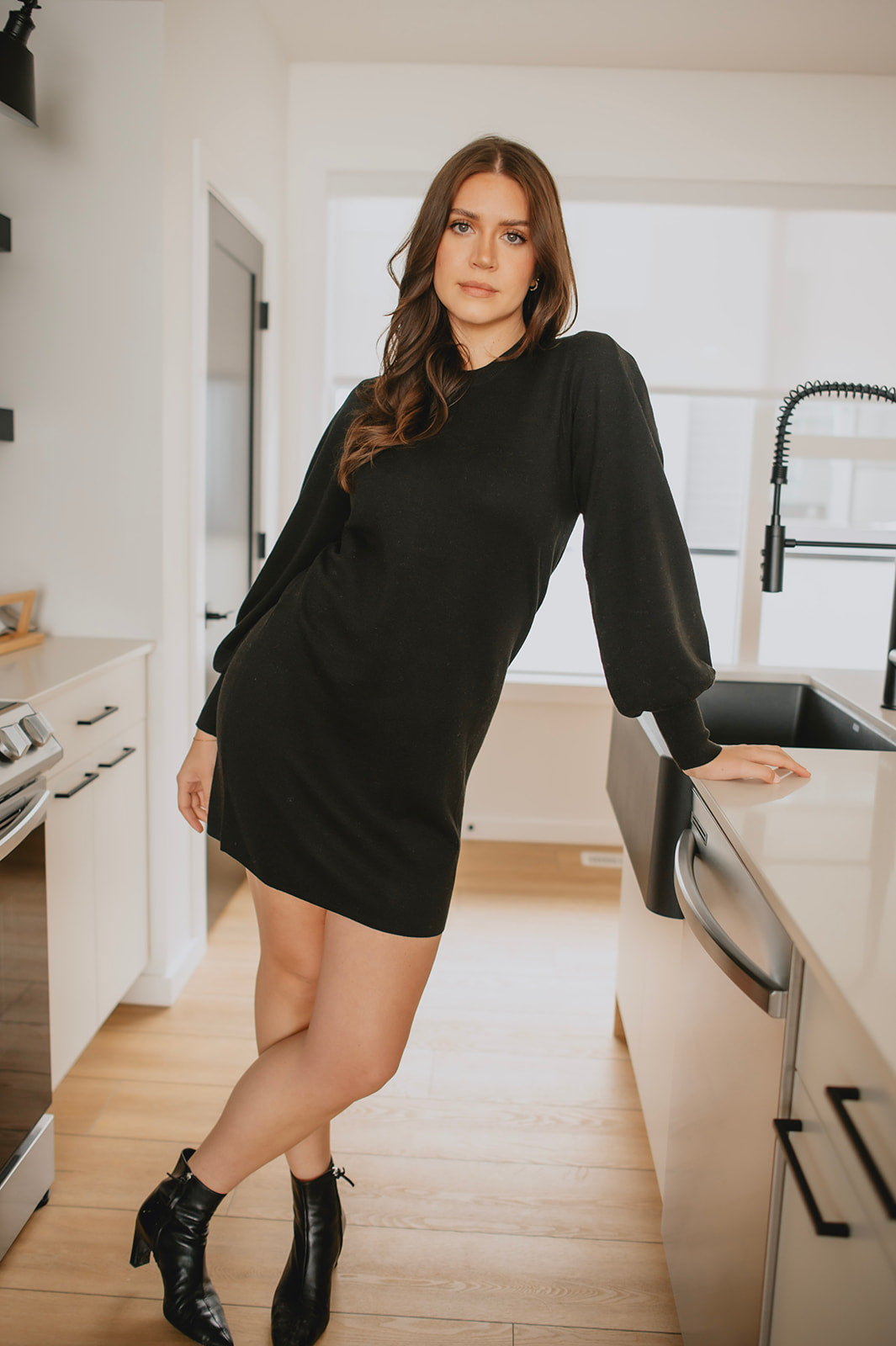 The Sammy Sweater Dress has a classic fit and cuts at the knee. This dress has wide balloon sleeves that fit tightly at the end. We have carried this dress season after season - and it never disappoints. Wear by itself, with tights or over leggings. This sweater dress would look great with sneakers, heel or boots.
