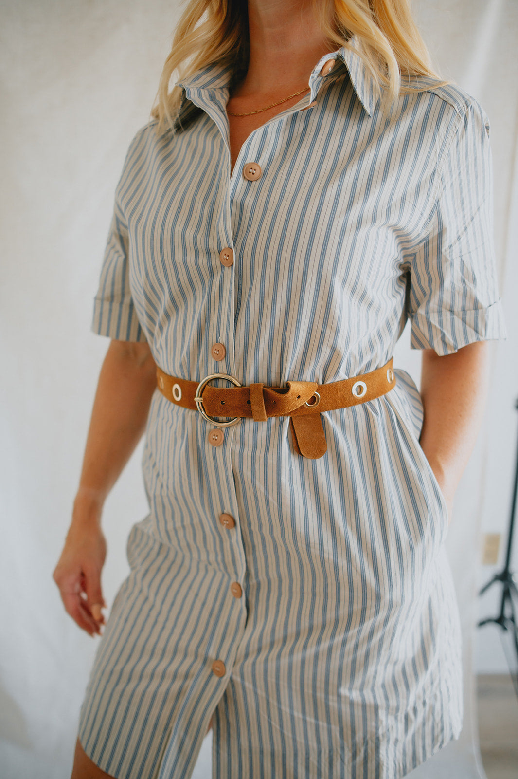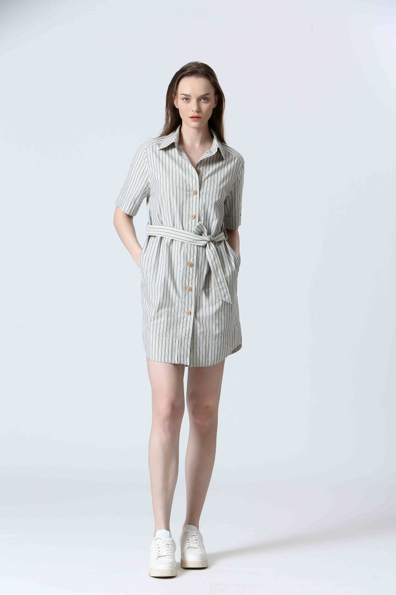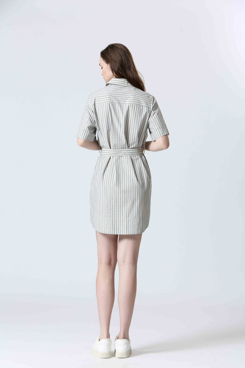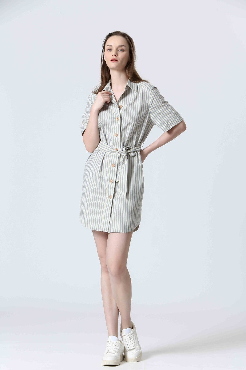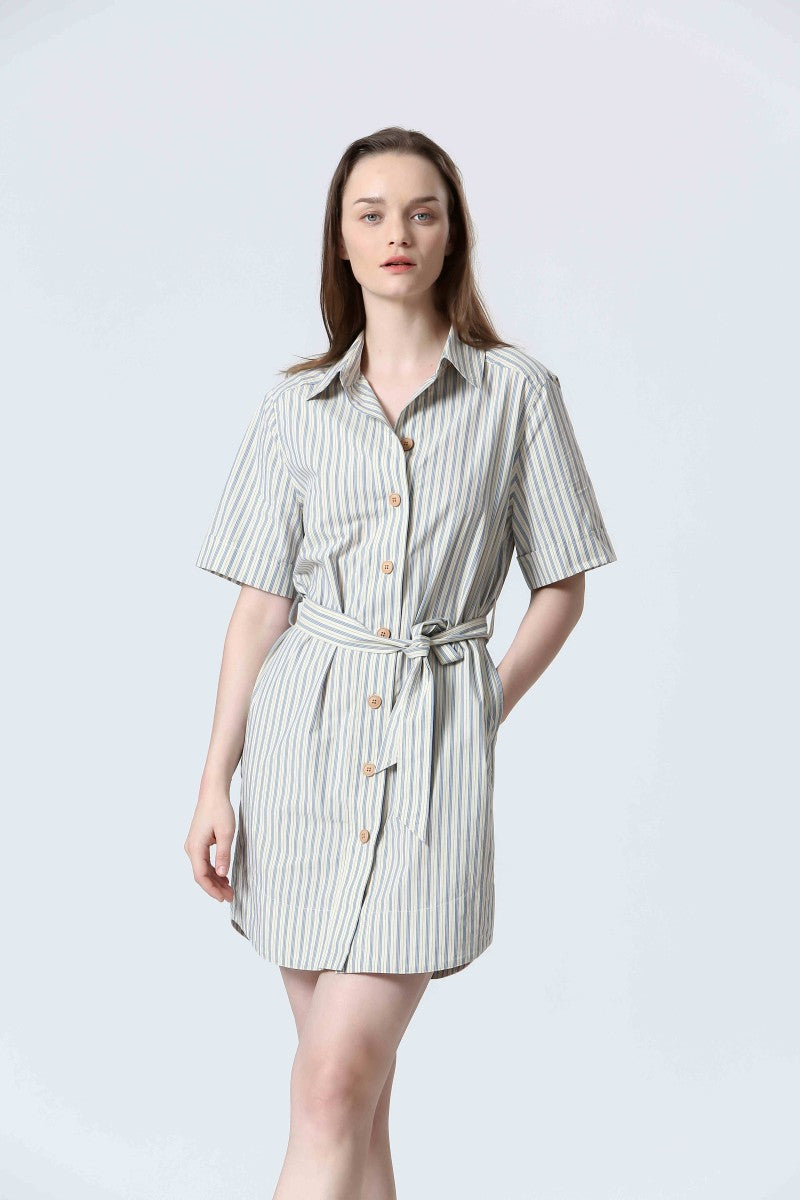 The Alexa Striped Mini Shirtdress is your new go-to for effortless charm. Made from 100% cotton, it features classic shirt styling with a collared neckline, front button closure, cuffed short sleeves, and a rounded shirttail hem. The included tie belt cinches the waist for a flattering fit, while side pockets add everyday ease. Whether styled with sandals for a stroll through the park or elevated with platforms, it channels that perfectly undone French-girl vibe.