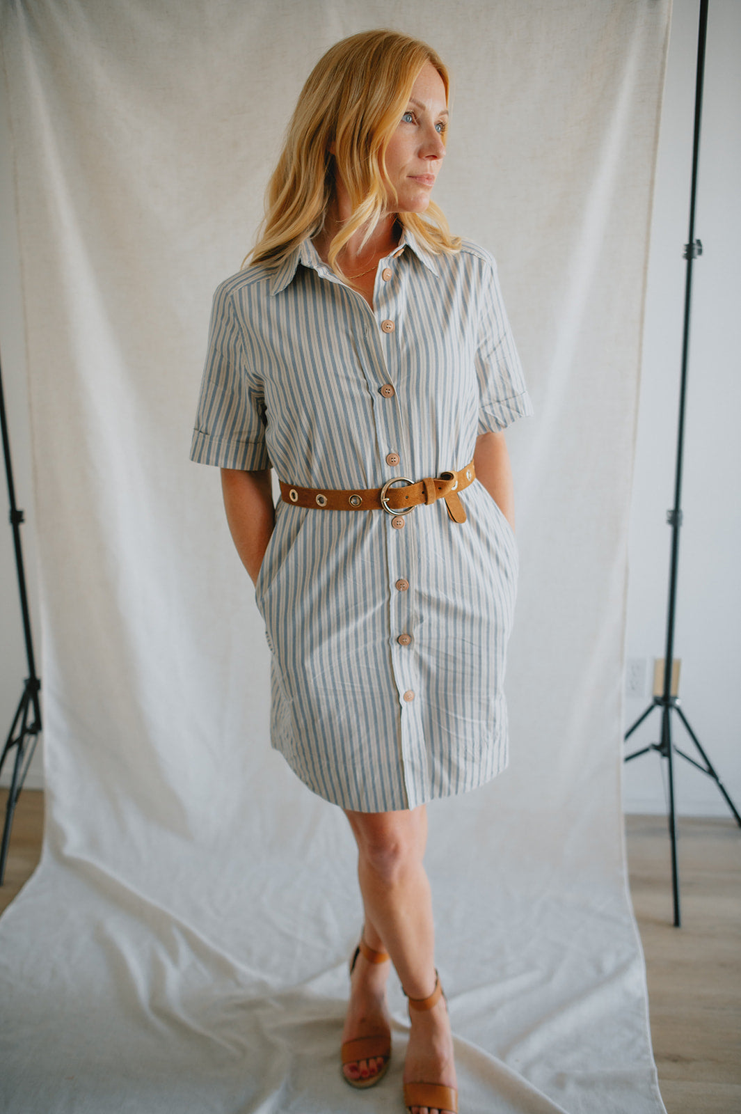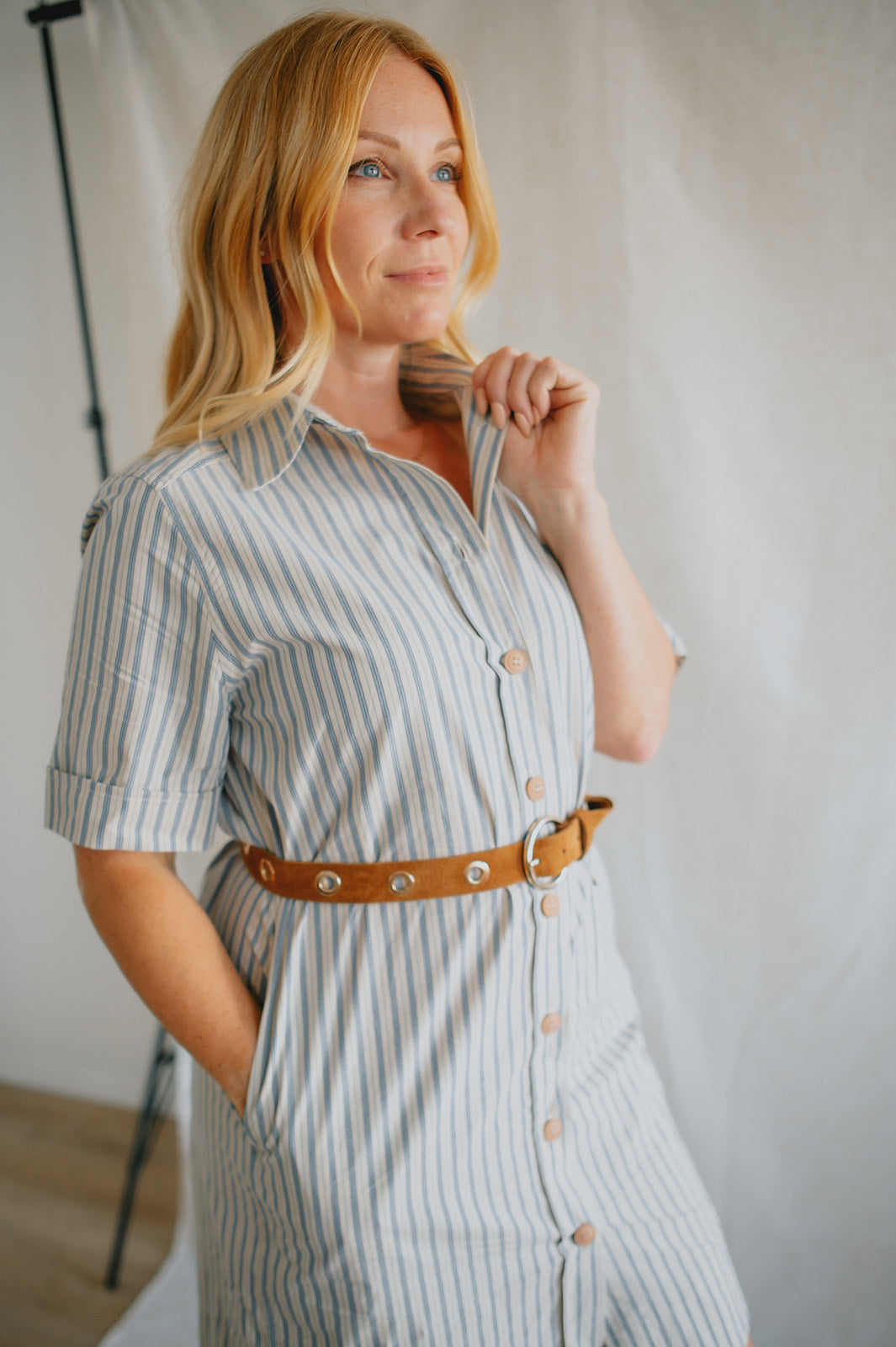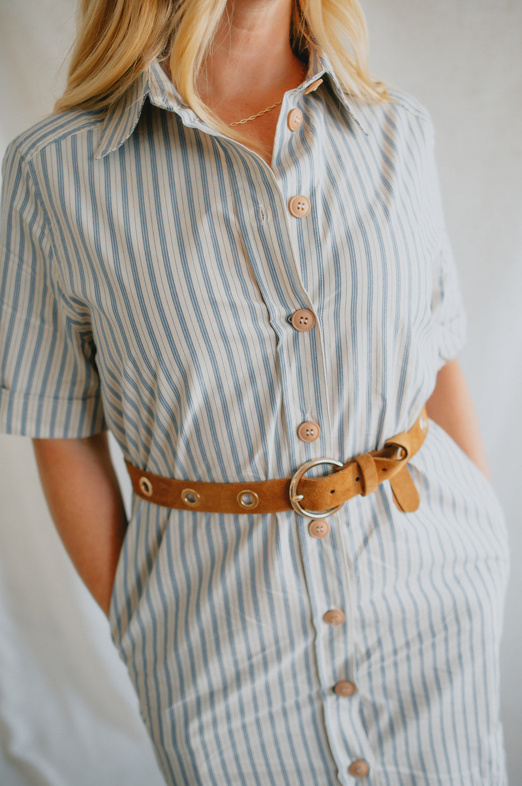 The Alexa Striped Mini Shirtdress is your new go-to for effortless charm. Made from 100% cotton, it features classic shirt styling with a collared neckline, front button closure, cuffed short sleeves, and a rounded shirttail hem. The included tie belt cinches the waist for a flattering fit, while side pockets add everyday ease. Whether styled with sandals for a stroll through the park or elevated with platforms, it channels that perfectly undone French-girl vibe.