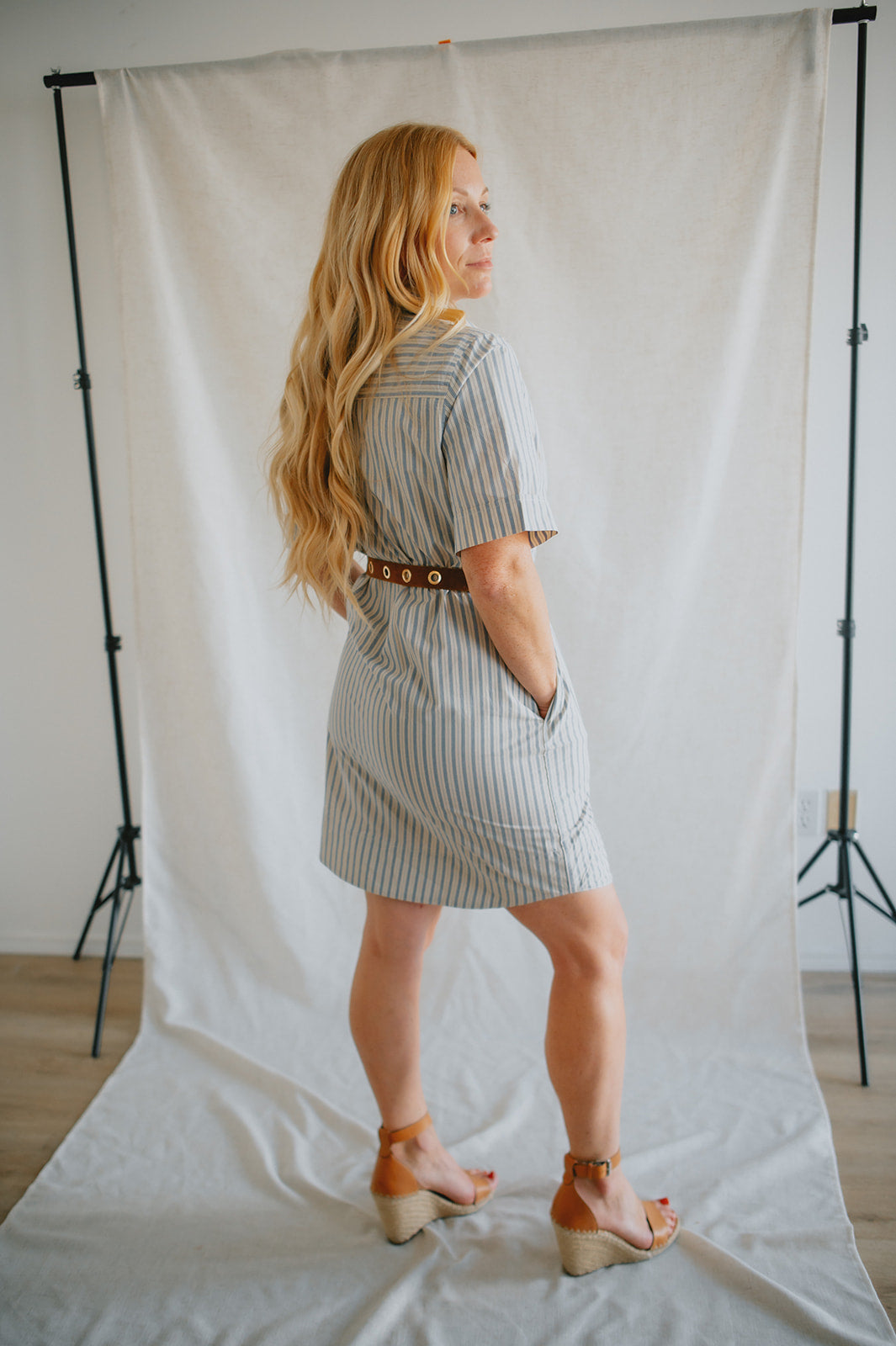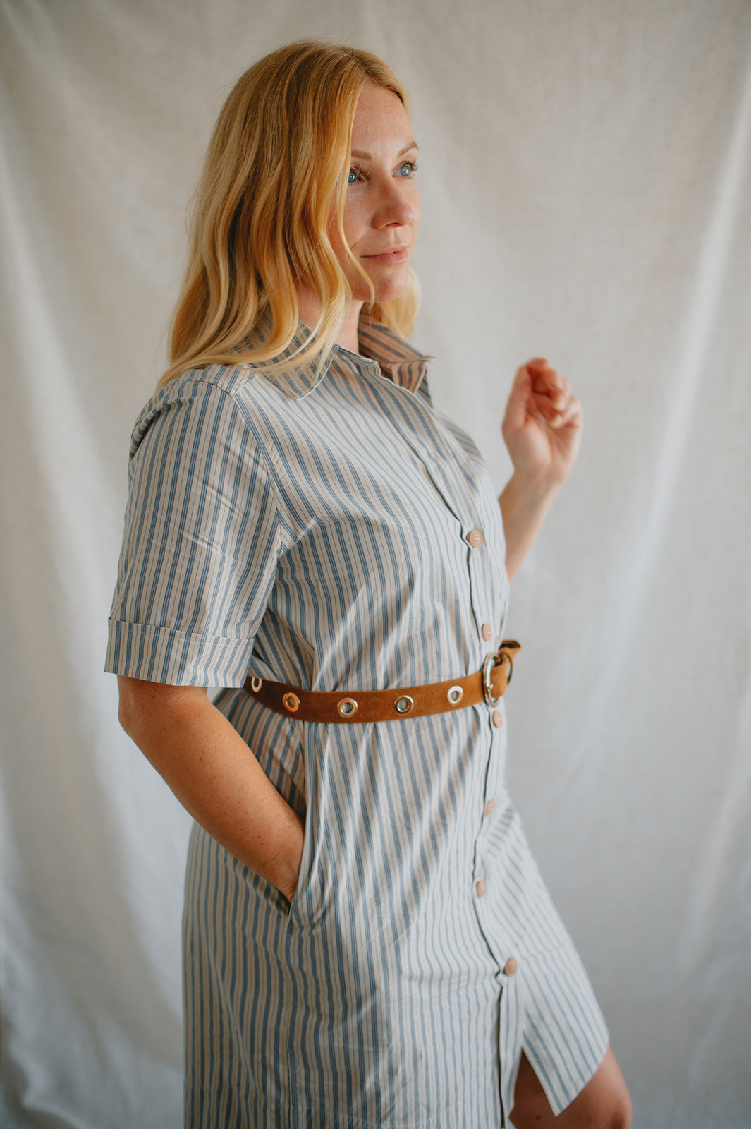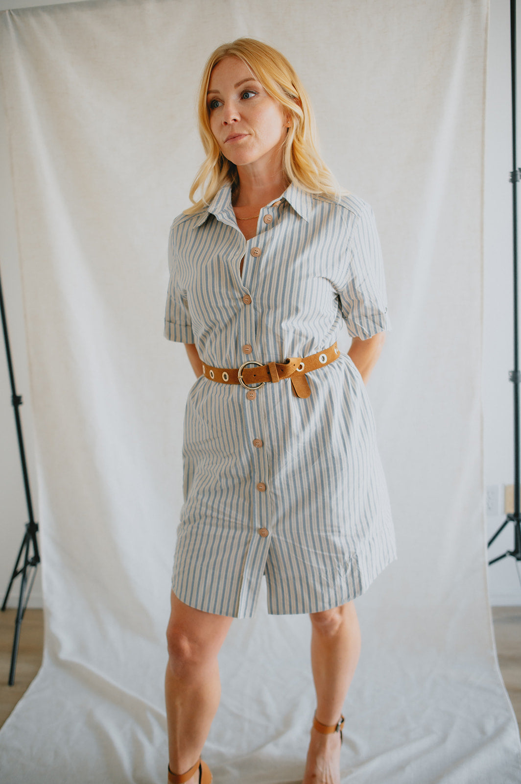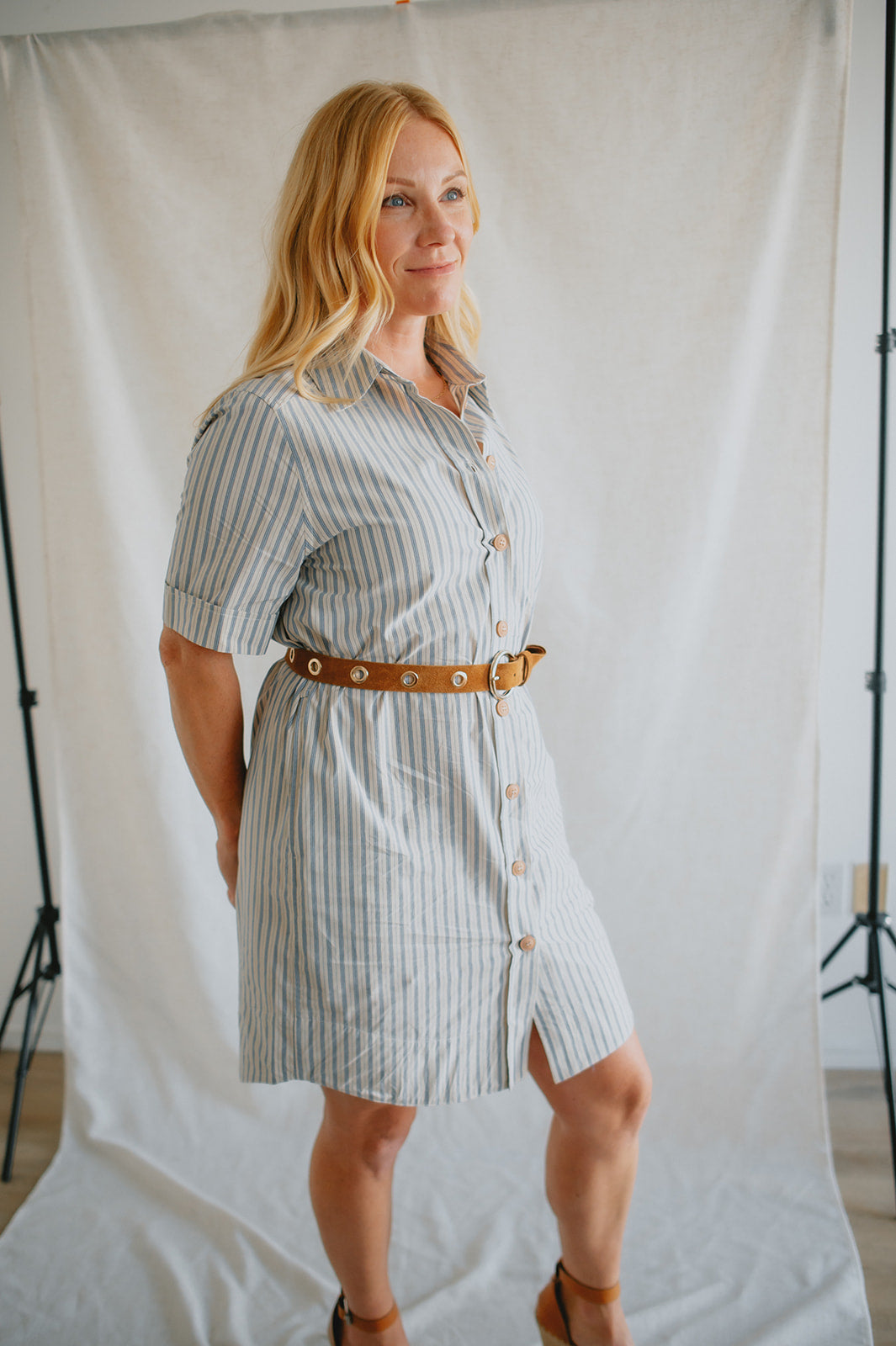 The Alexa Striped Mini Shirtdress is your new go-to for effortless charm. Made from 100% cotton, it features classic shirt styling with a collared neckline, front button closure, cuffed short sleeves, and a rounded shirttail hem. The included tie belt cinches the waist for a flattering fit, while side pockets add everyday ease. Whether styled with sandals for a stroll through the park or elevated with platforms, it channels that perfectly undone French-girl vibe.