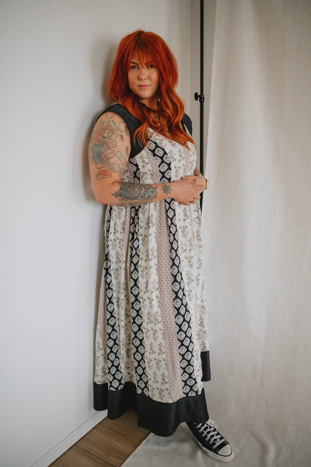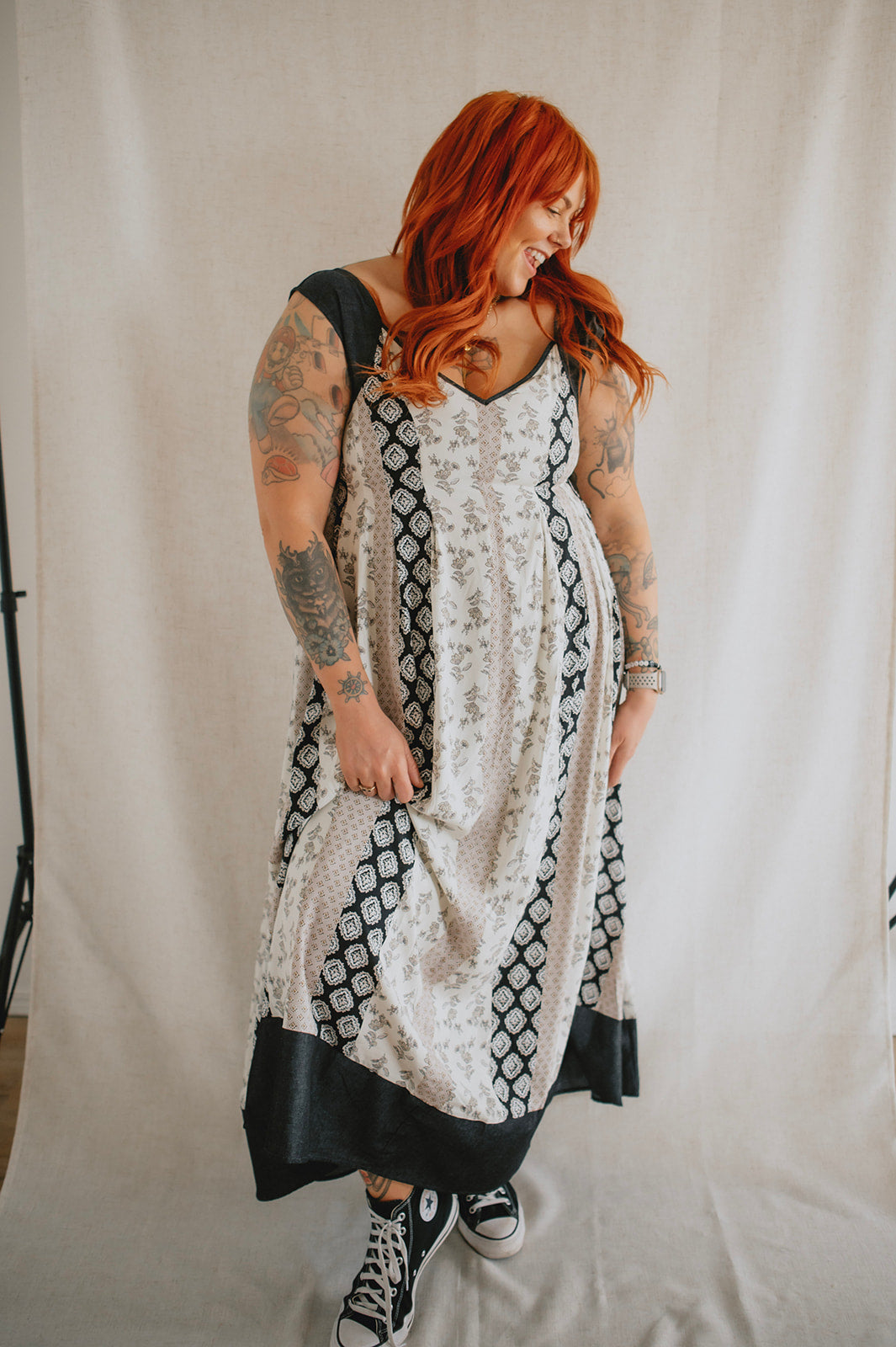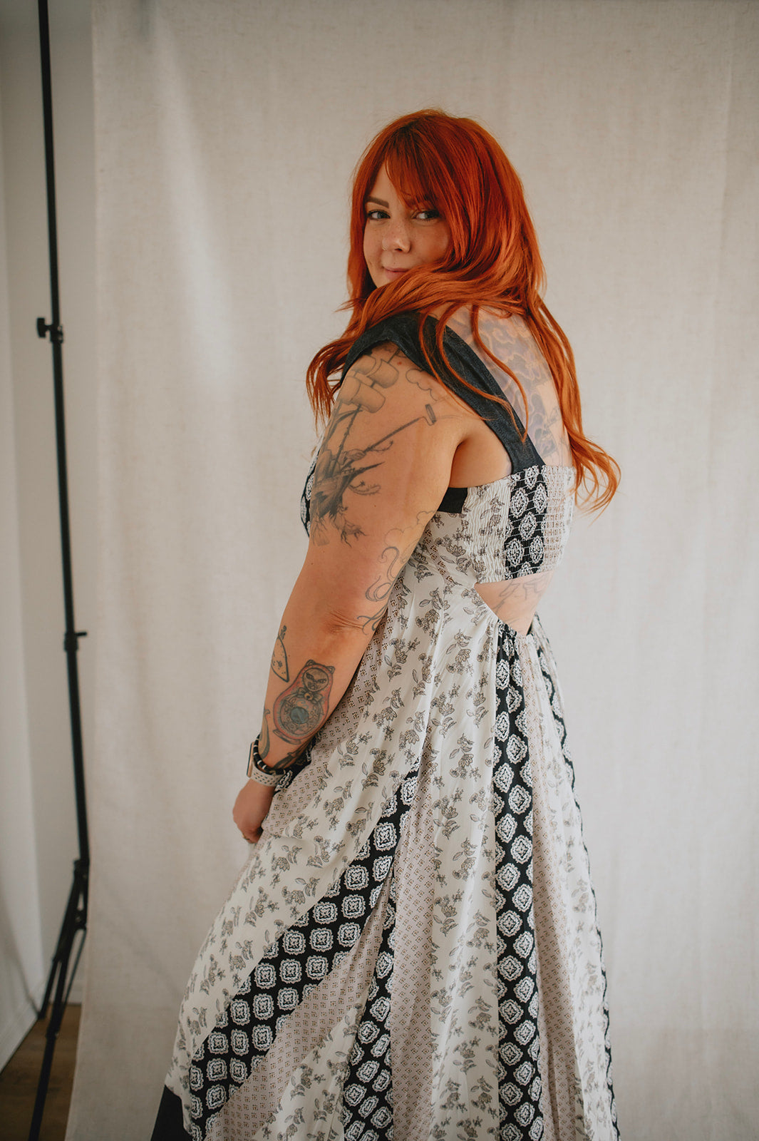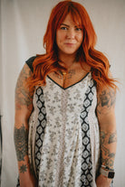 Meet the new girl on the block: The Cameron Denim Detail Midi Dress, a captivating fusion of style and comfort. Featuring a flattering v-neck and midi length, this dress showcases mixed pattern panels for a unique aesthetic. With denim straps and bottom hem accents, along with a lower back peek-a-boo detail, it exudes casual sophistication. Complete with a smocked back and bra-friendly design, it offers both versatility and ease of wear for any occasion.
