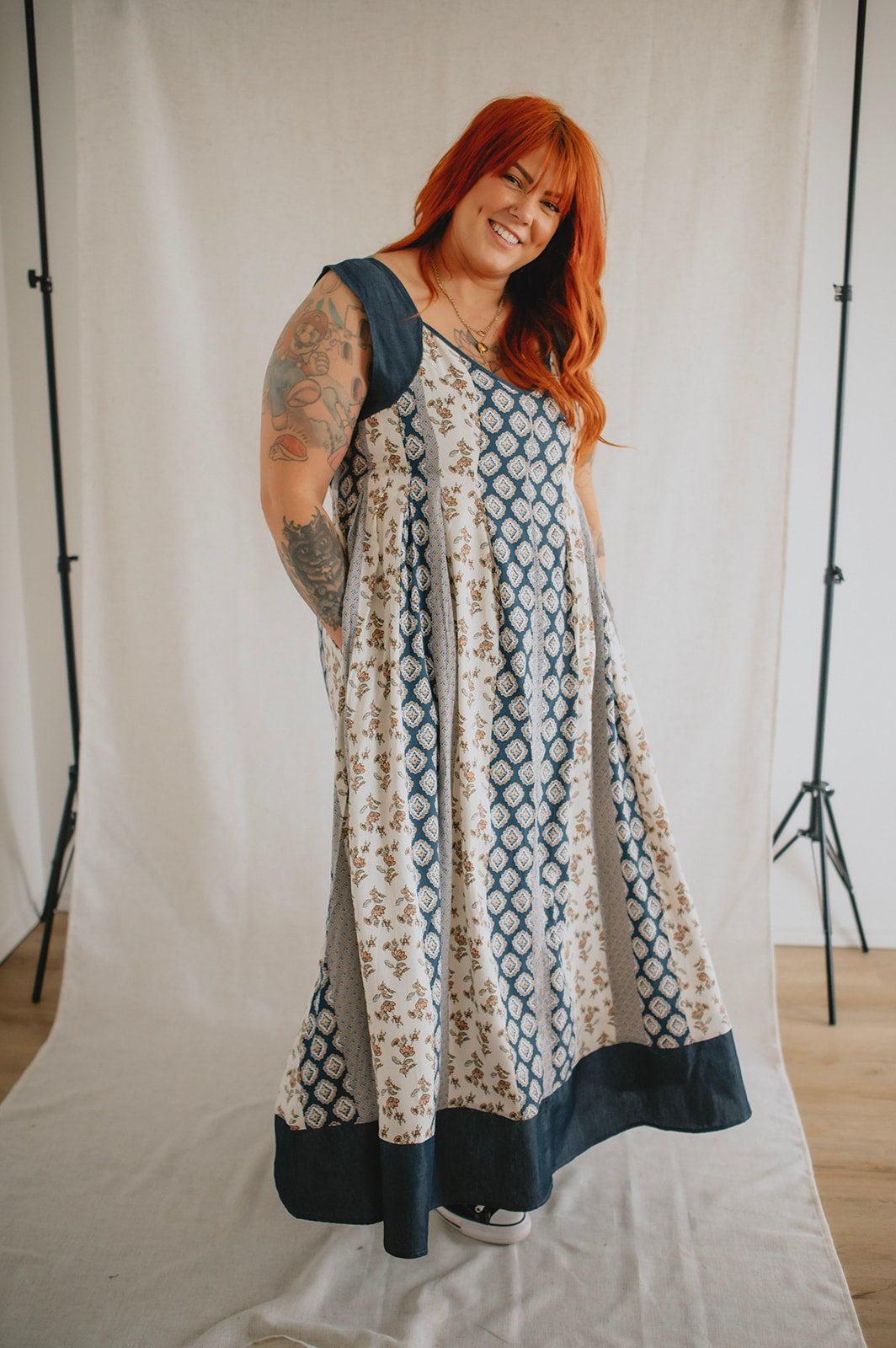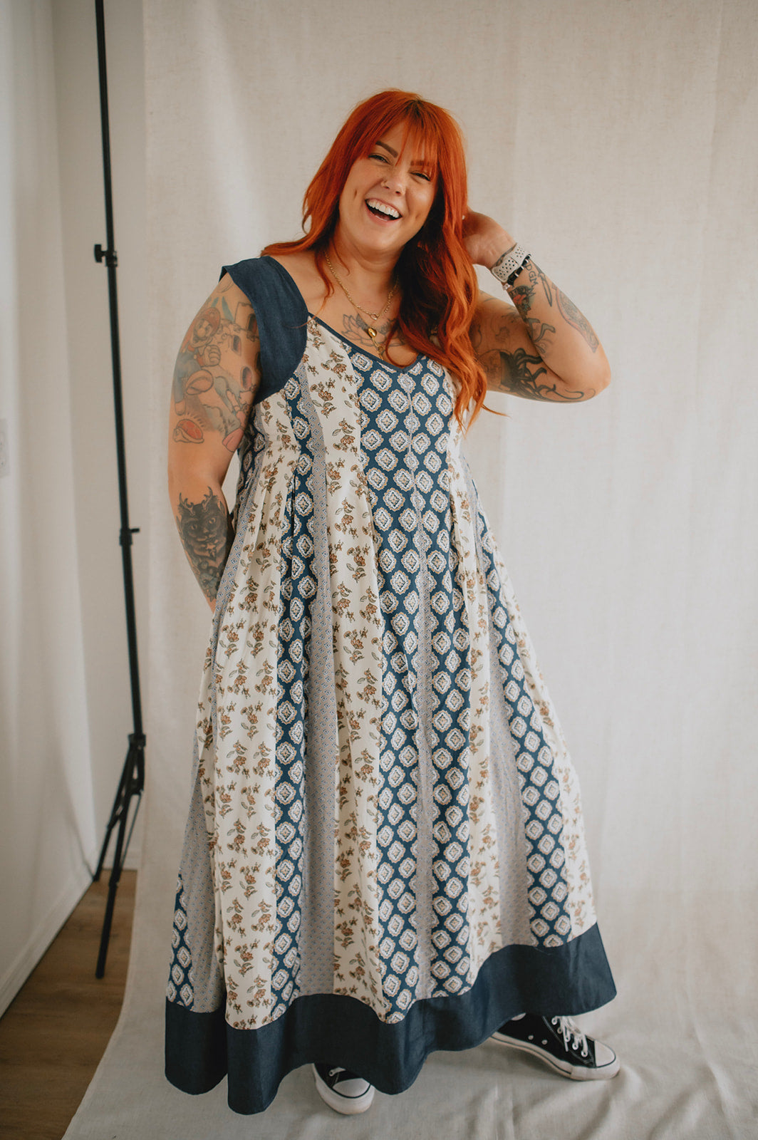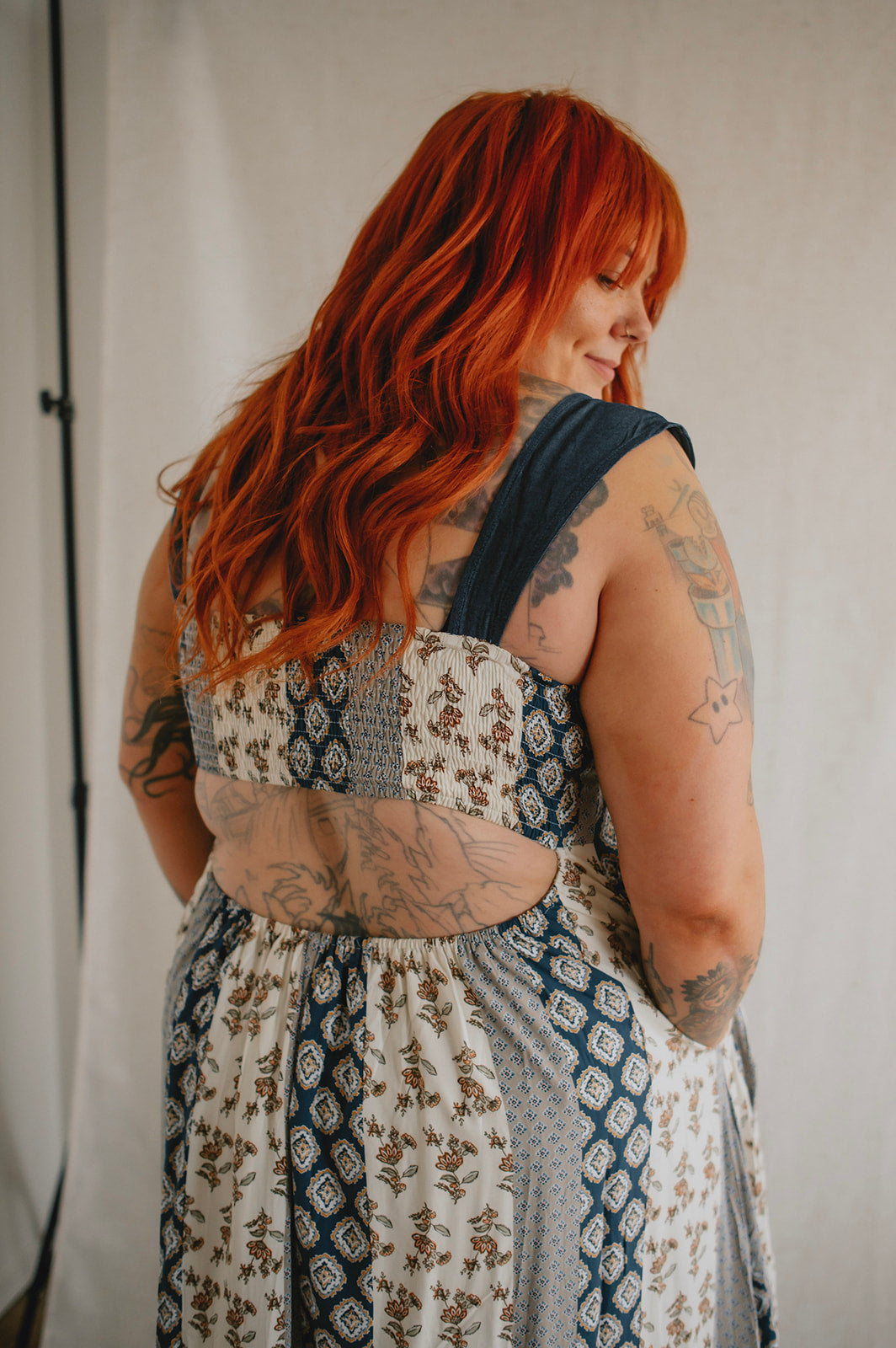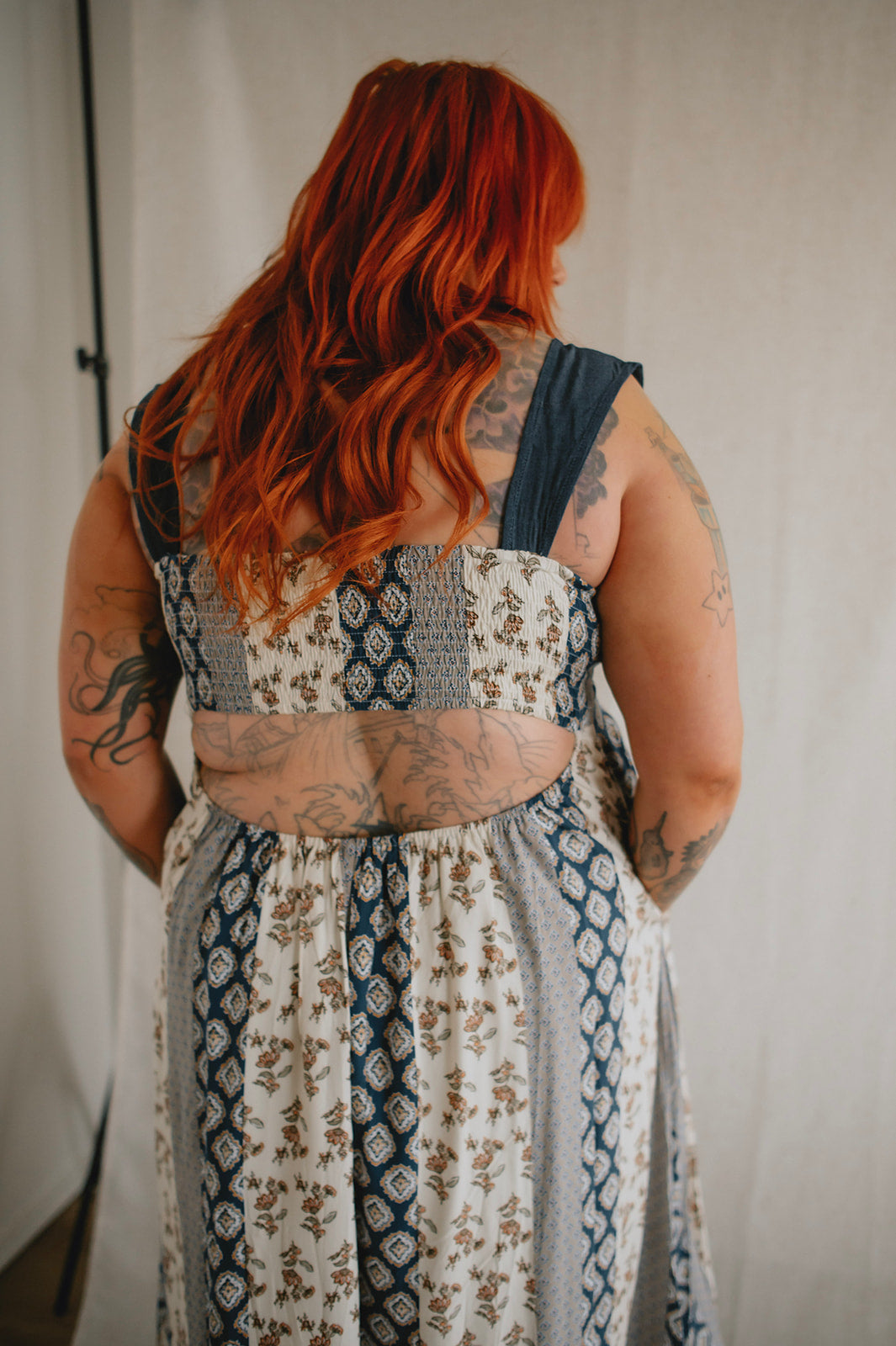 Meet the new girl on the block: The Cameron Denim Detail Midi Dress, a captivating fusion of style and comfort. Featuring a flattering v-neck and midi length, this dress showcases mixed pattern panels for a unique aesthetic. With denim straps and bottom hem accents, along with a lower back peek-a-boo detail, it exudes casual sophistication. Complete with a smocked back and bra-friendly design, it offers both versatility and ease of wear for any occasion.