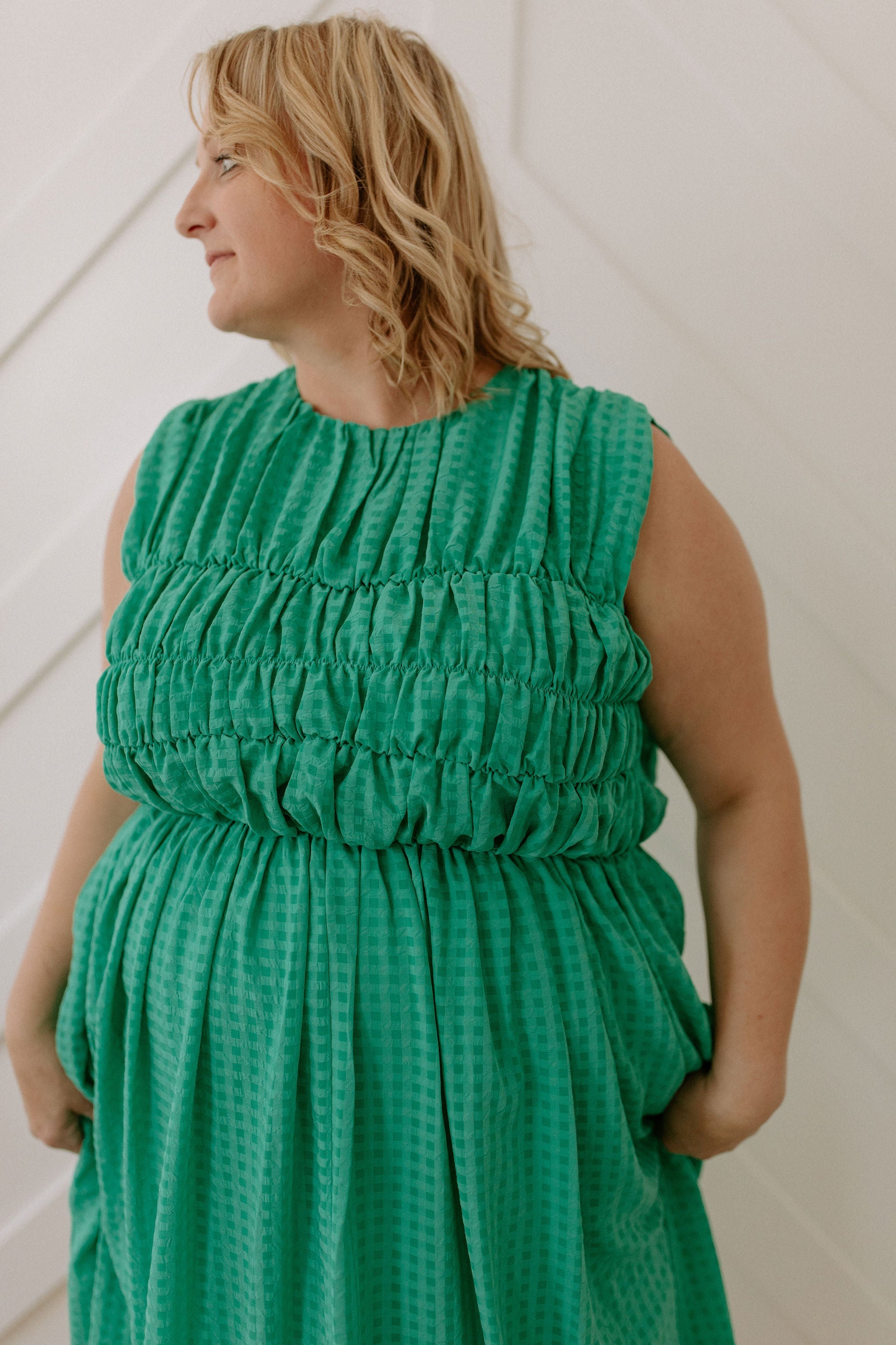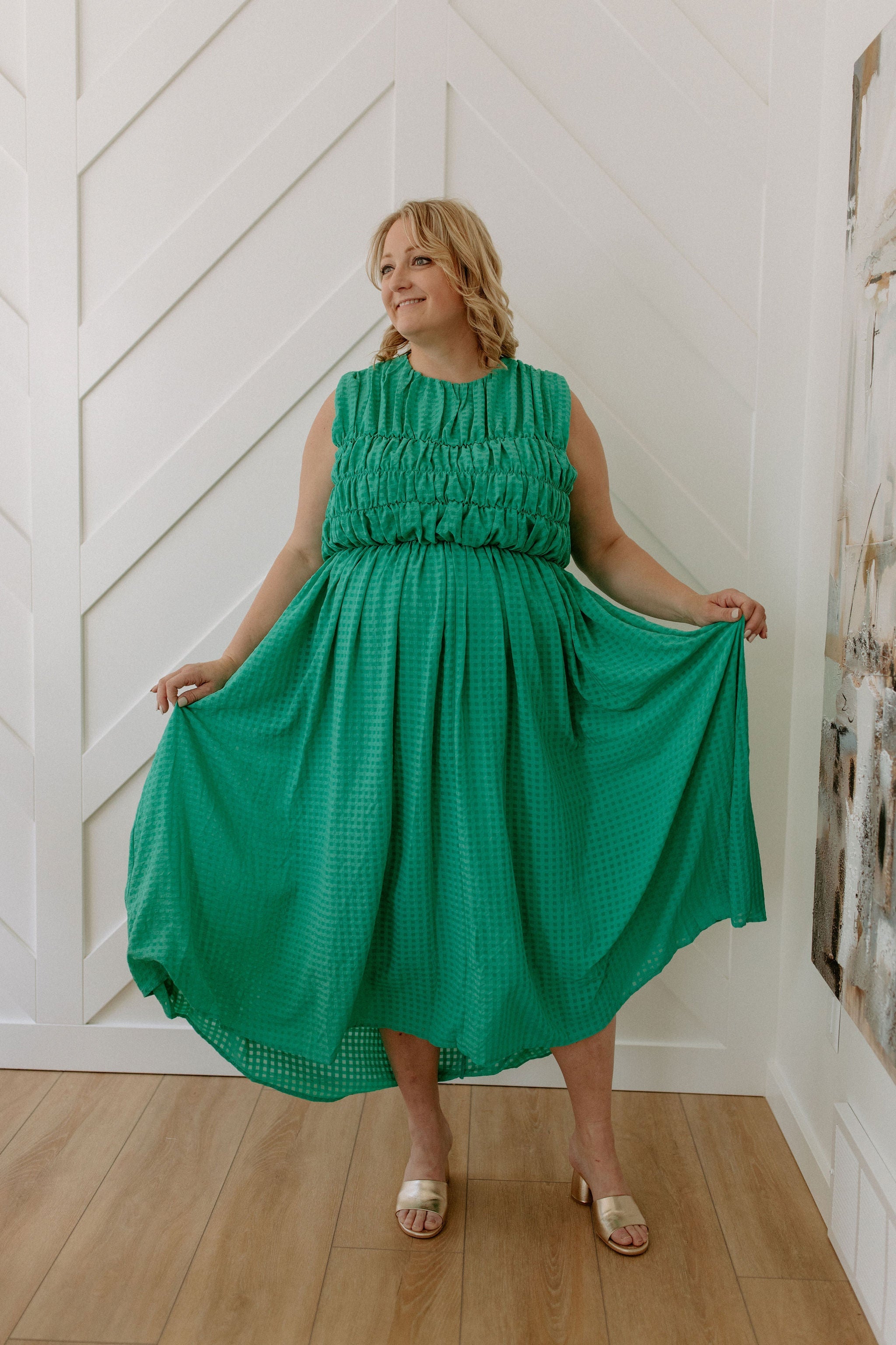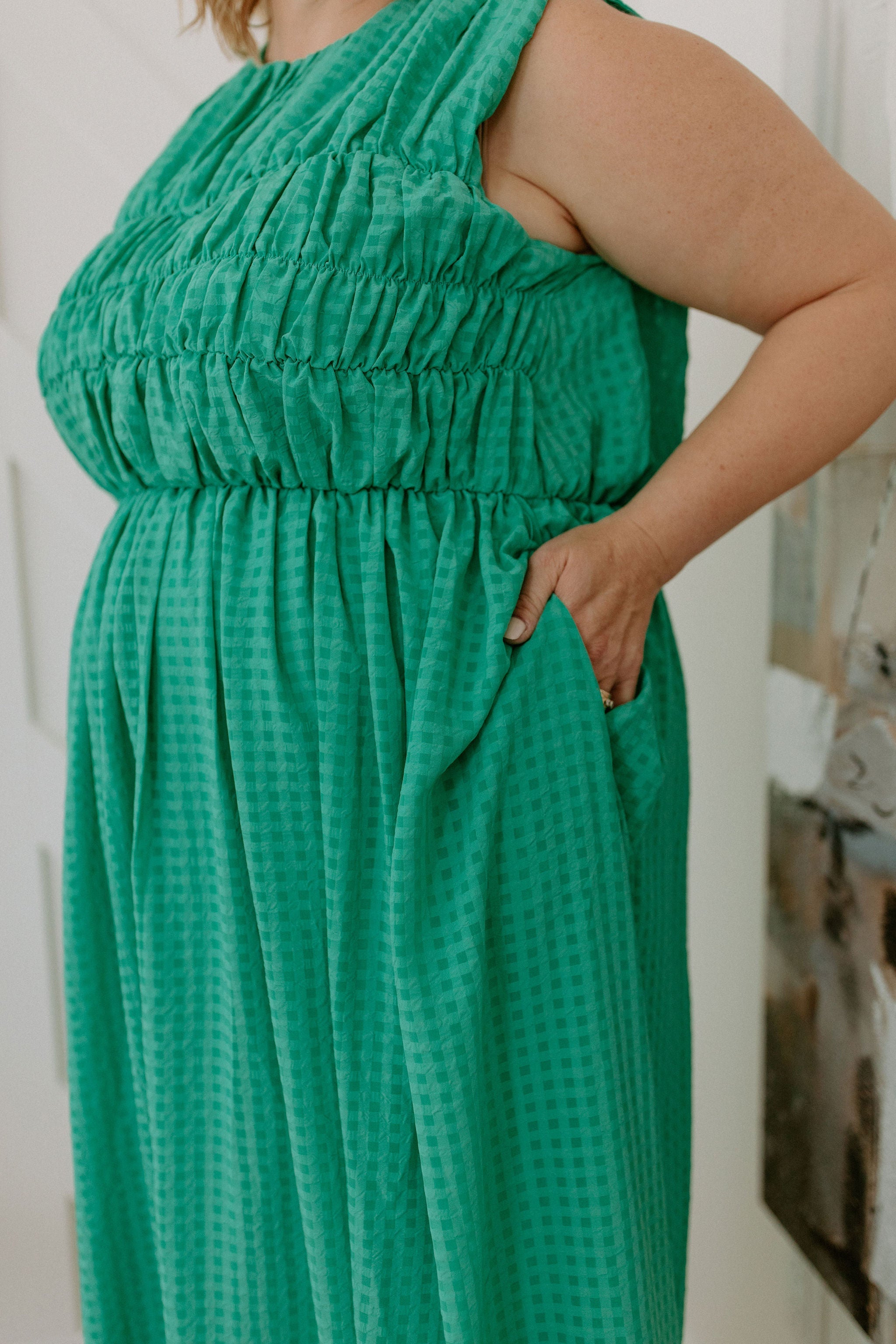 Here she is: The Dorothy Ruched Checkered Midi Dress, a vibrant statement piece that exudes both charm and versatility. With its crew neck, ruched bodice, and sleeveless design, this dress offers a flattering silhouette. Crafted from textured checkered fabric in a bold kelly green hue, it features a midi length, elastic waist, and convenient side pockets, making it the perfect blend of style and functionality for any occasion.