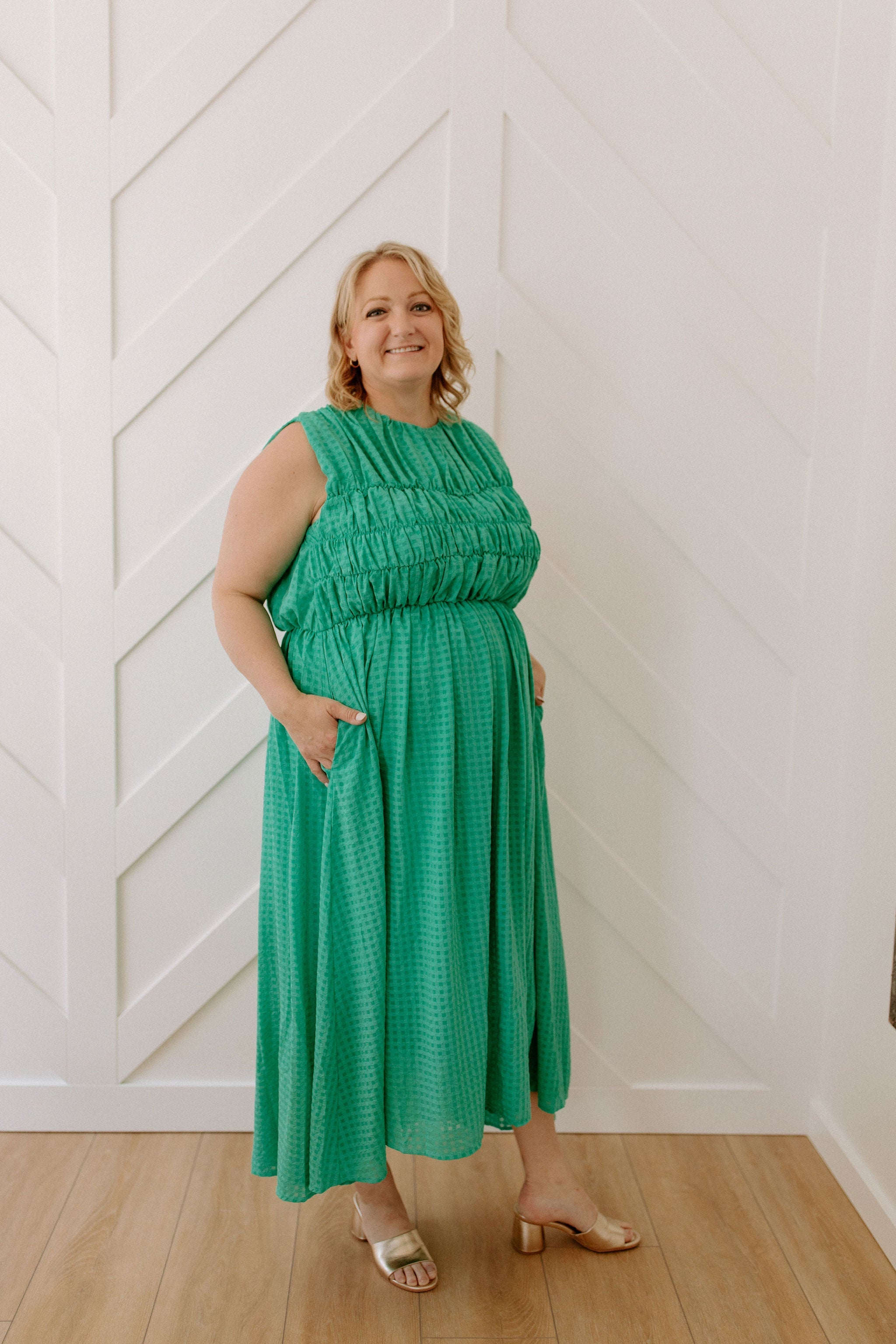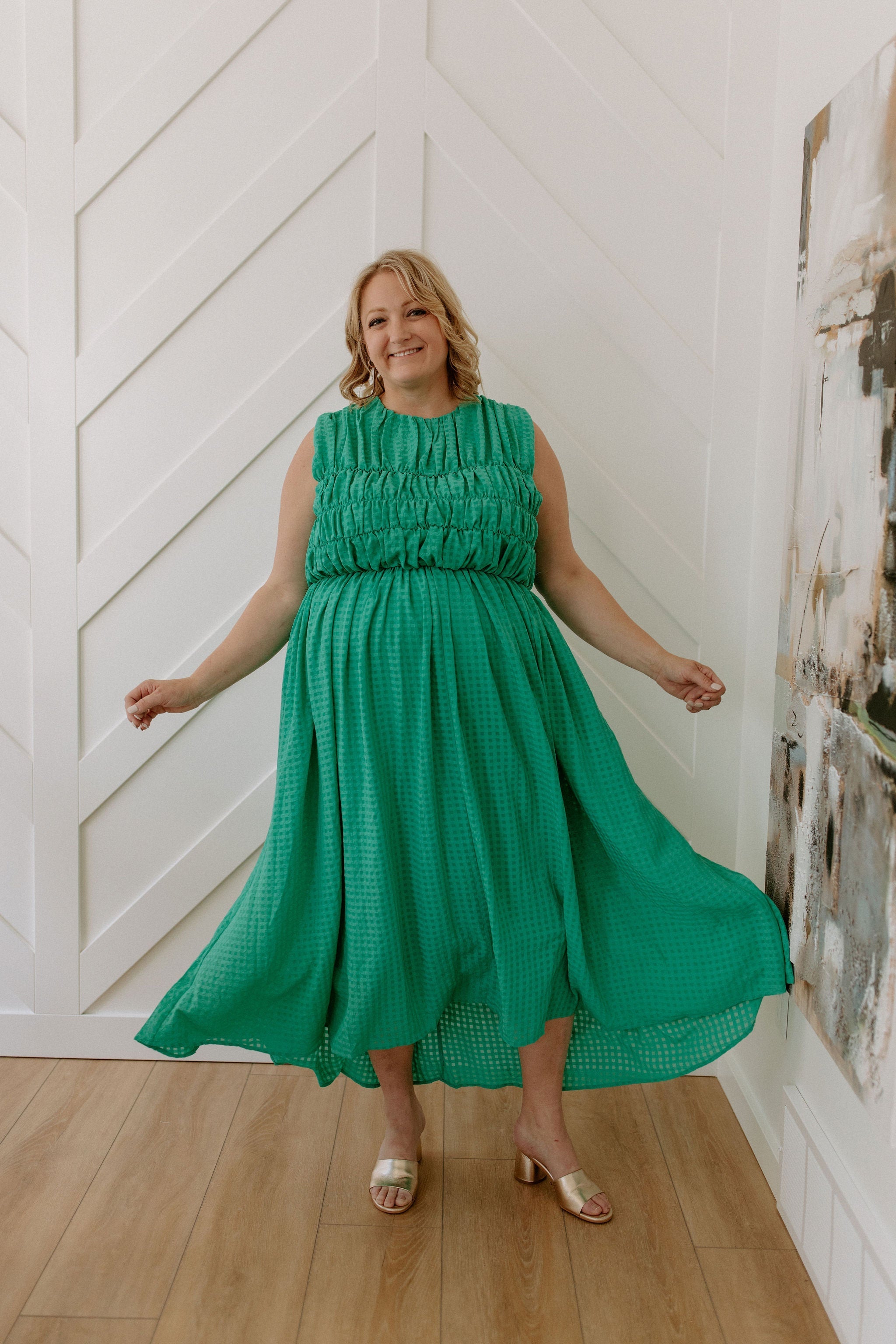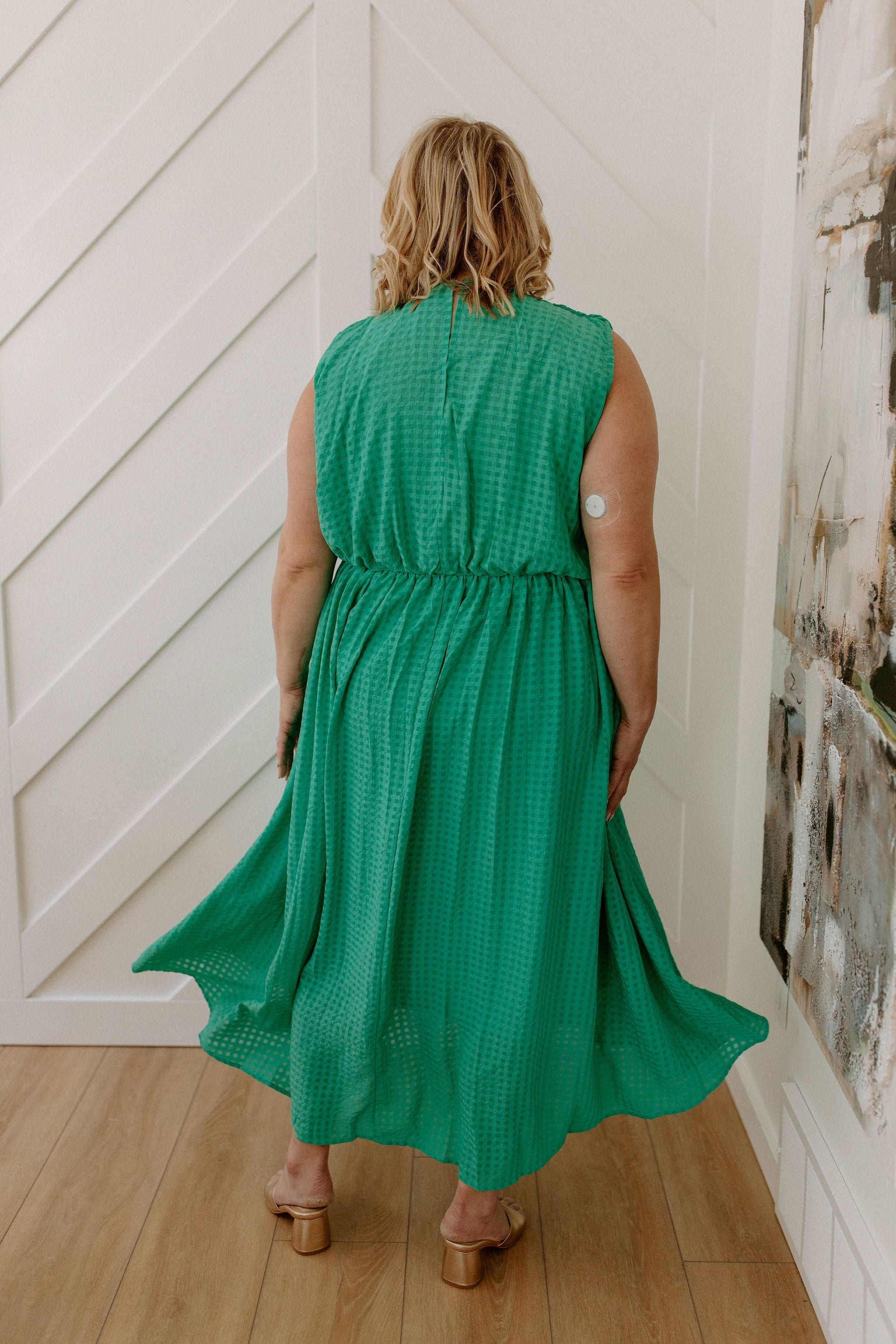 Here she is: The Dorothy Ruched Checkered Midi Dress, a vibrant statement piece that exudes both charm and versatility. With its crew neck, ruched bodice, and sleeveless design, this dress offers a flattering silhouette. Crafted from textured checkered fabric in a bold kelly green hue, it features a midi length, elastic waist, and convenient side pockets, making it the perfect blend of style and functionality for any occasion.