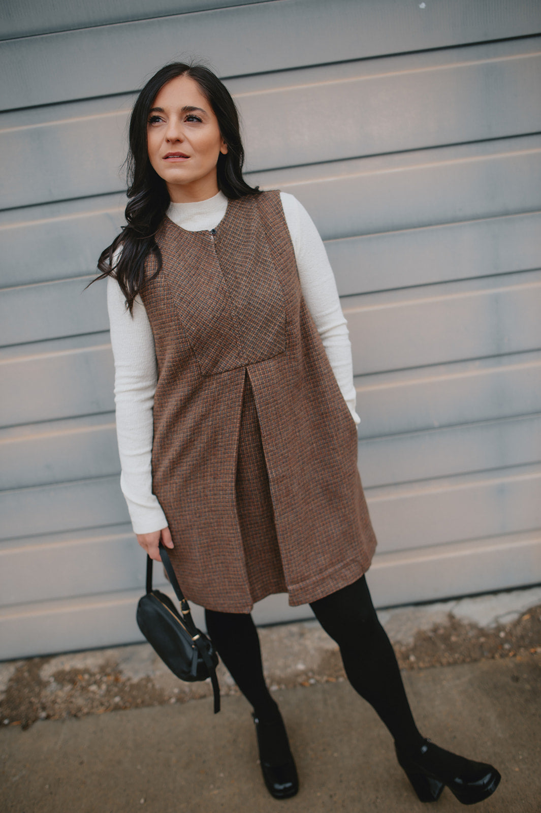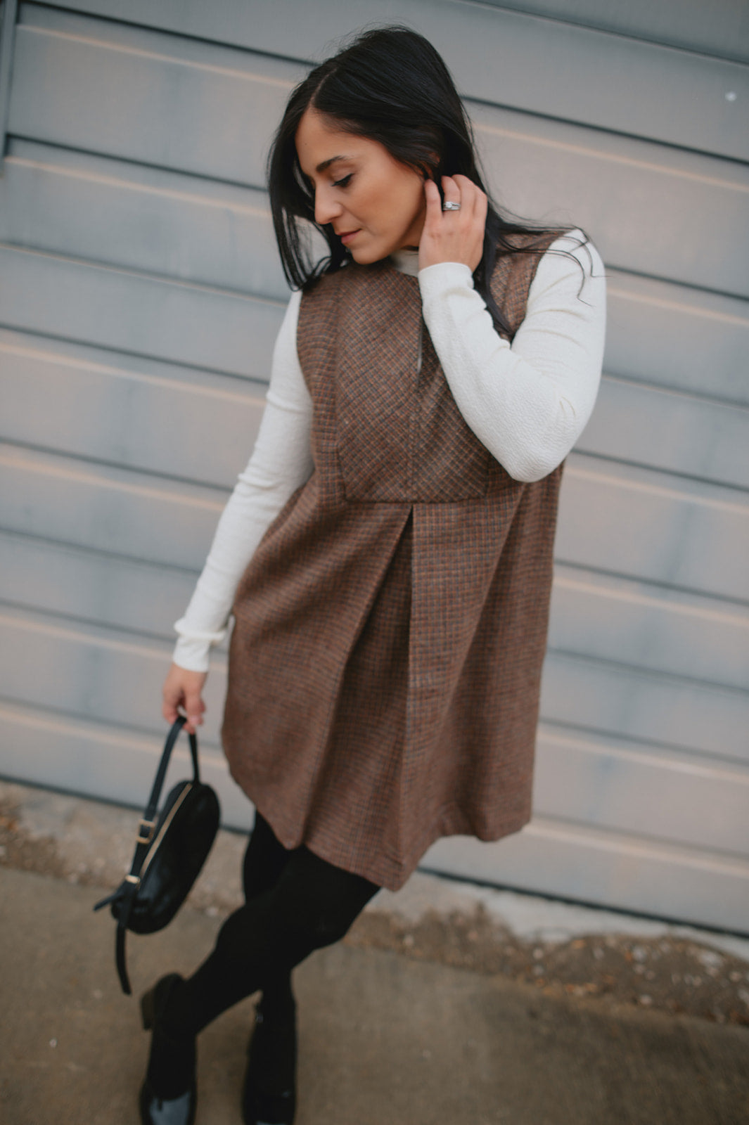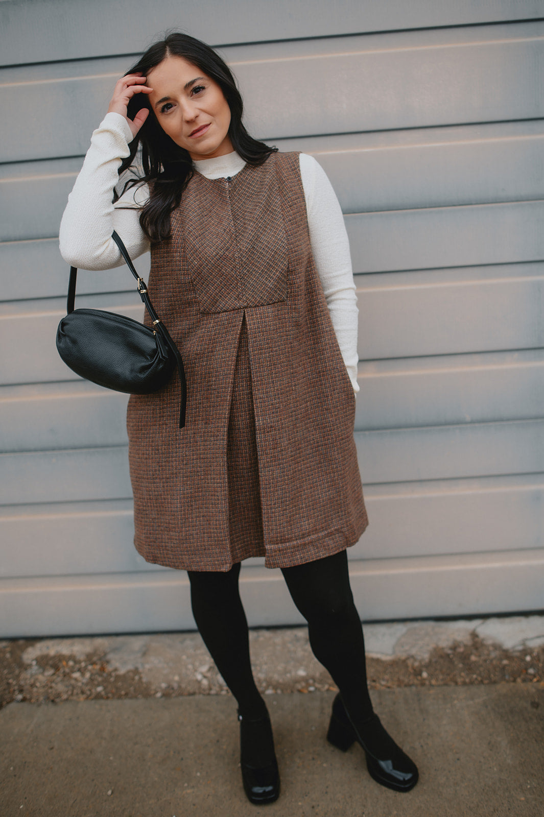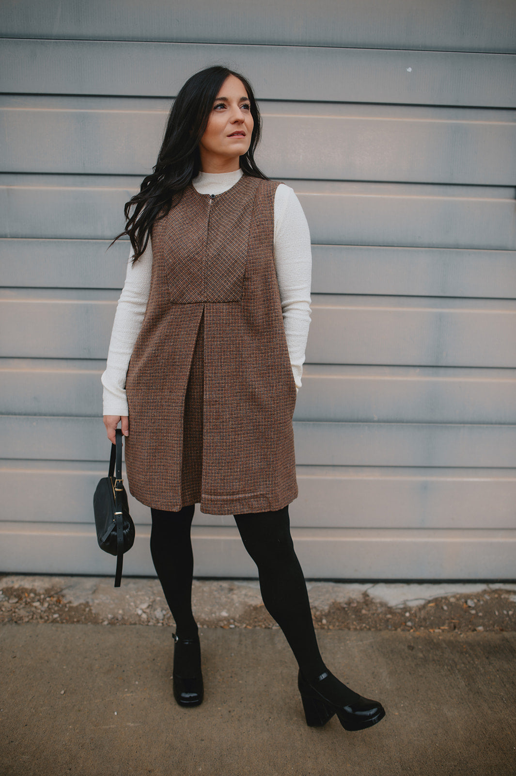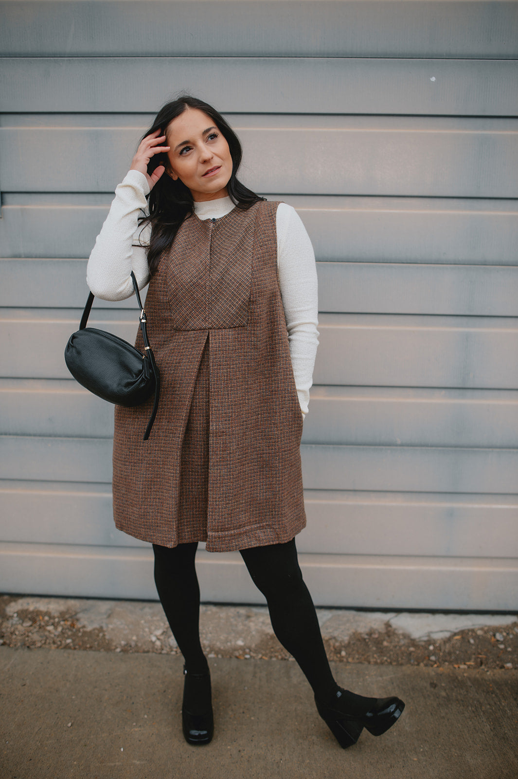 Perfect for crisp mornings spent at your favourite coffee shop or late afternoons wandering through small-town bookstores, this dress pairs beautifully with a white blouse and knee-high boots for that unmistakable Rory Gilmore energy.