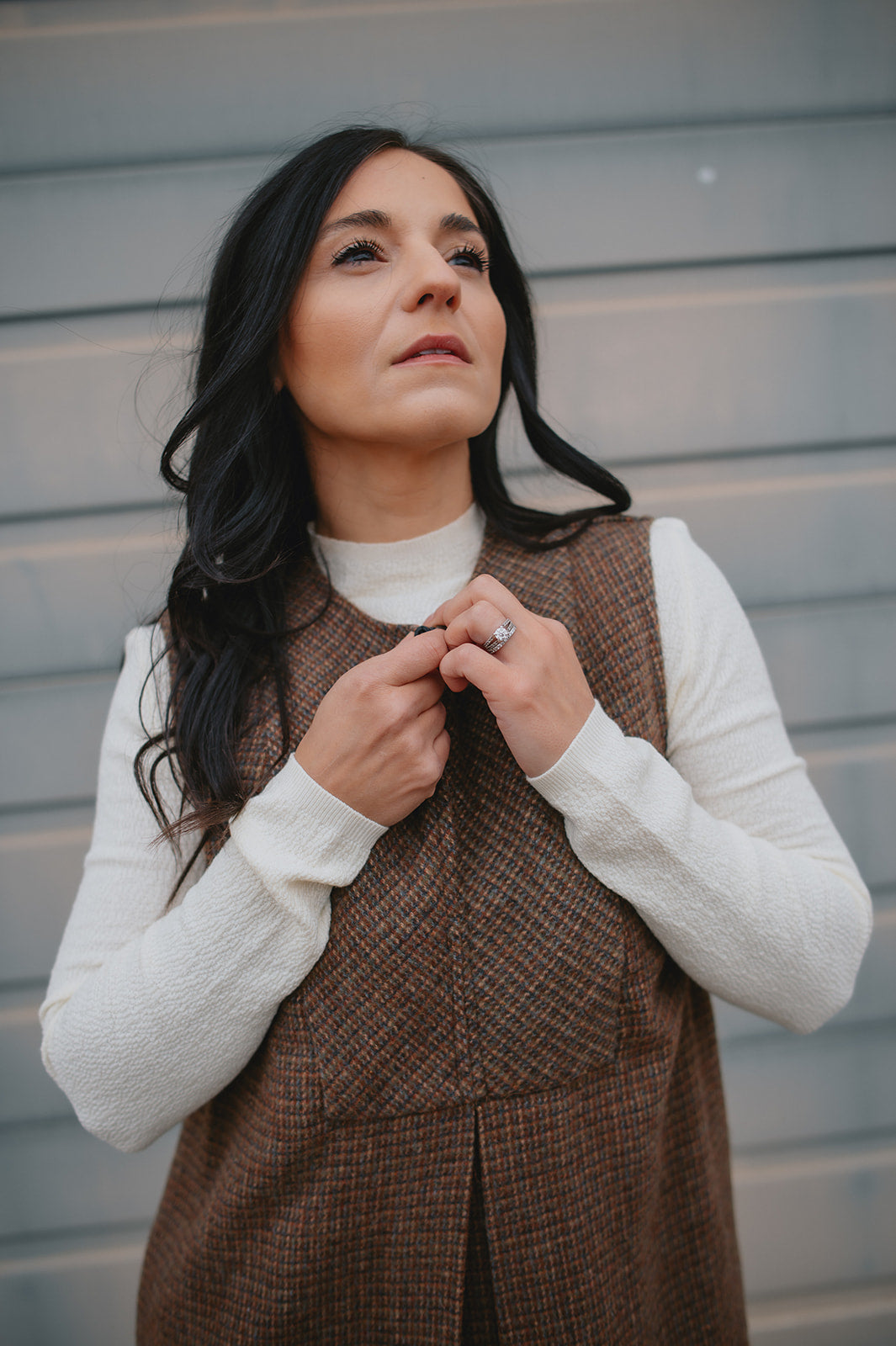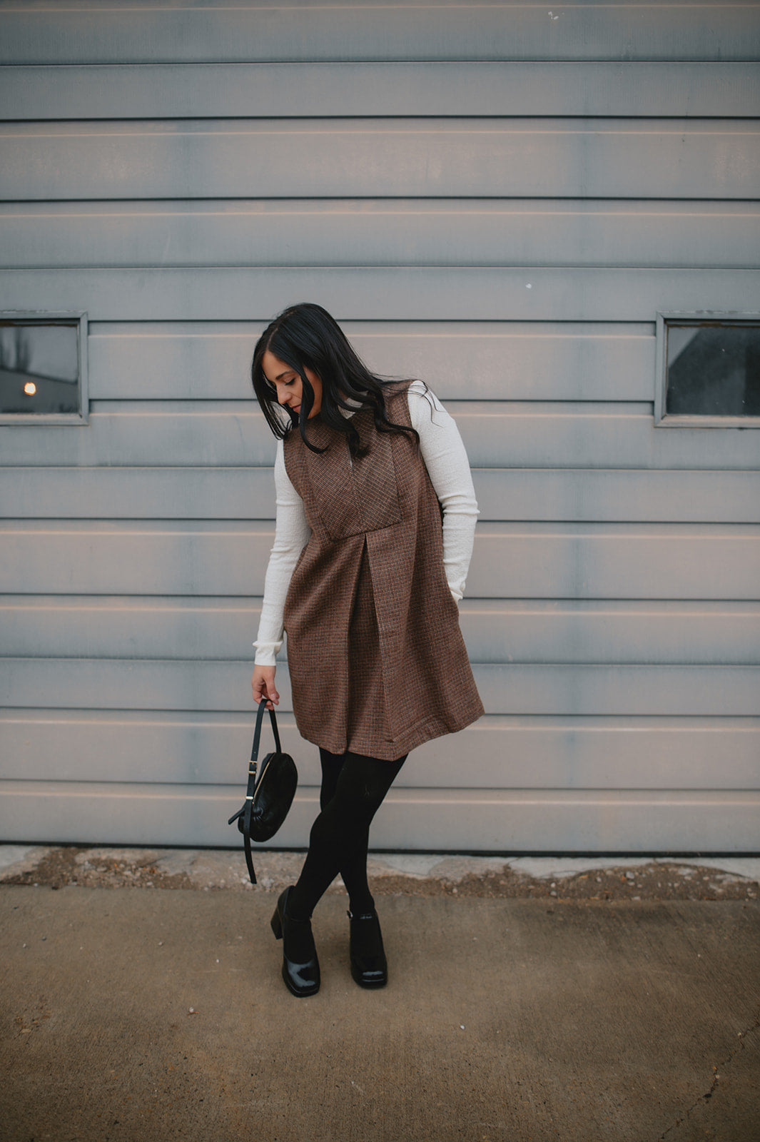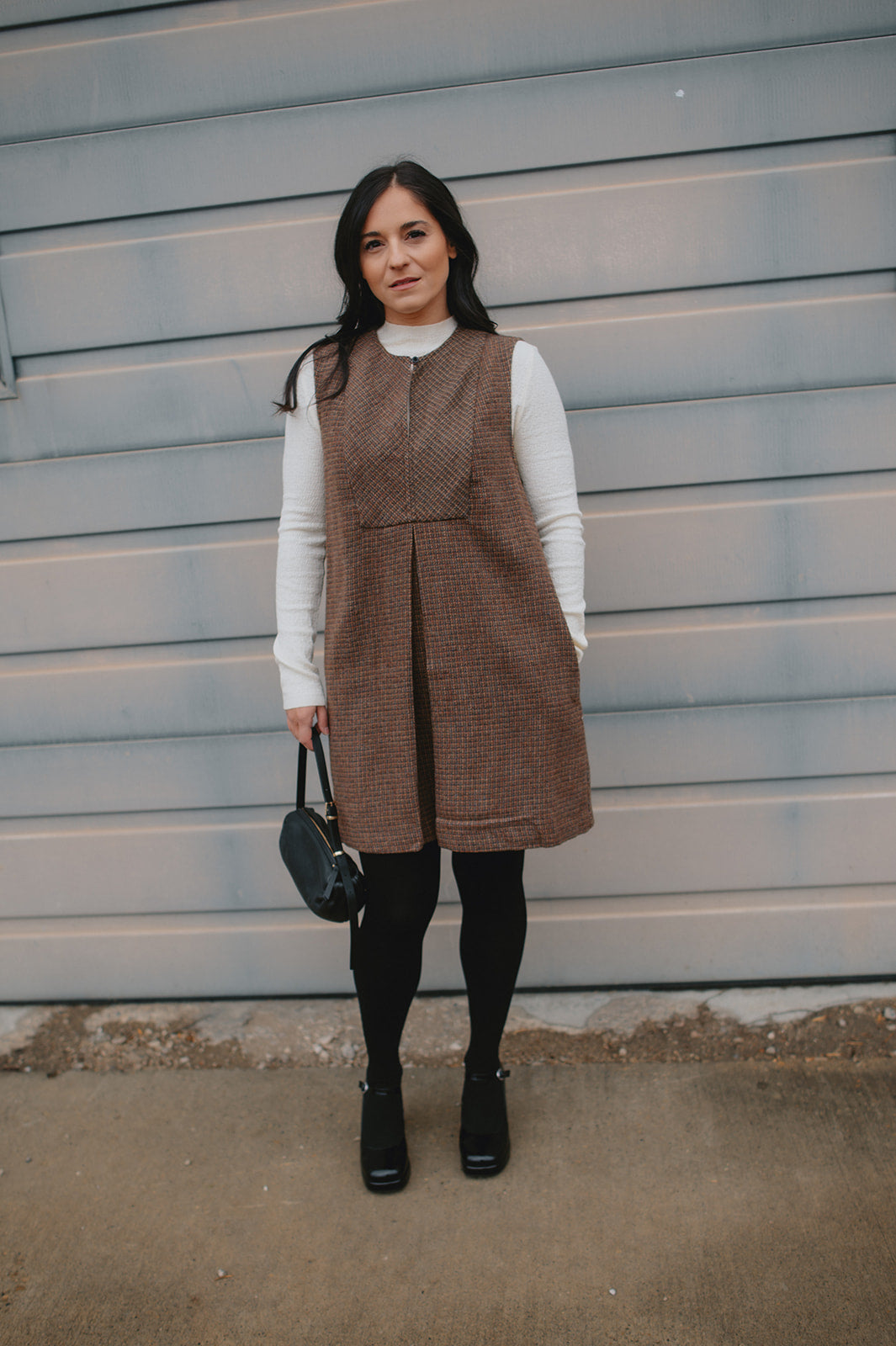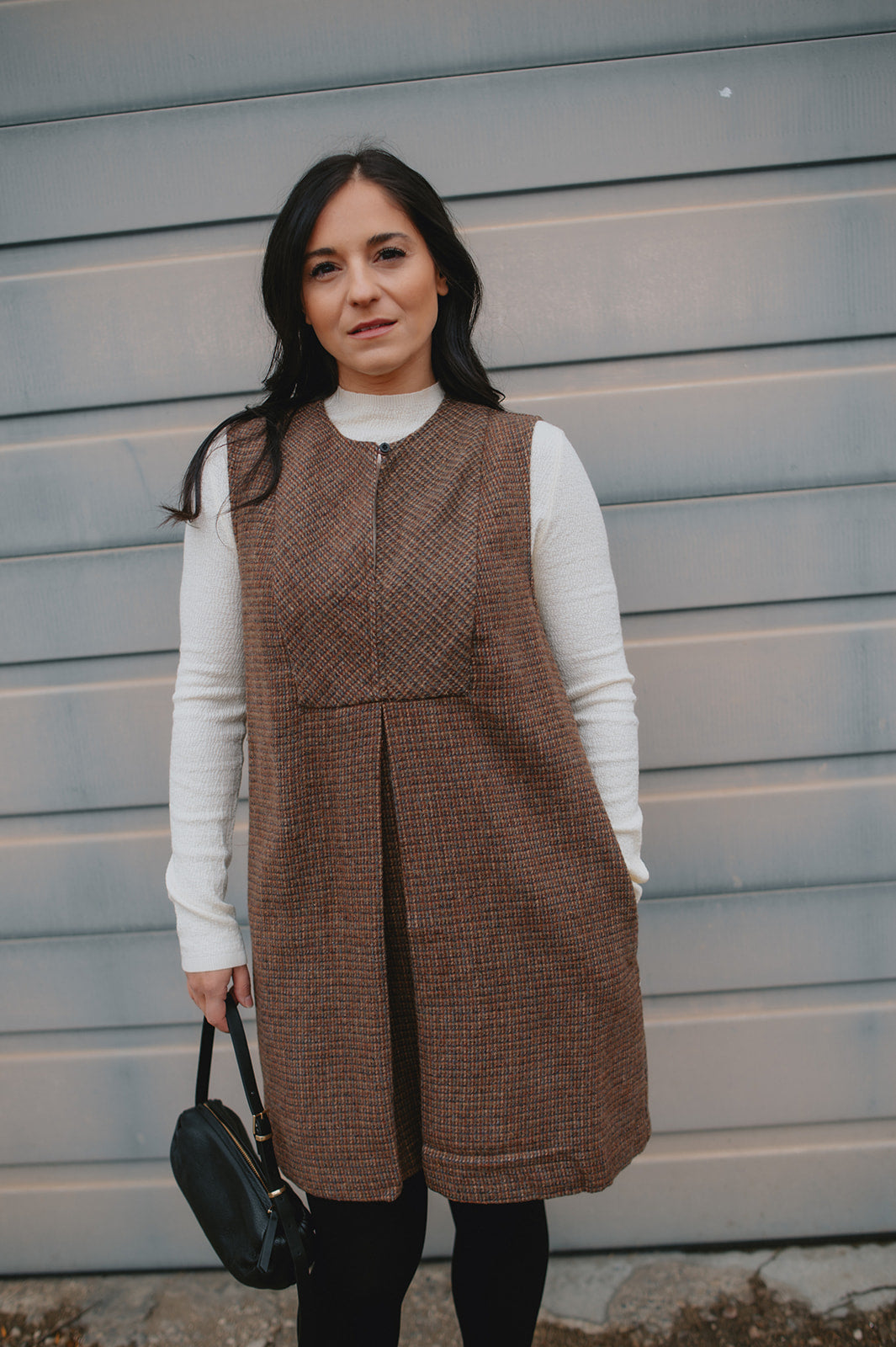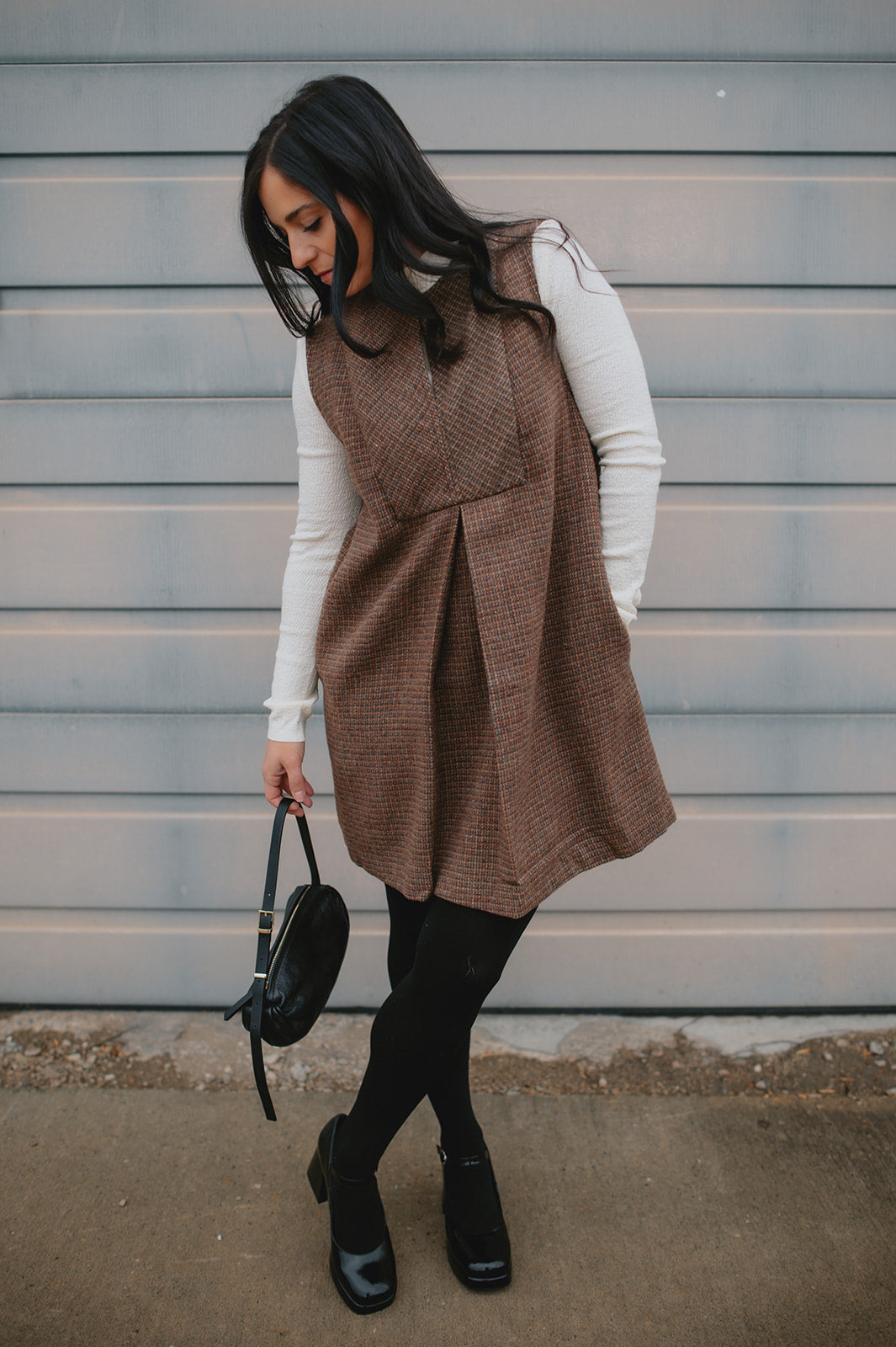 Perfect for crisp mornings spent at your favourite coffee shop or late afternoons wandering through small-town bookstores, this dress pairs beautifully with a white blouse and knee-high boots for that unmistakable Rory Gilmore energy.