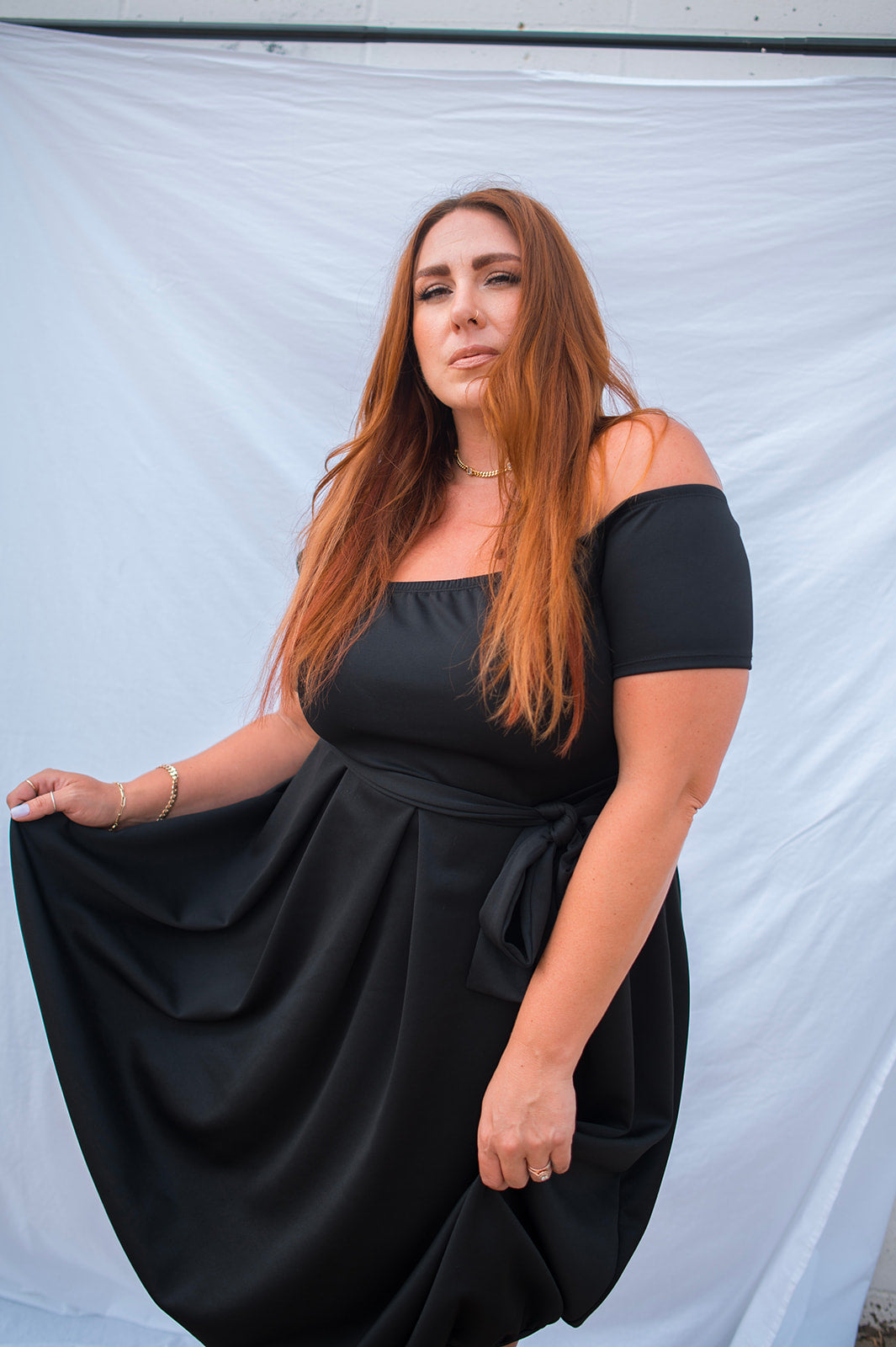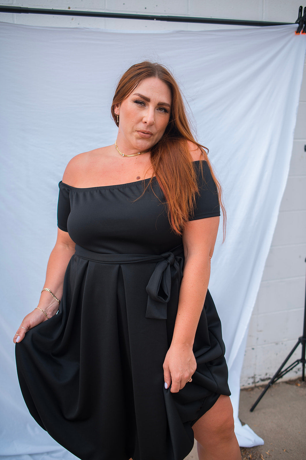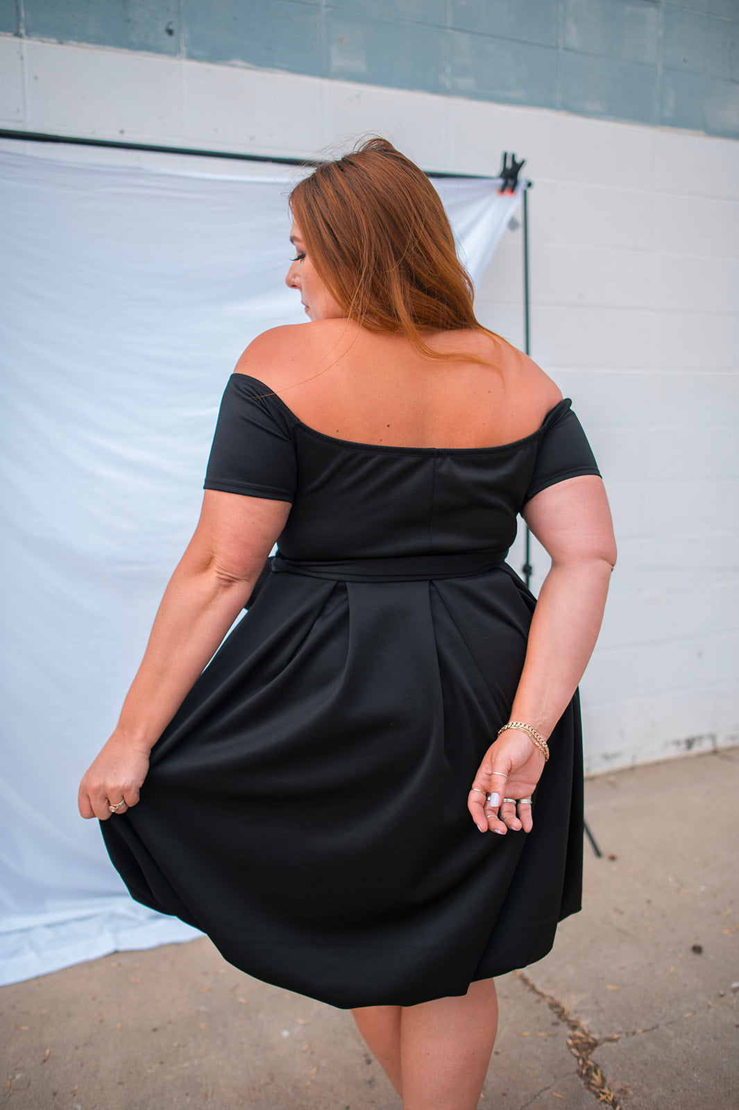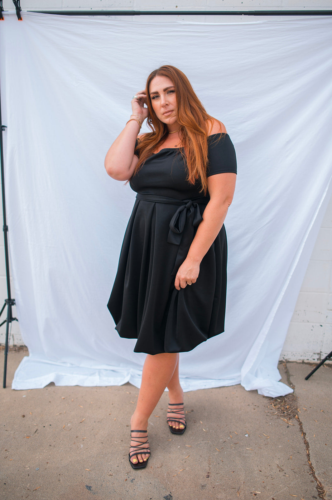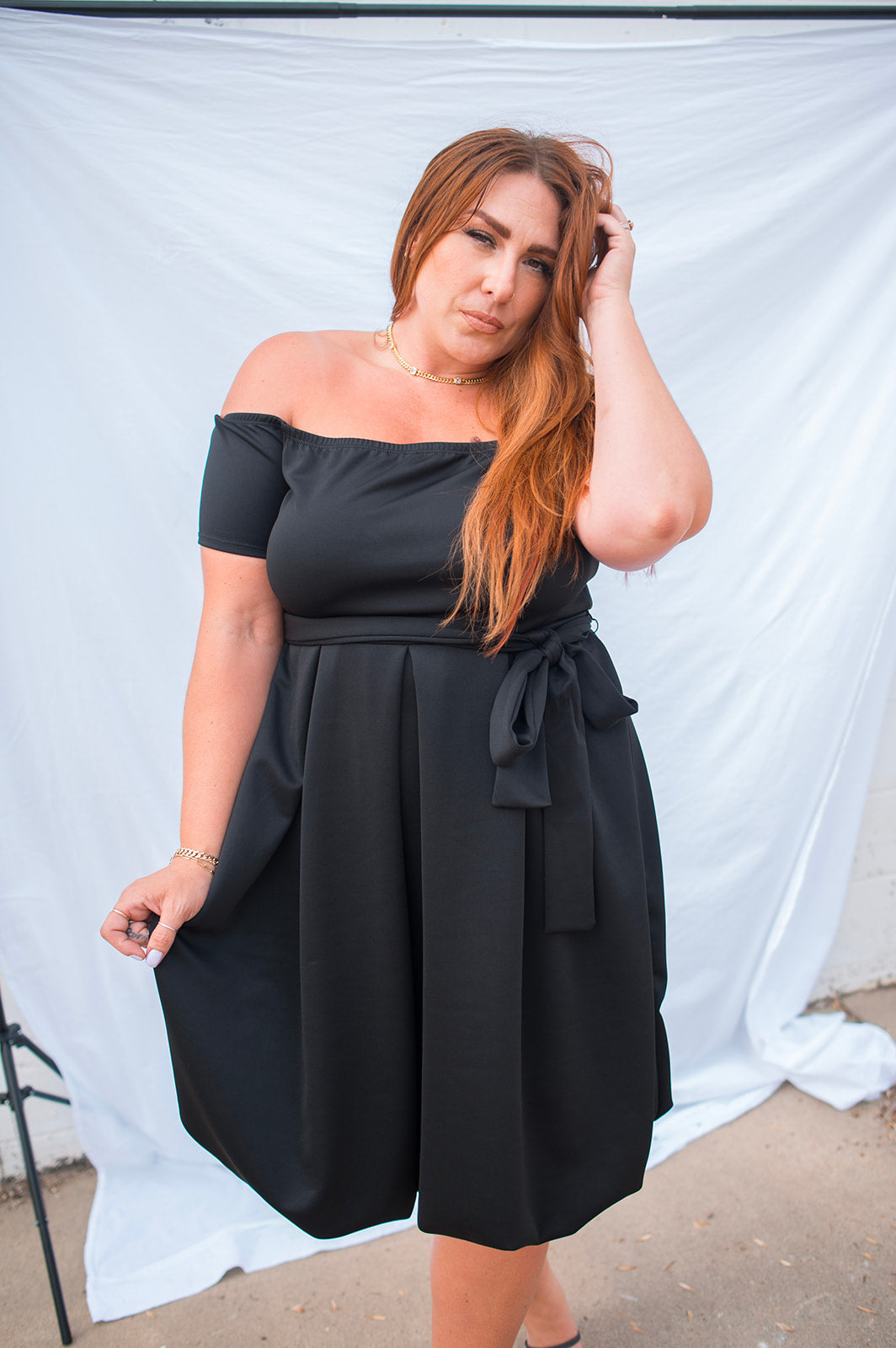 A sassy, yet sweet mini dress with a unique bubble hem and off-the-shoulder collar. Simple, yet elegant. Straps can be worn on or off the shoulders. Knee length.