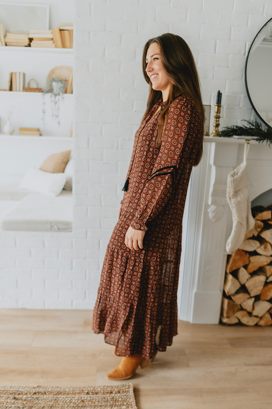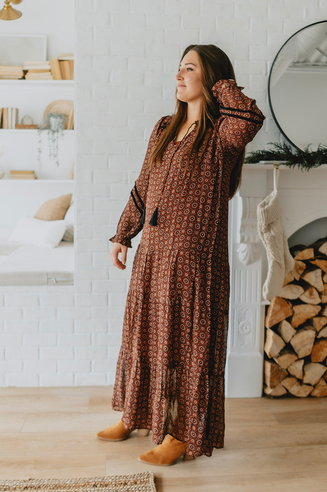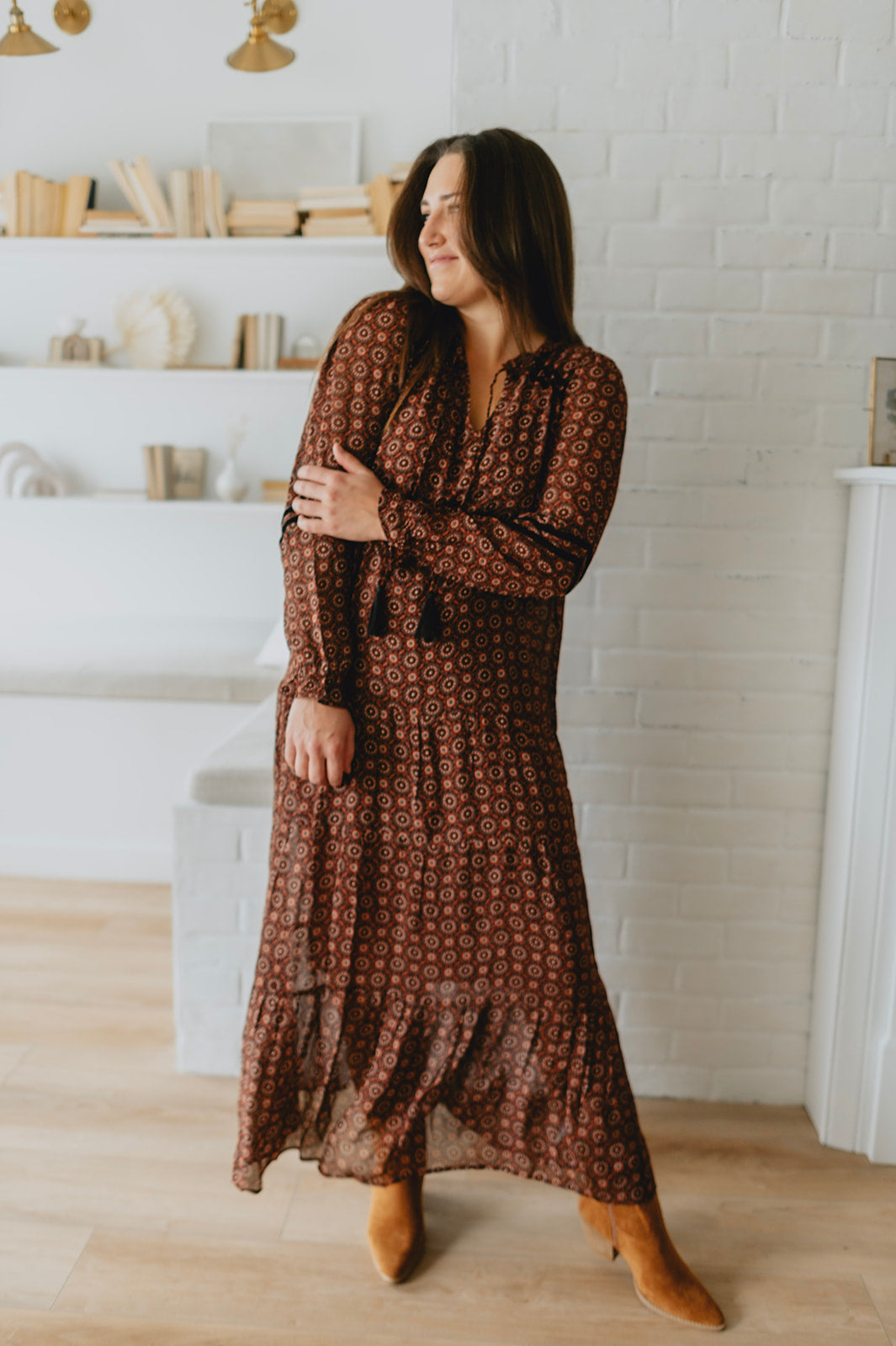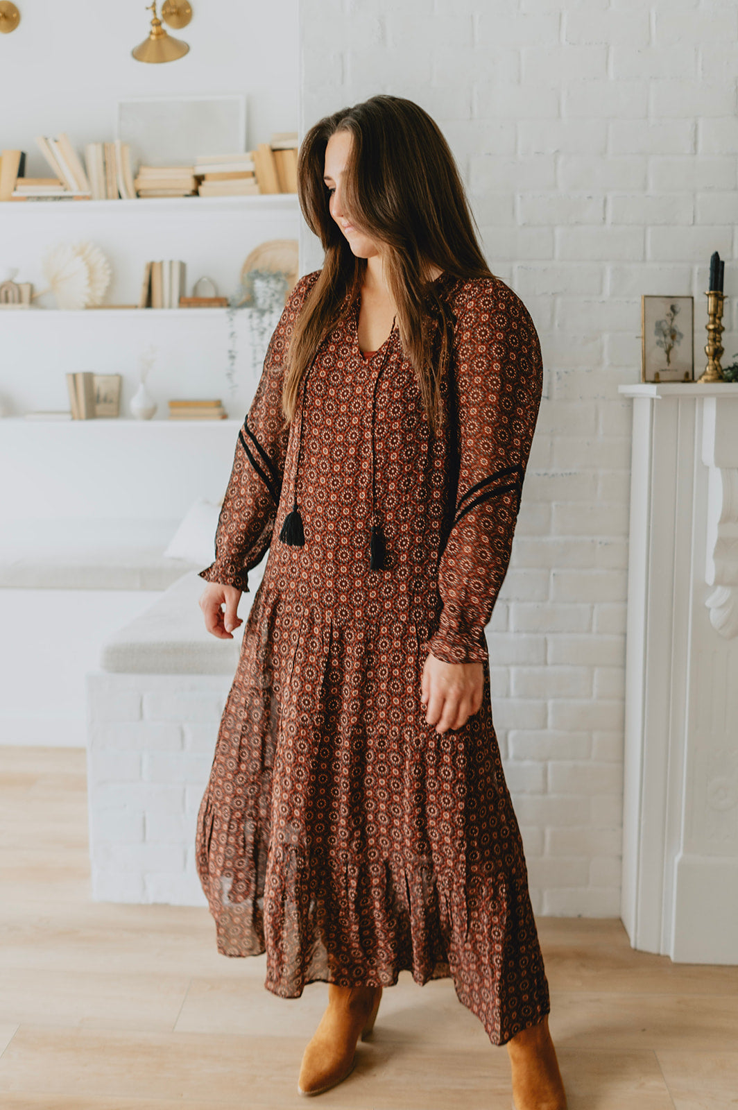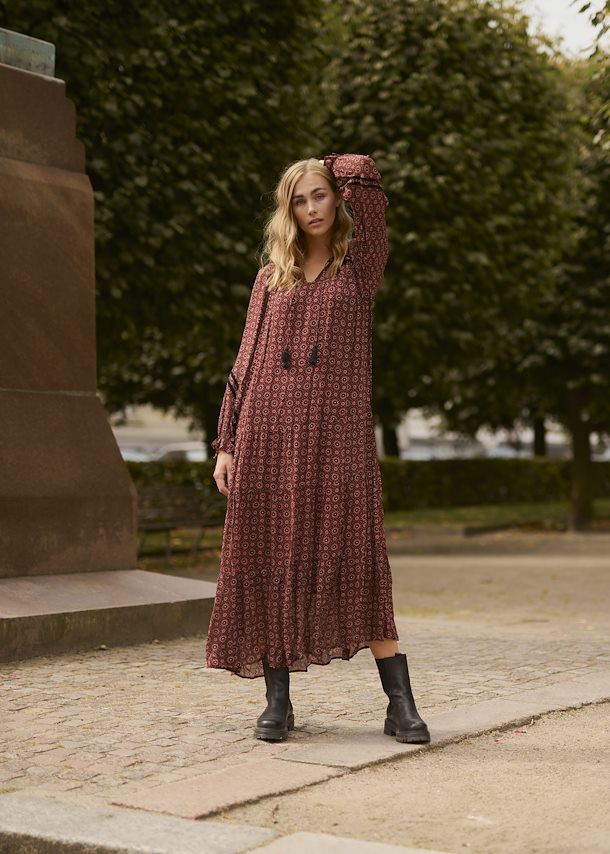 This maxi dress features a geo print on a beautiful burgundy background. Front tassels, and a flowy skirt, it's a bohemian dream. Add some black boots with it, and you can wear it this winter!