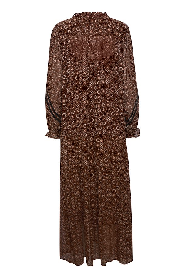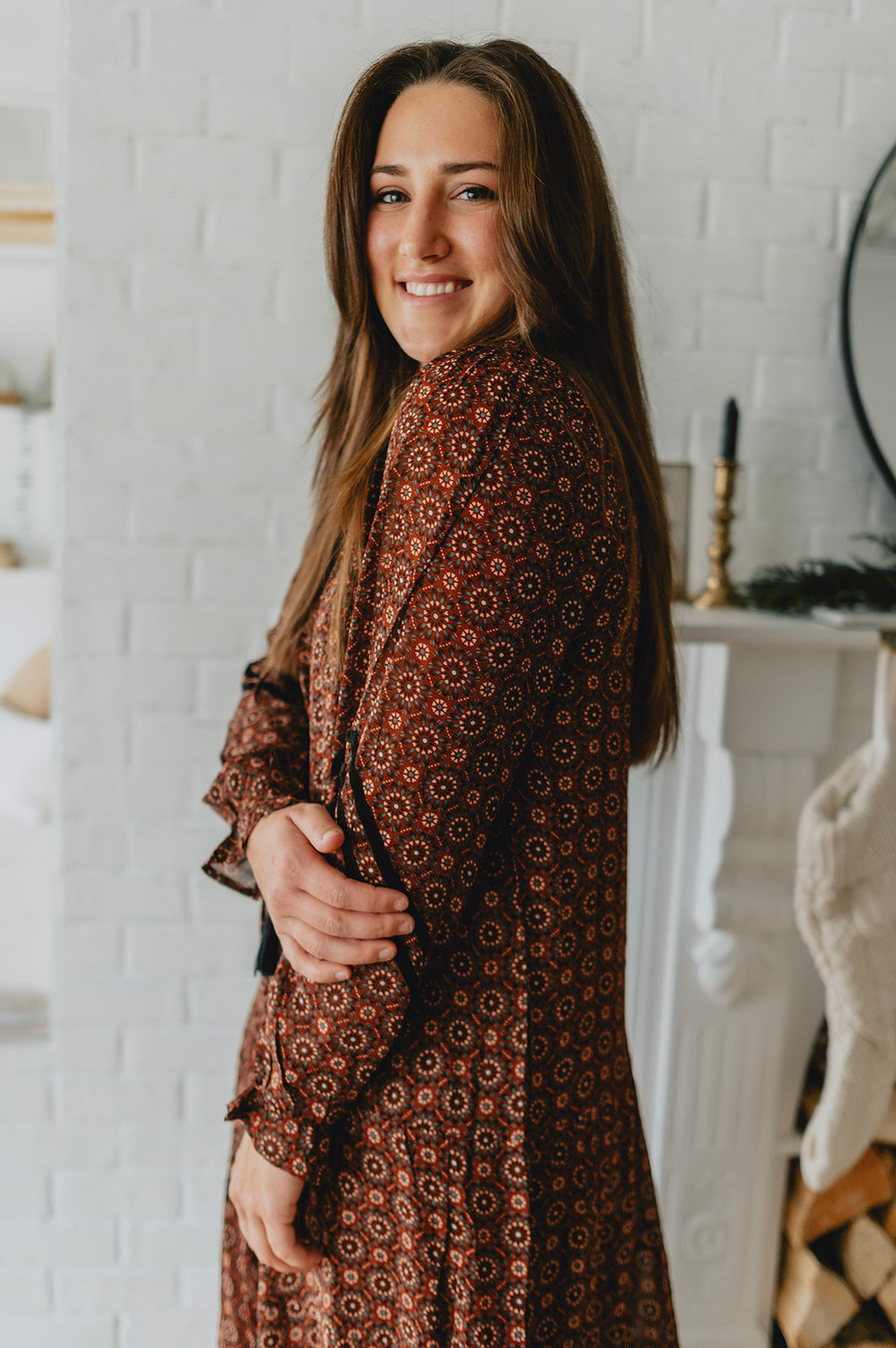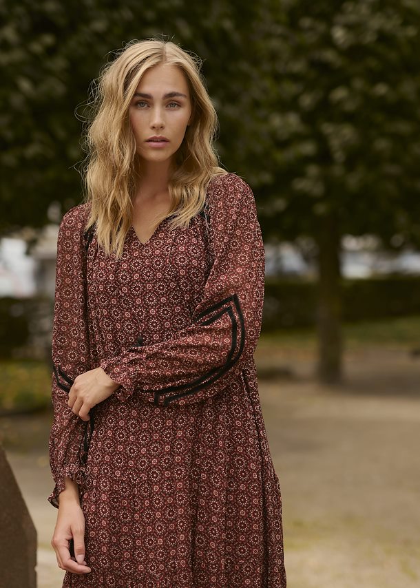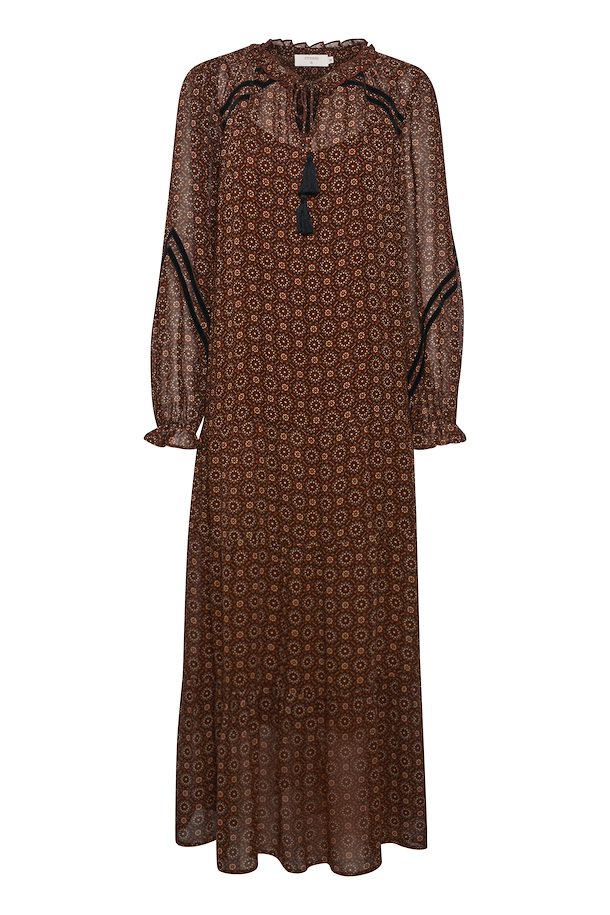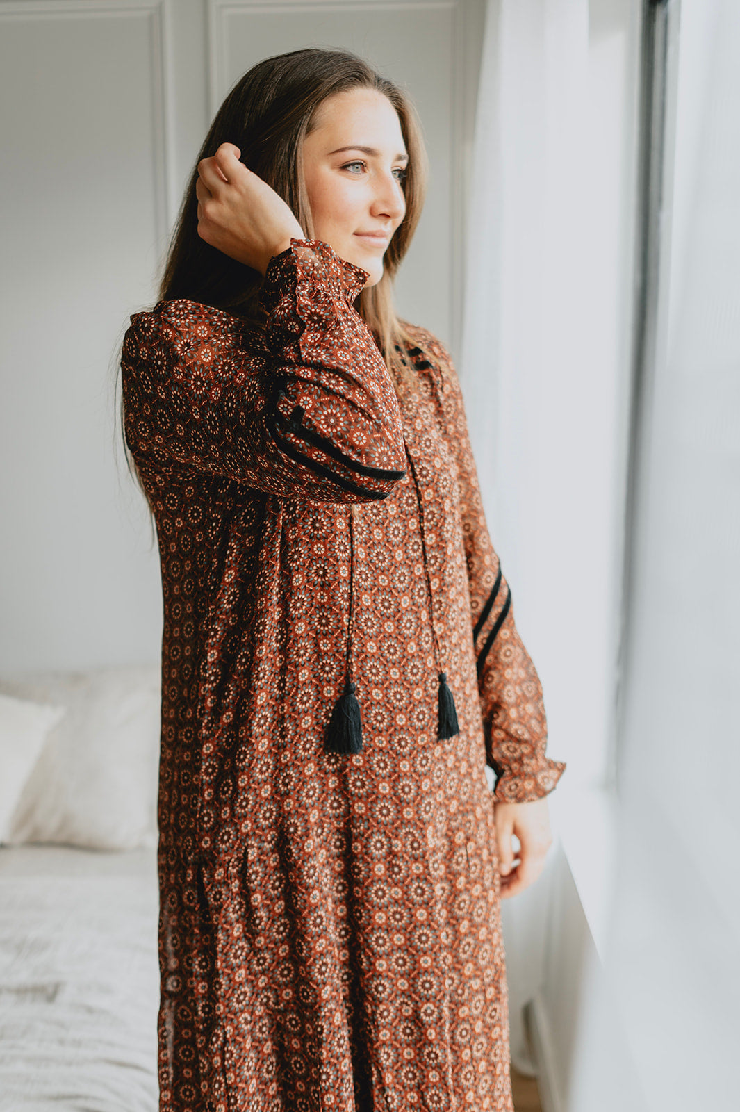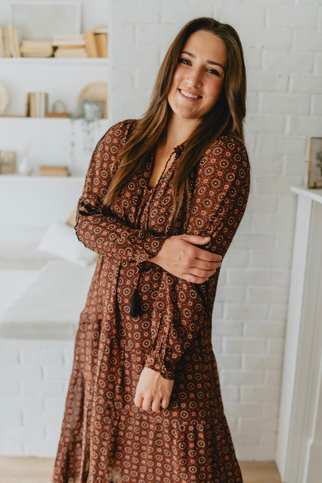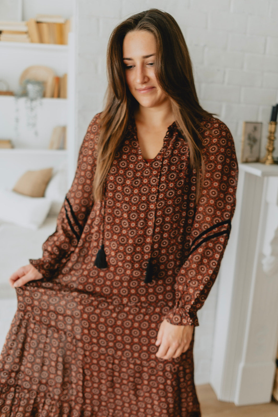 This maxi dress features a geo print on a beautiful burgundy background. Front tassels, and a flowy skirt, it's a bohemian dream. Add some black boots with it, and you can wear it this winter!
