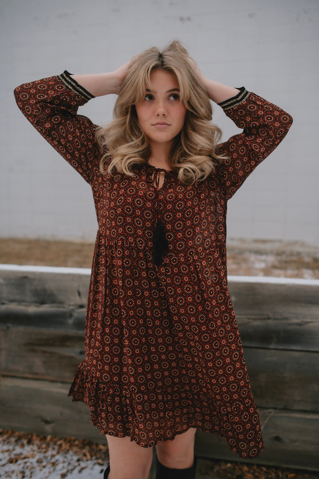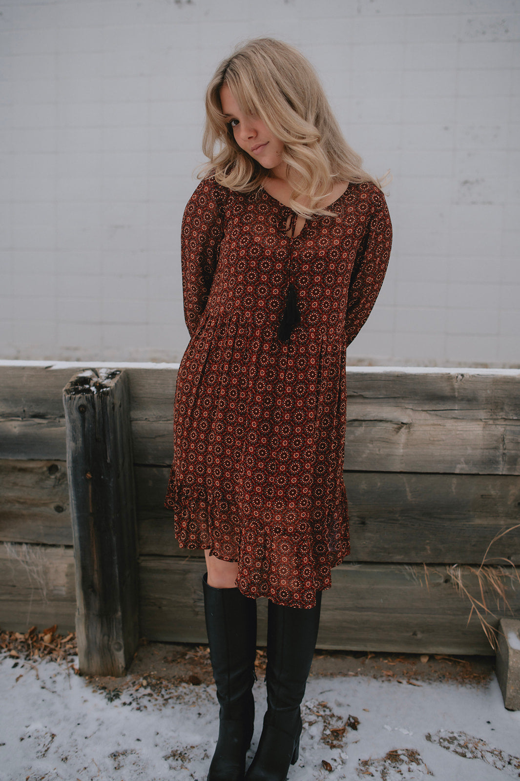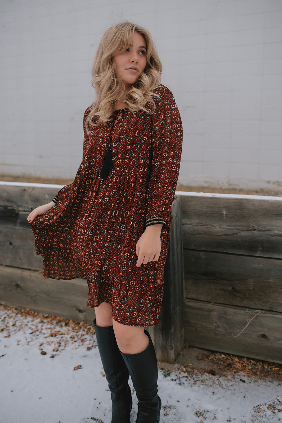 This dress has the perfect elegant boho vibes for all seasons. Pairs perfectly with a high boot and a fun jacket on cool days or with sandals and a sunhat for the warmer ones. She has a v-neck, a-line fit, ruffles and front tassel cord to customize the fit. Her 3/4 length sleeves with elastic detail elevate the fit as well.