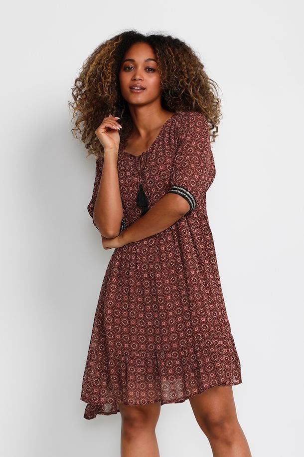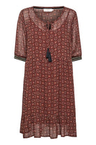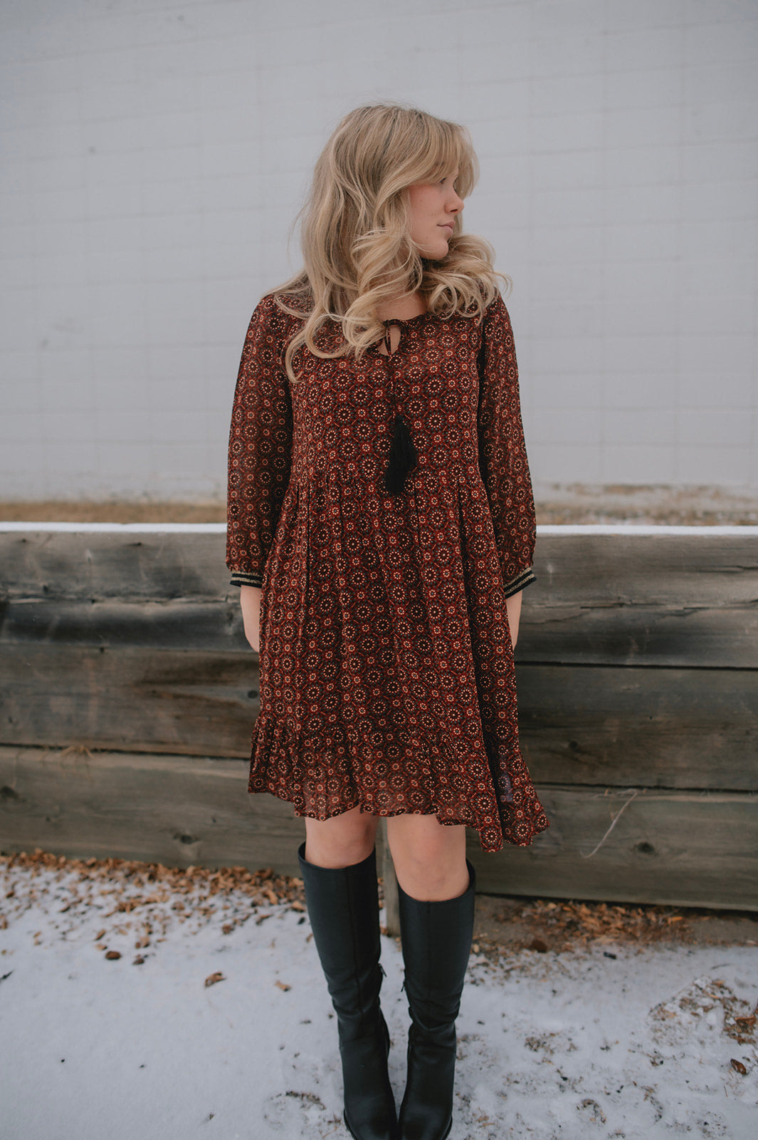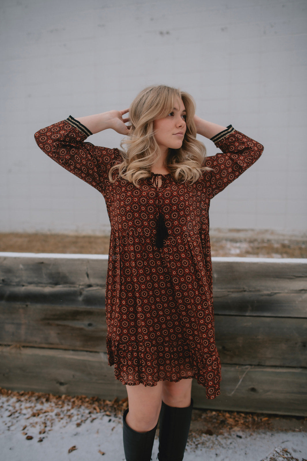 This dress has the perfect elegant boho vibes for all seasons. Pairs perfectly with a high boot and a fun jacket on cool days or with sandals and a sunhat for the warmer ones. She has a v-neck, a-line fit, ruffles and front tassel cord to customize the fit. Her 3/4 length sleeves with elastic detail elevate the fit as well.