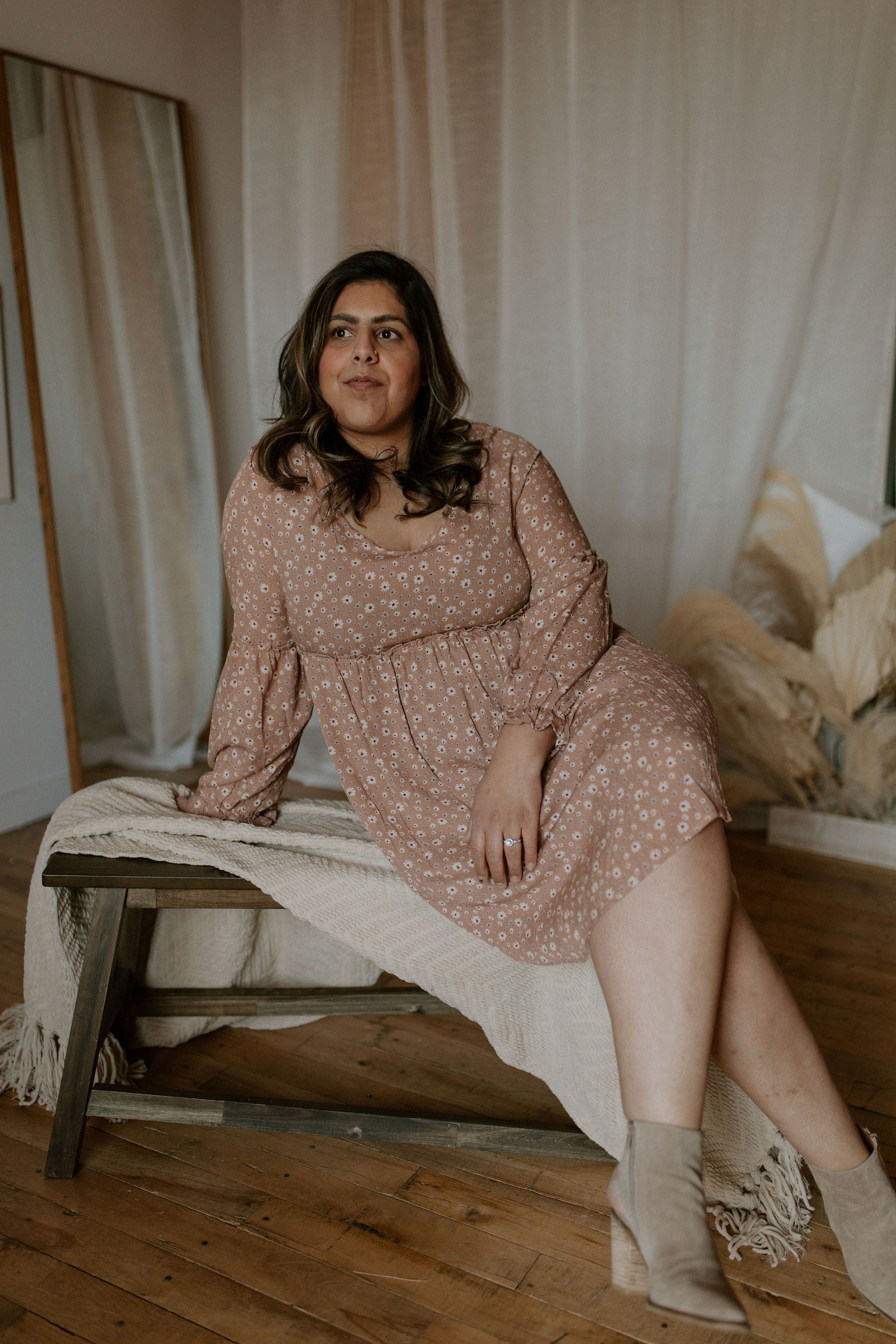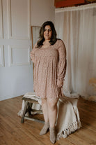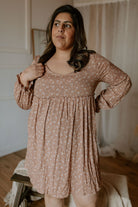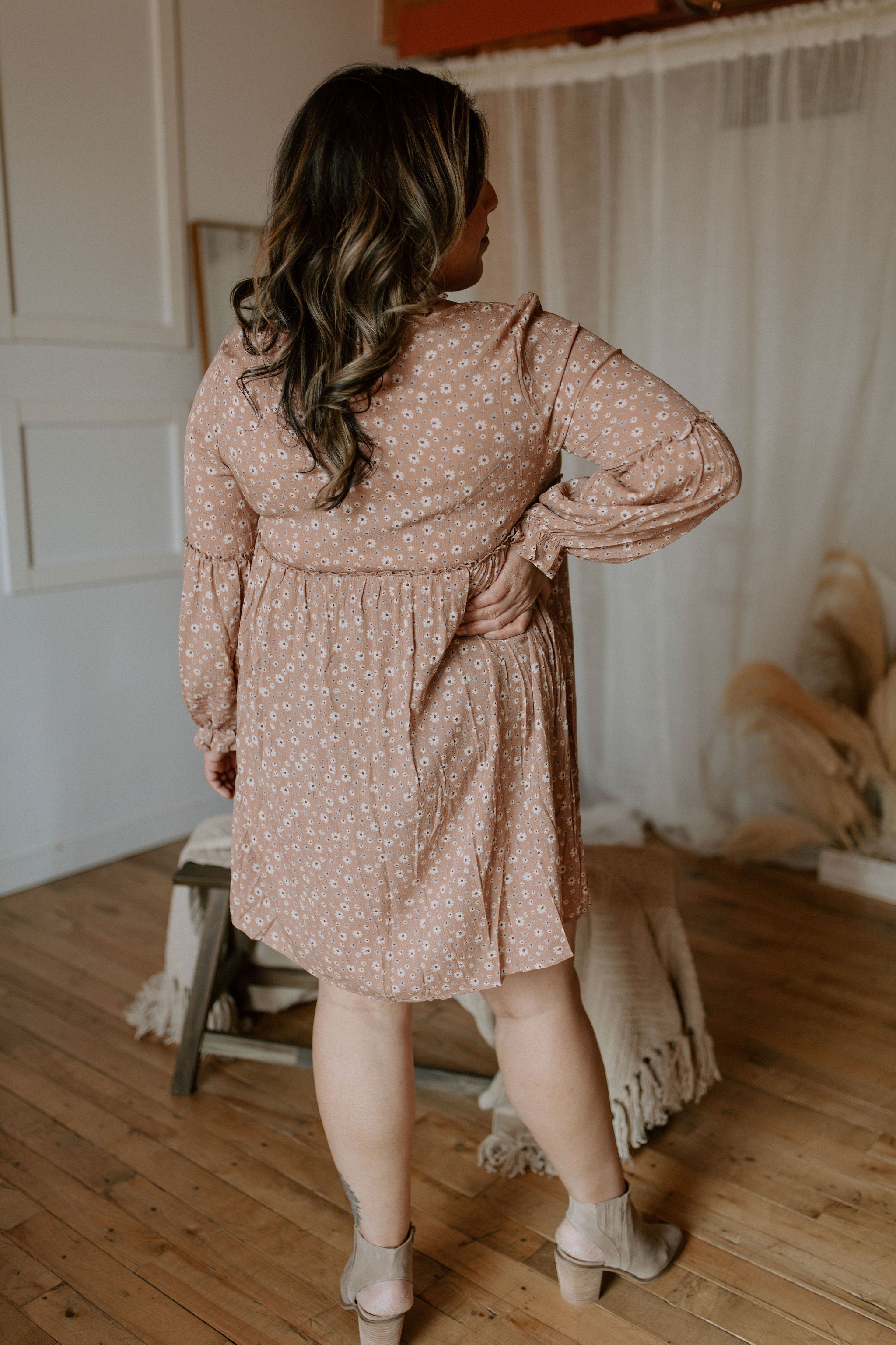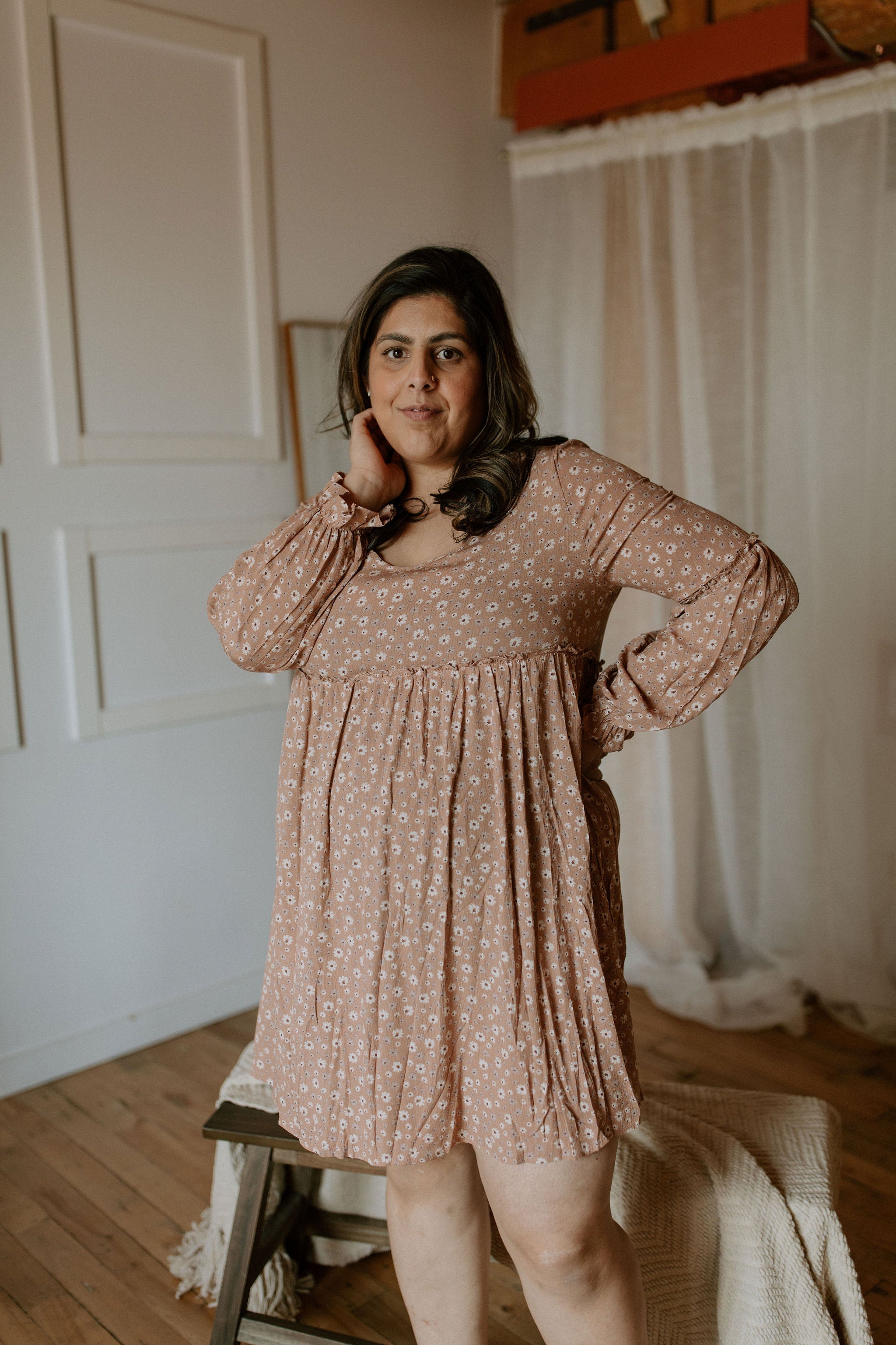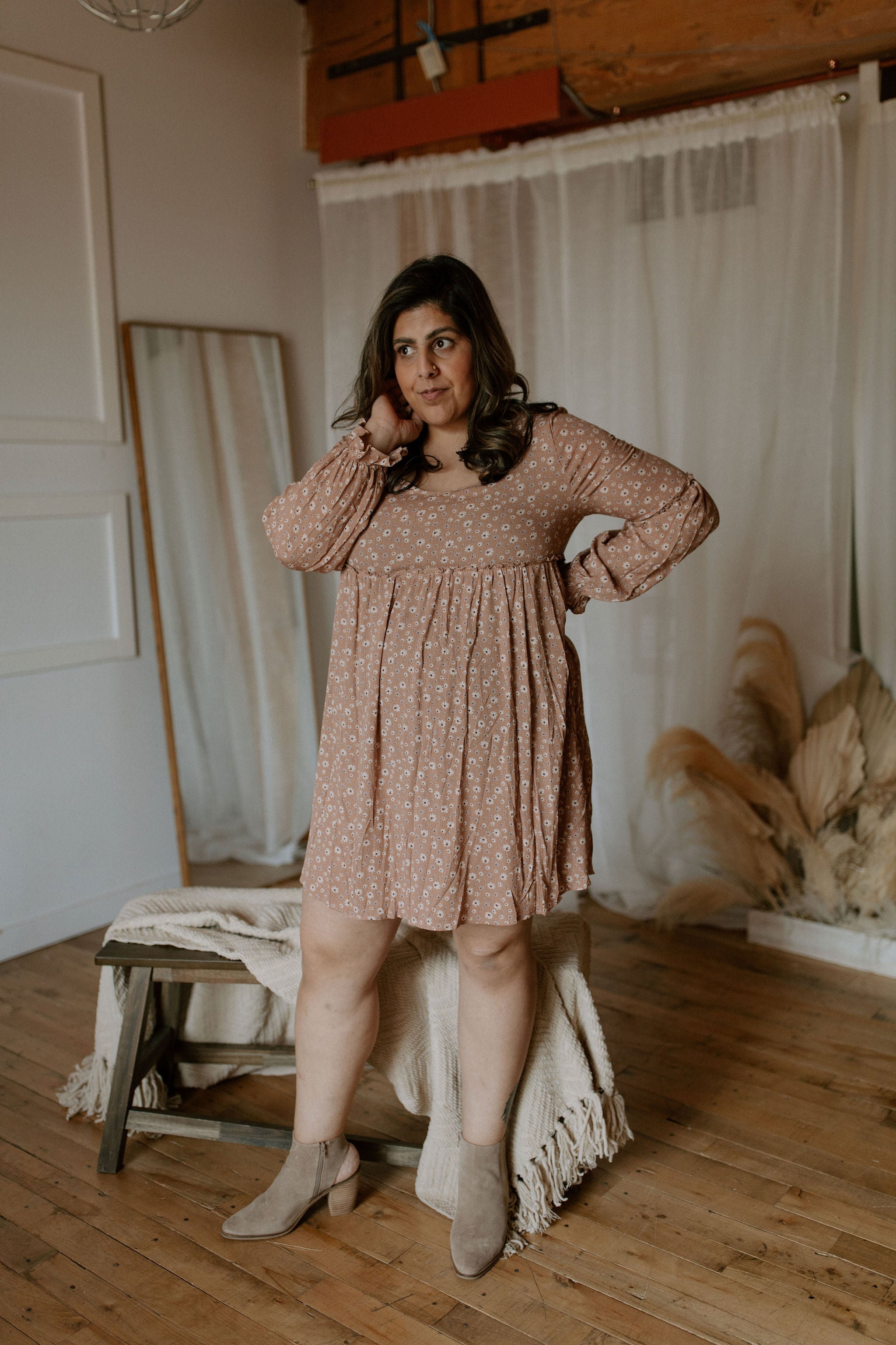 She's floral, She's pretty, She's perfect. A soft and delicate Floral mini dress, in a gorgeous muted blush rose colour. Long Sleeves, with a v-neck collar. Empire waist.