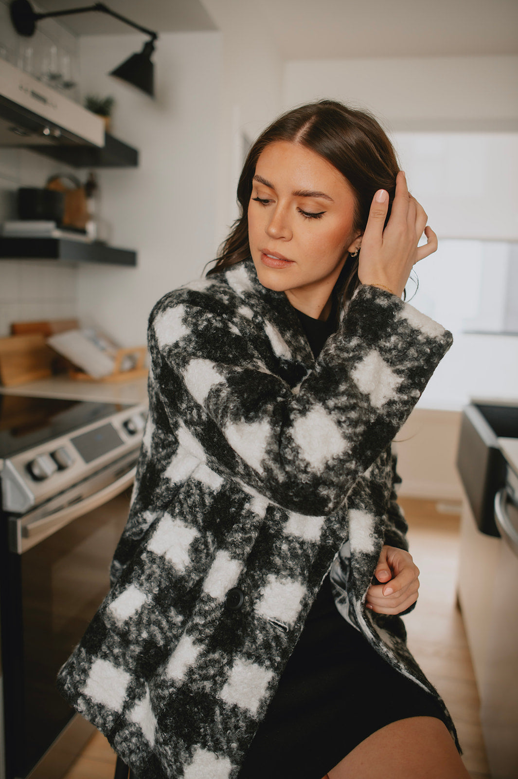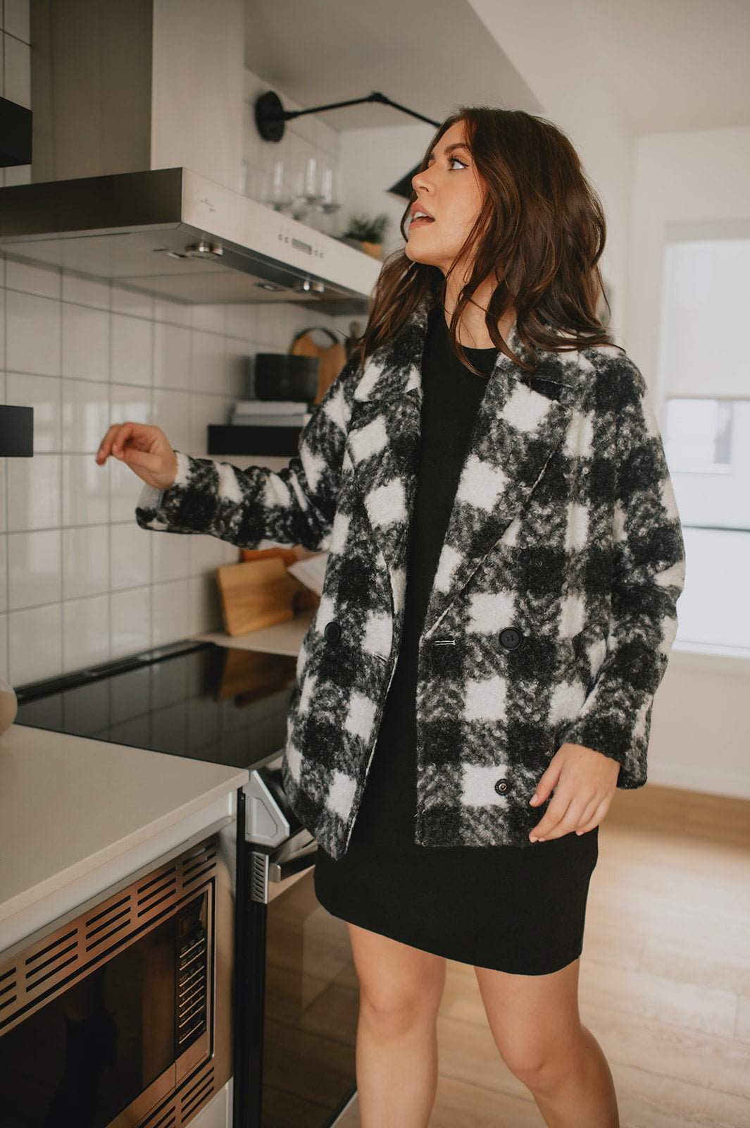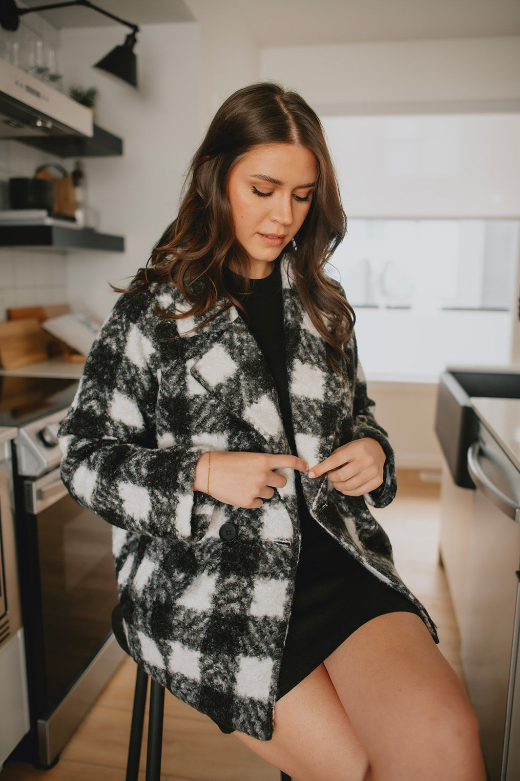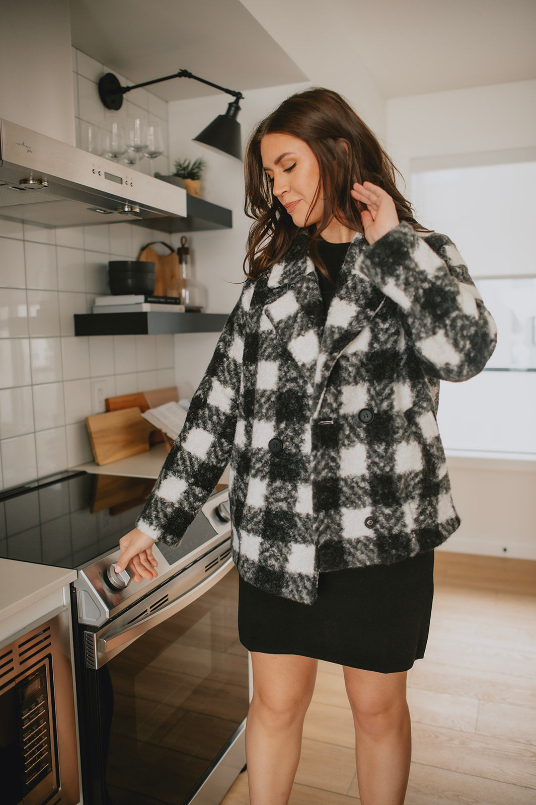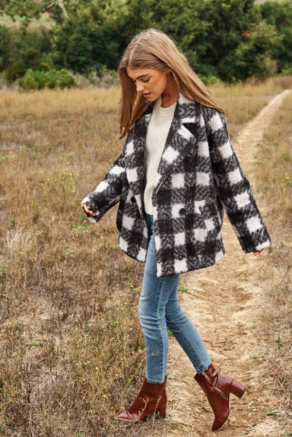 Let's face it, we wear jacket 90% of the year and this one is one you'll wear a LOT! She's unstructured which gives her more of a big sweater feel, and the bright buffalo check keeps her cheeky. Hits right at the hip and the double breasted fit helps give some shape. We love her and will be adding her to the rotation asap!