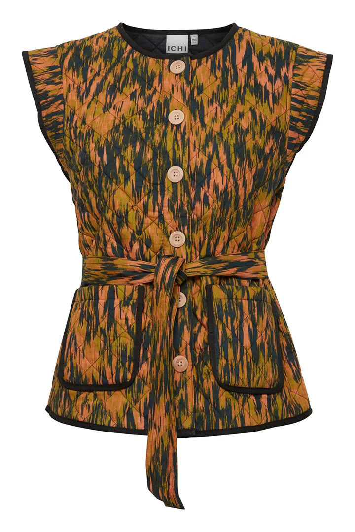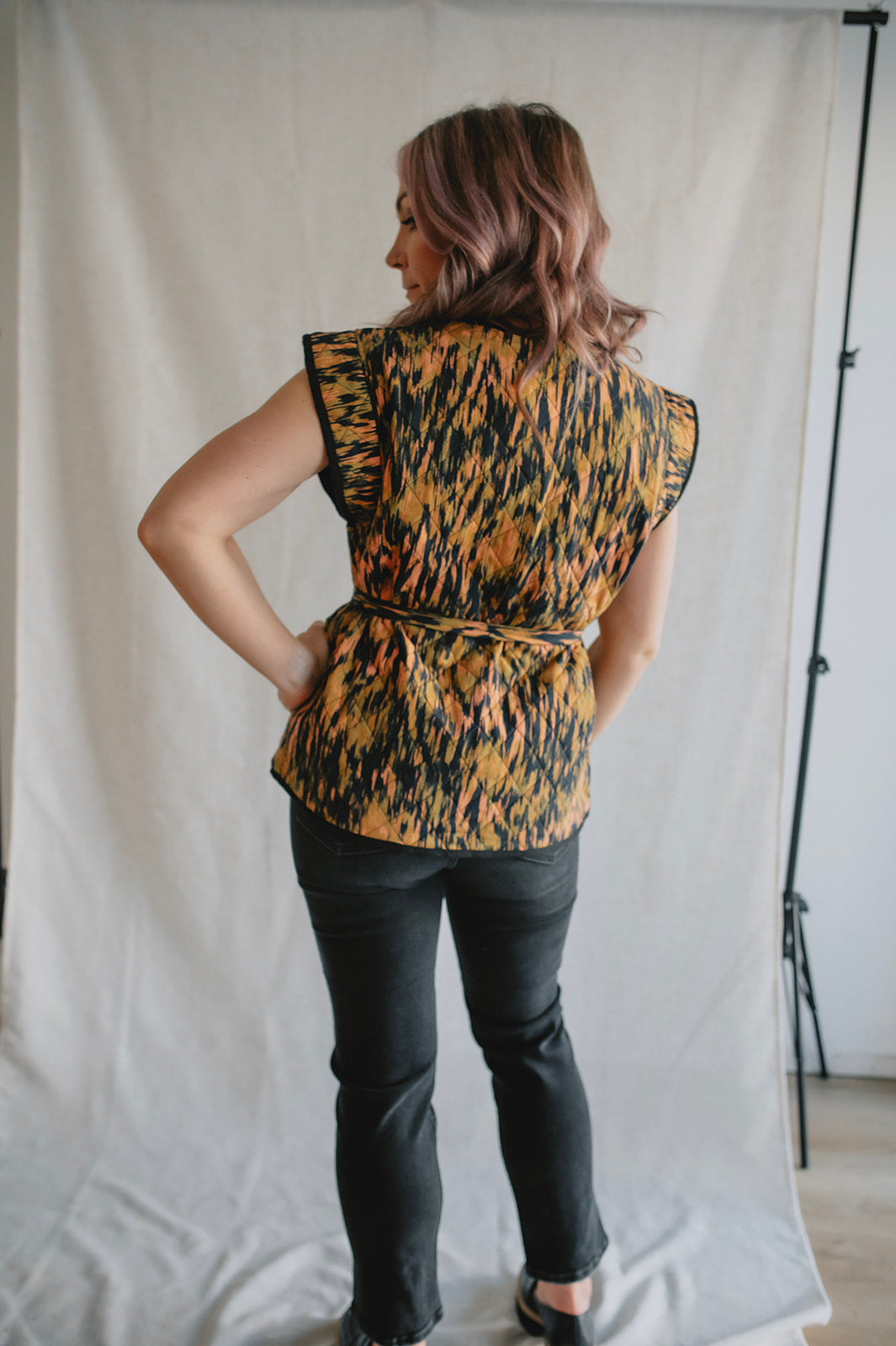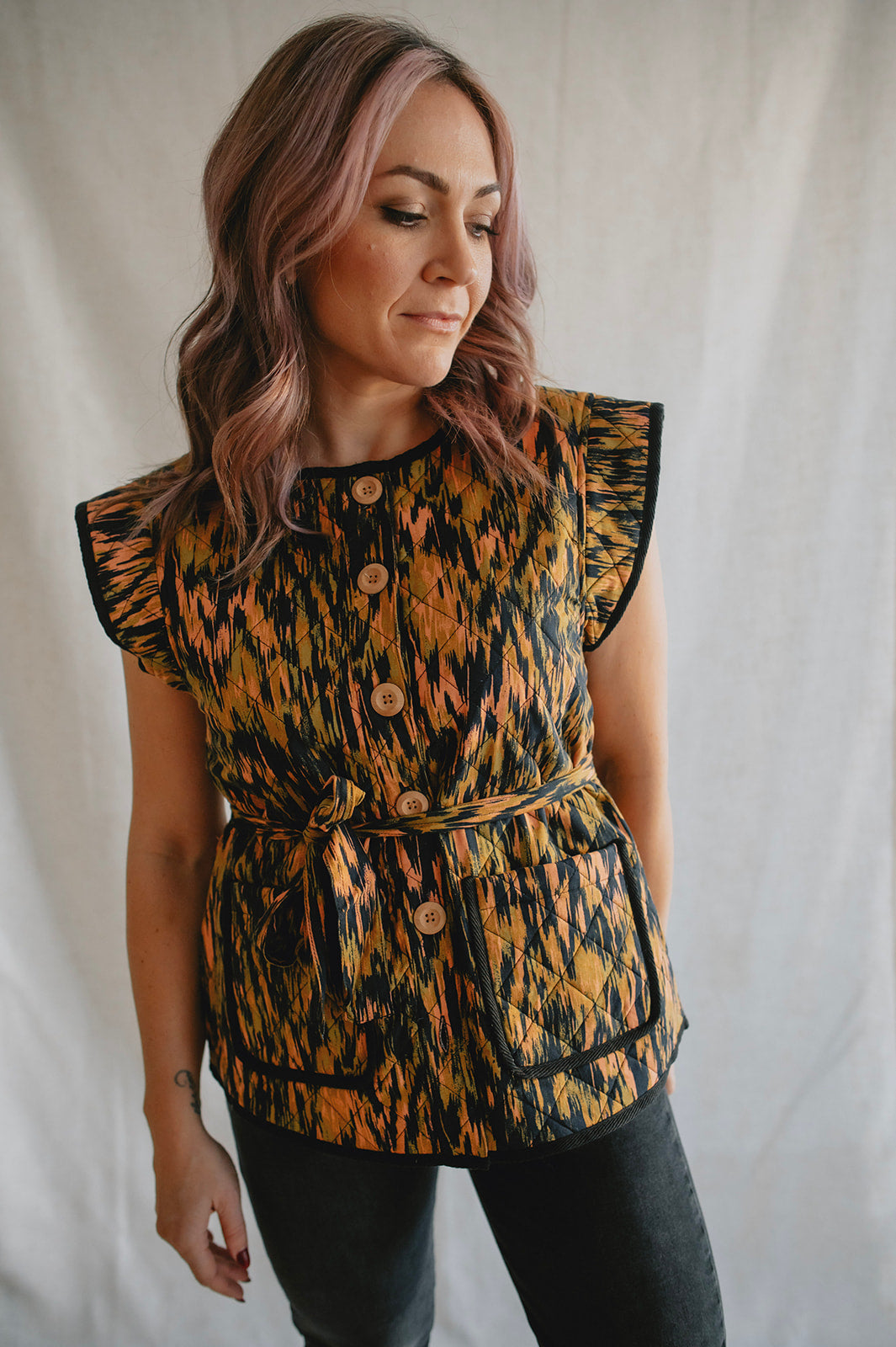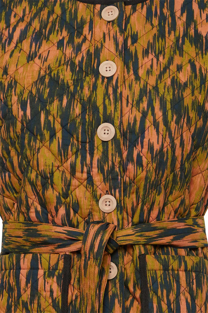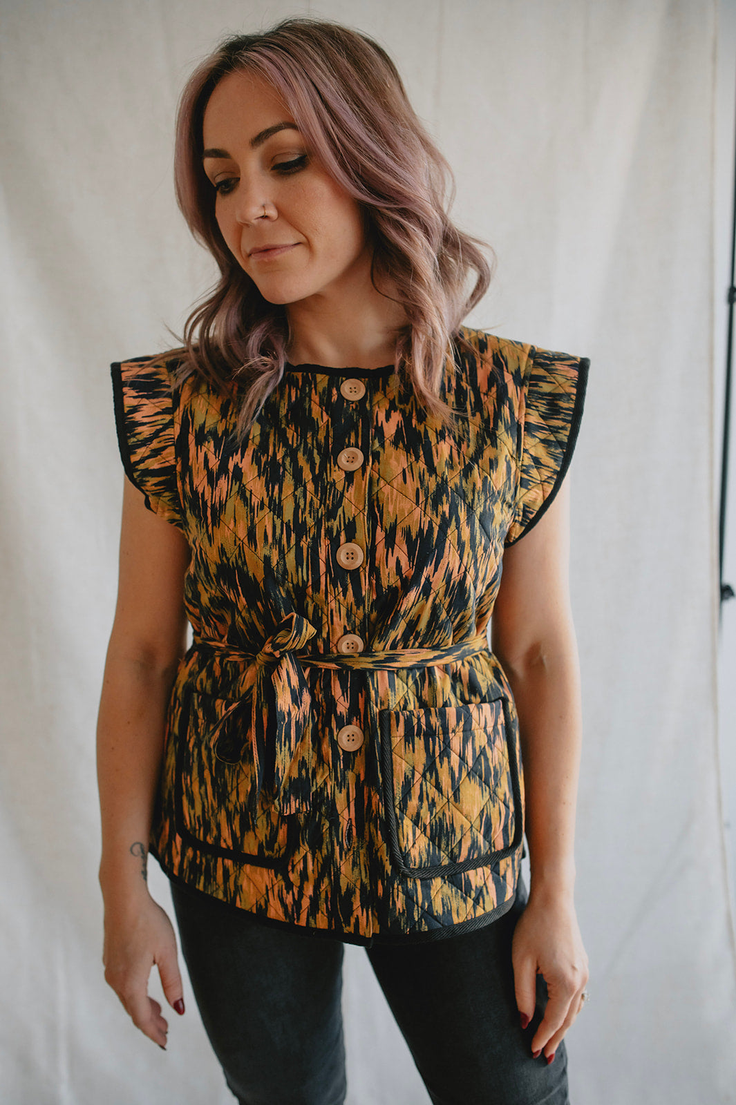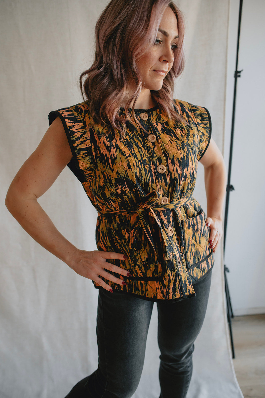 This Leonardie Waistcoat is the perfect layering piece for any wardrobe. Crafted with light quilting and an eye-catching abstract print, it is designed to fit any occasion using cream buttons, navy cotton trim, and a tie waist. Elevate your look today!.